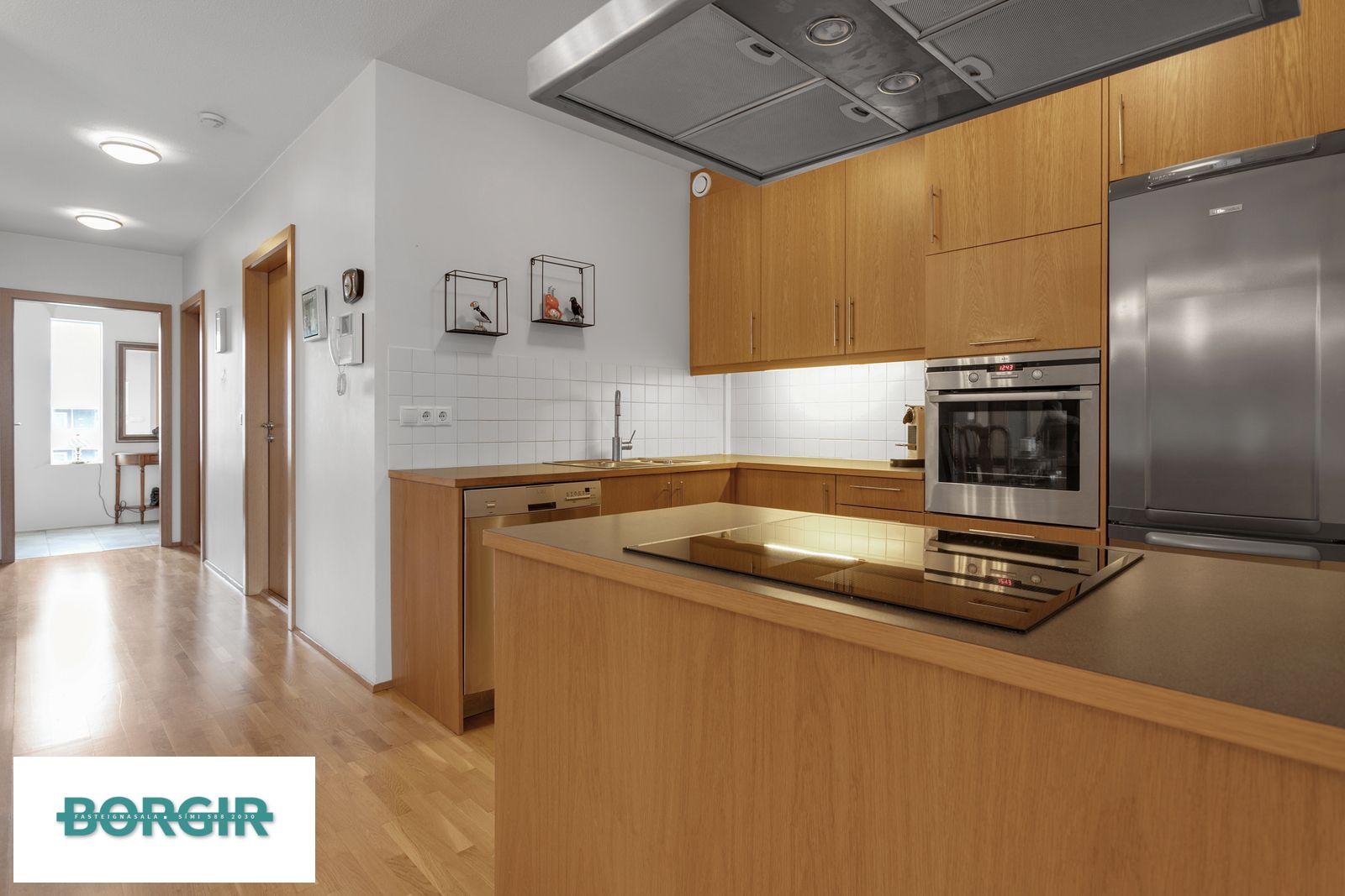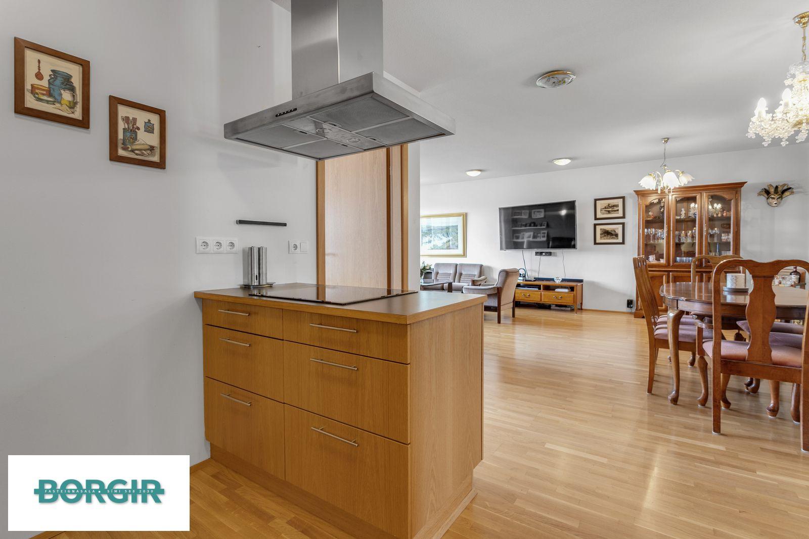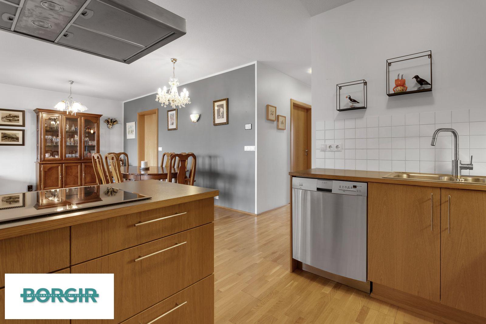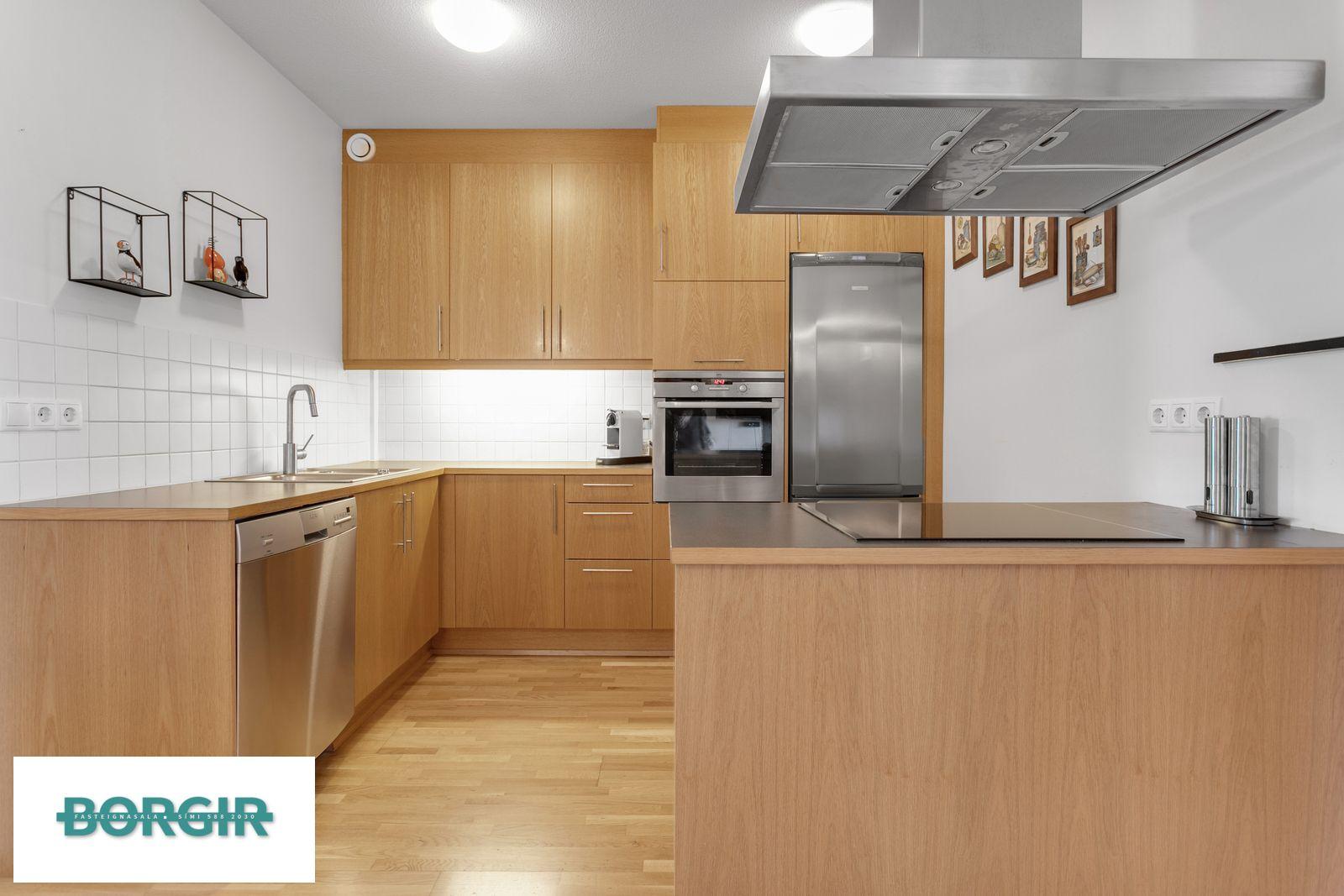 Í eldhúsi er rúmgóð innrétting frá Gks með ofn í vinnuhæð. Tengi fyrir uppþvottavél. Span helluborð og háfur.