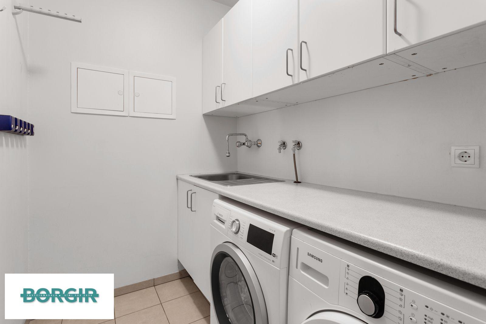 Þvottahús innan íbúðar með rúmgóðri innréttingu, vask og efri skápum. Pláss fyrir bæði þvottavél og þurrkara.