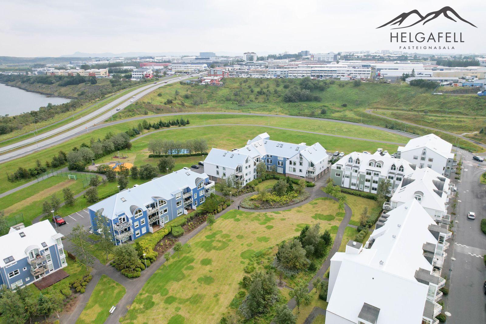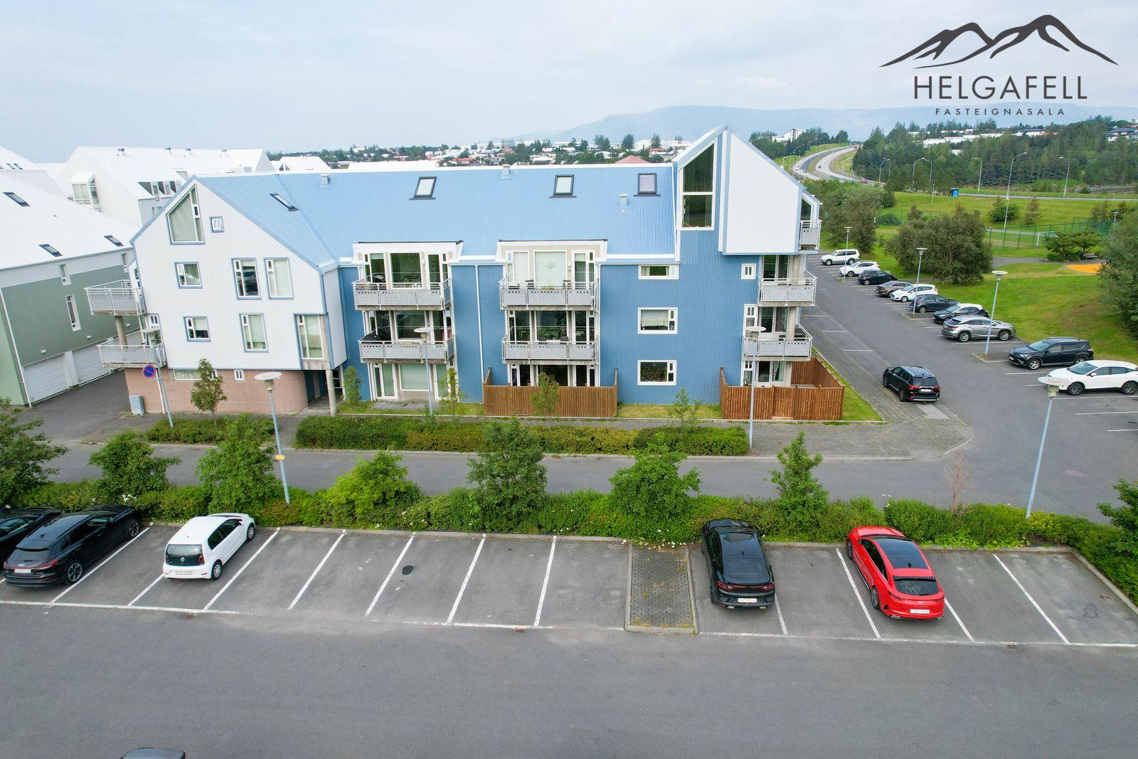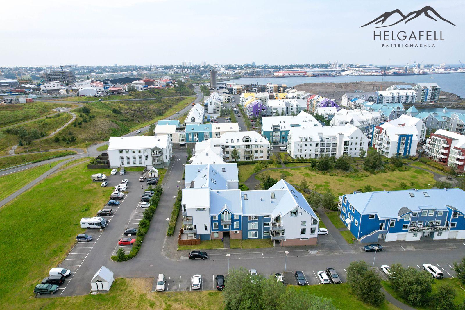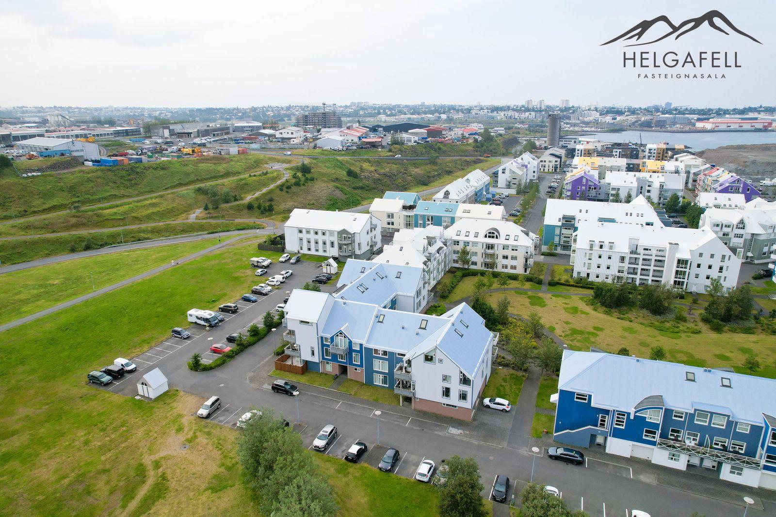 Lóðin: Sameiginleg 1806 fm. lóð. Aðgengi að húsinu er mjög gott og á henni eru 37 sameiginleg bílastæði, þ.a. tvö bílastæði fyrir fatlaða. Íbúðinni fylgir hlutdeild í sameiginlegum skrúðgarði að Evrópskri fyrirmynd sem er í skjólinu á milli húsanna en þar er gras, tré og göngustígar.