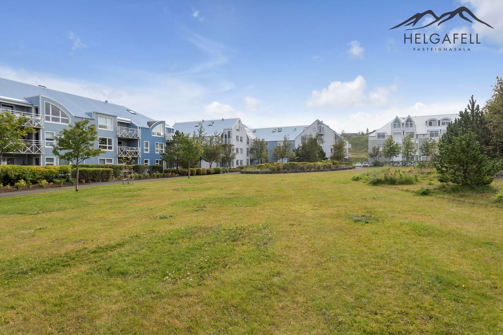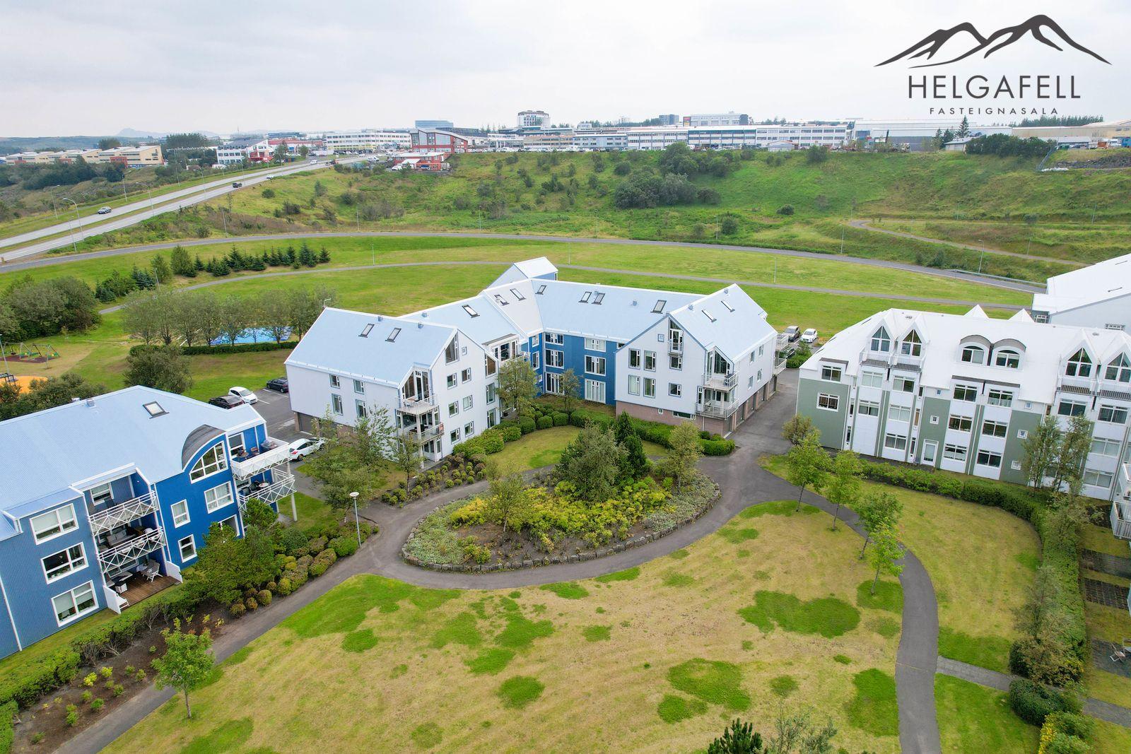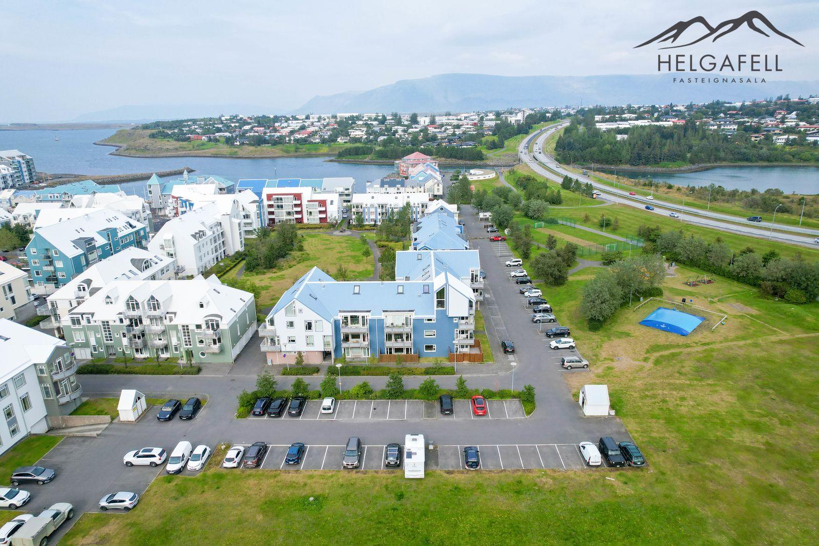 Lóðin: Sameiginleg 1806 fm. lóð. Aðgengi að húsinu er mjög gott og á henni eru 37 sameiginleg bílastæði, þ.a. tvö bílastæði fyrir fatlaða. Íbúðinni fylgir hlutdeild í sameiginlegum skrúðgarði að Evrópskri fyrirmynd sem er í skjólinu á milli húsanna en þar er gras, tré og göngustígar.