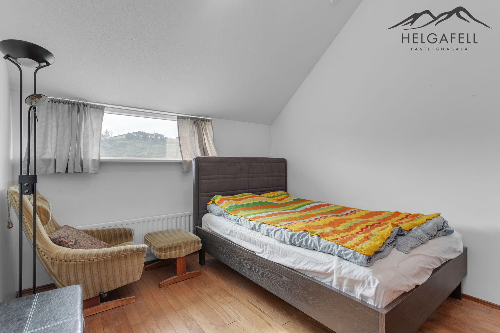 Hjónaherbergi: Rúmgott, góðir fataskápar, parket á gólfi.