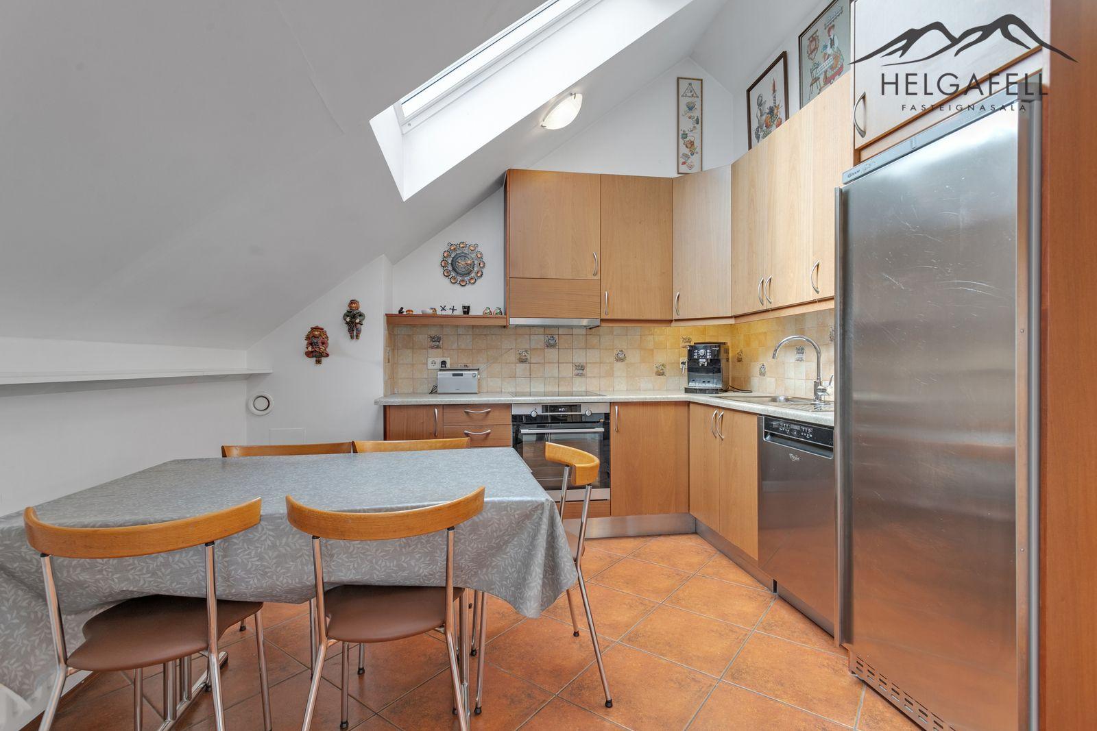 Eldhús: Í alrými á efri hæð, mikil lofthæð, borðkrókur, góð innrétting, bakaraofn, helluborð, flísar milli skápa, flísar á gólfi.