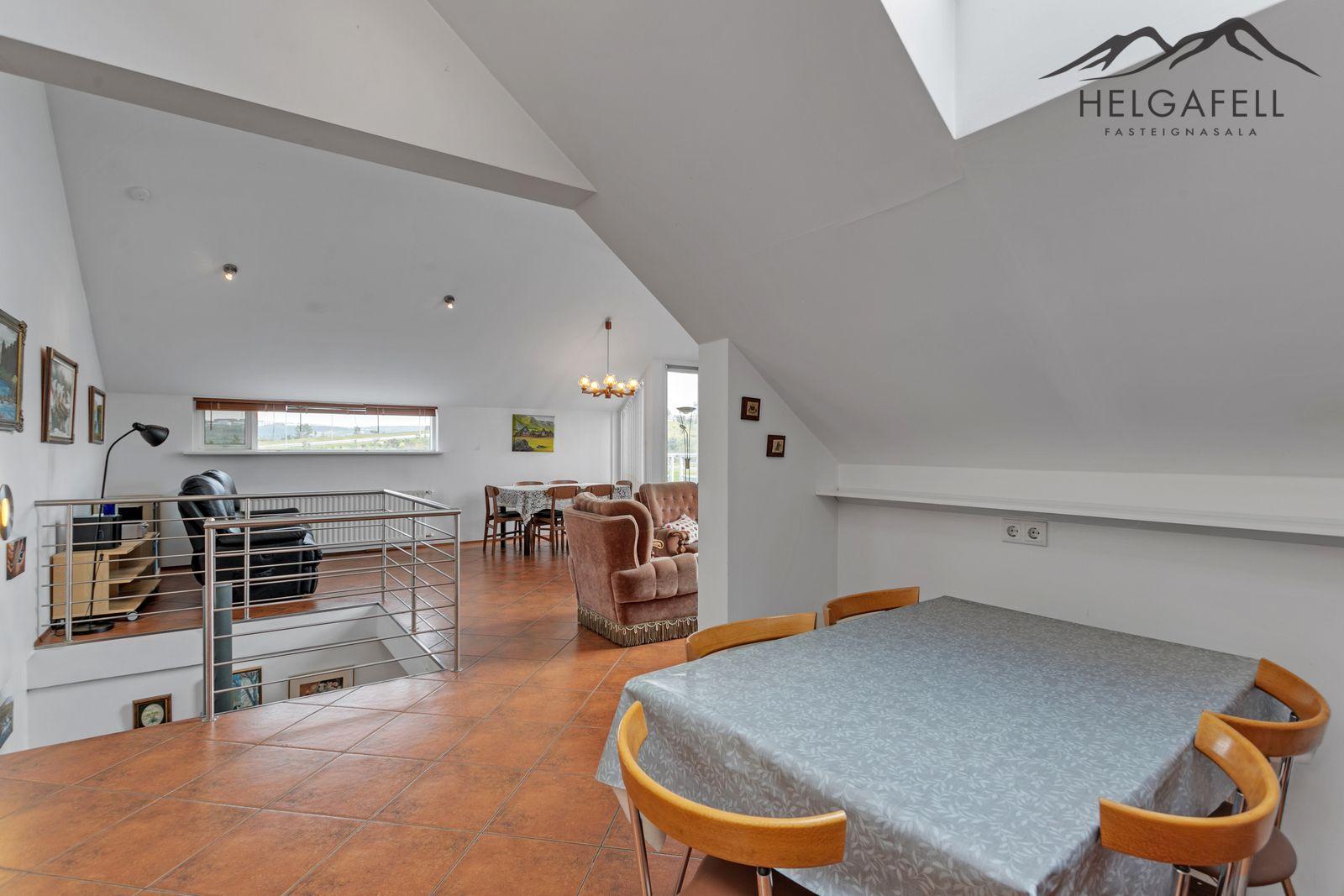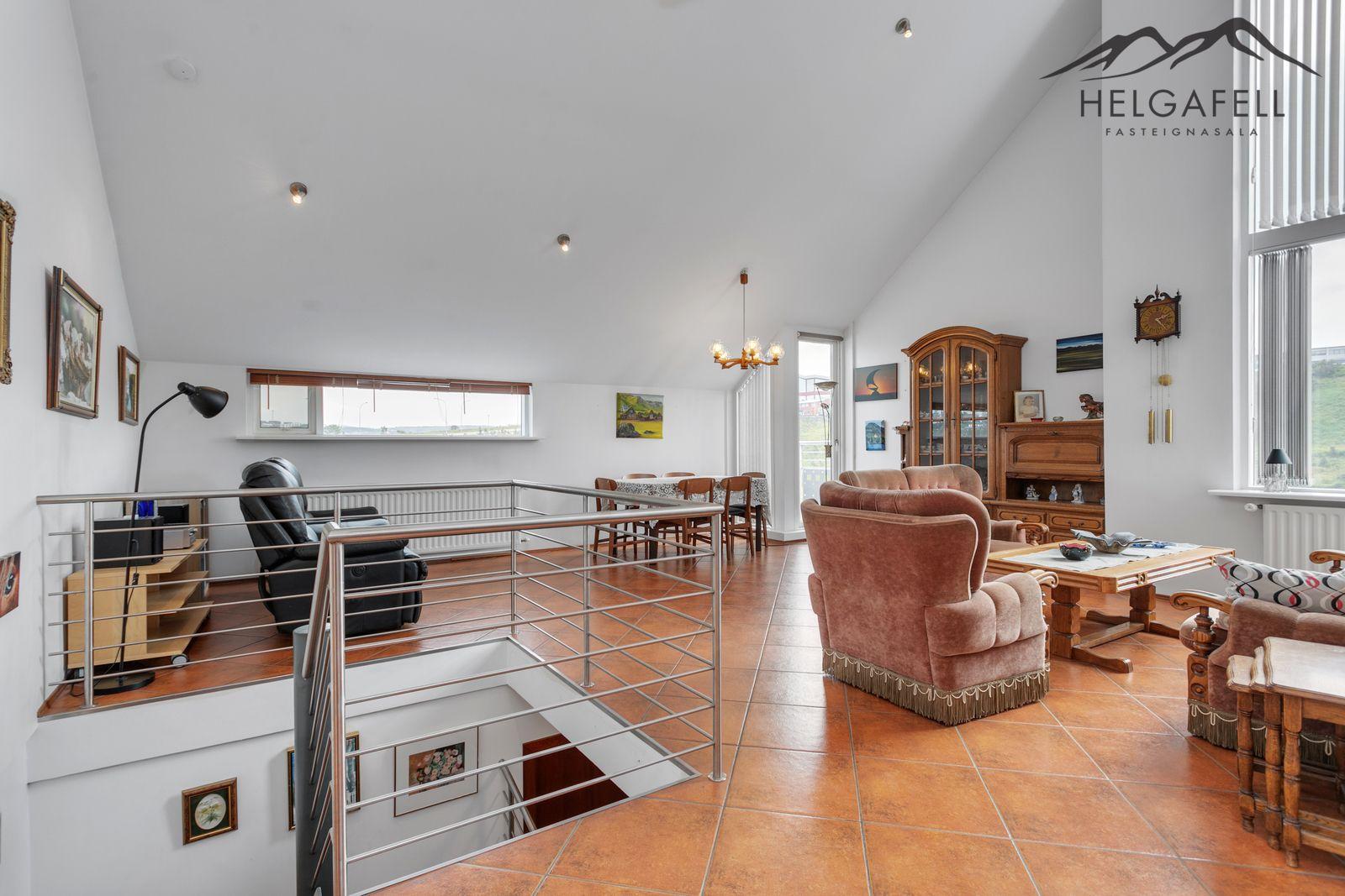 Stofa / borðstofa / sjónvarpskrókur: Í alrými á efri hæð, mikil lofthæð, björt og rúmgóð, útgengi út á suðuraustur svalir, flísar á gólfi.