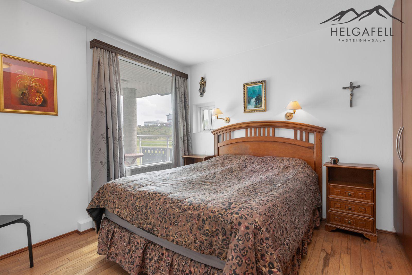 Svefnherbergi 2: Rúmgott, útgengi út á flíslagðar suðaustur svalir, parket á gólfi.