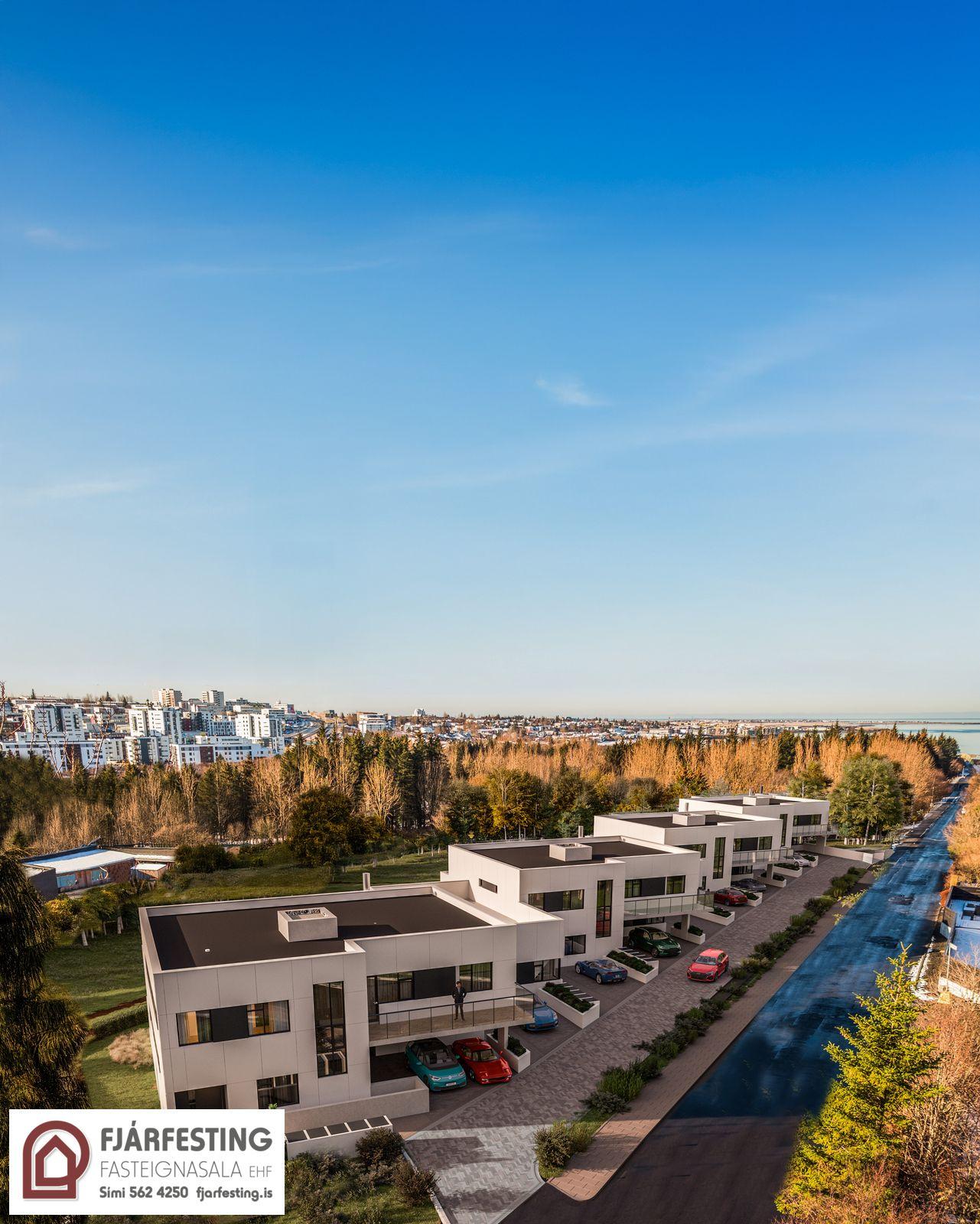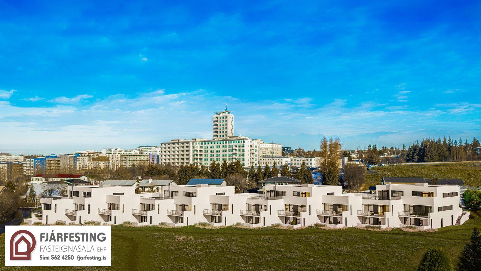 FJÁRFESTING FASTEIGNASALA, SÍMI 562-4250, ER MEÐ TIL SÖLU STÓRGLÆSILEGA 5 HERB. ÍBÚÐ (HÁLFGERT RAÐHÚS) Á TVEIMUR HÆÐUM Í NÝJU TENGIHÚSI VIÐ FOSSVOGSVEG 8-34 Í REYKJAVÍK. STÆÐI Í LOKAÐRI BÍLAGEYMSLU FYLGIR ÍBÚÐINNI.Glæsileg og vel skipulögð