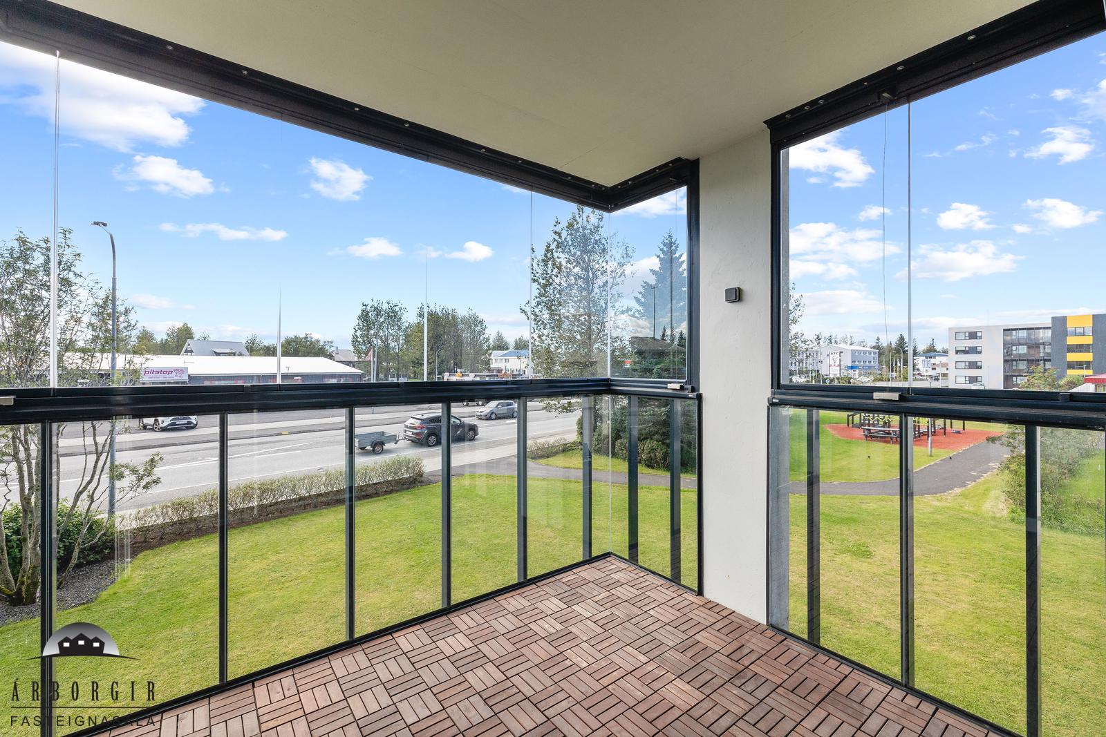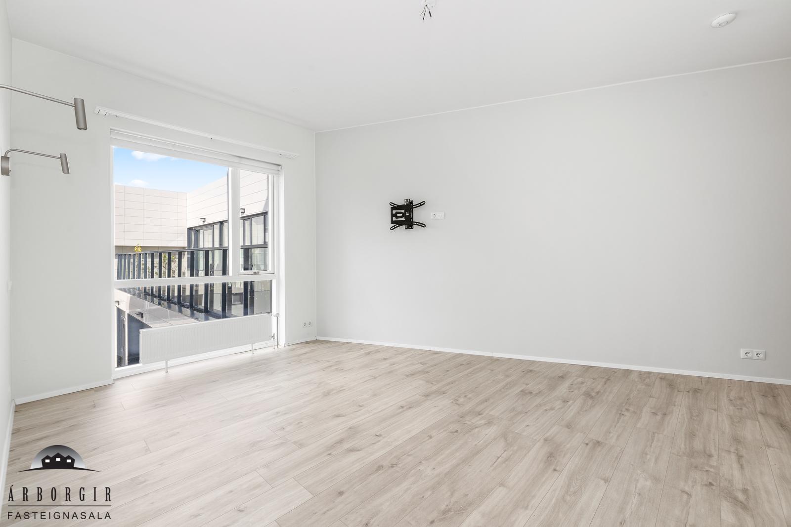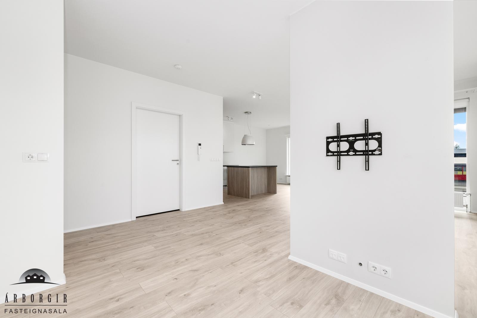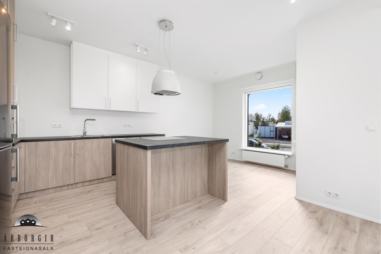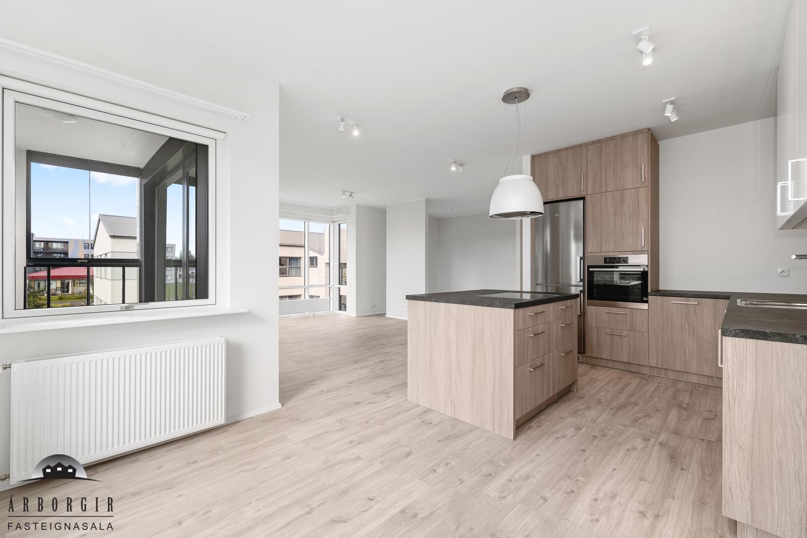 Stofa og eldhús eru í opnu rými,parket er á gólfi. Í eldhúsi er vönduð innrétting með rúmgóðri eyju og í stofu er útgengt á yfirbyggðar svalir.