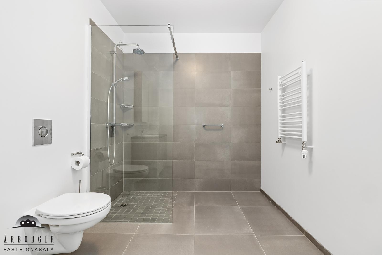 Baðherbergi er mjög rúmgott, flísar eru á gólfi og hluta veggja en þar er góð innrétting og stór gólfsturta.