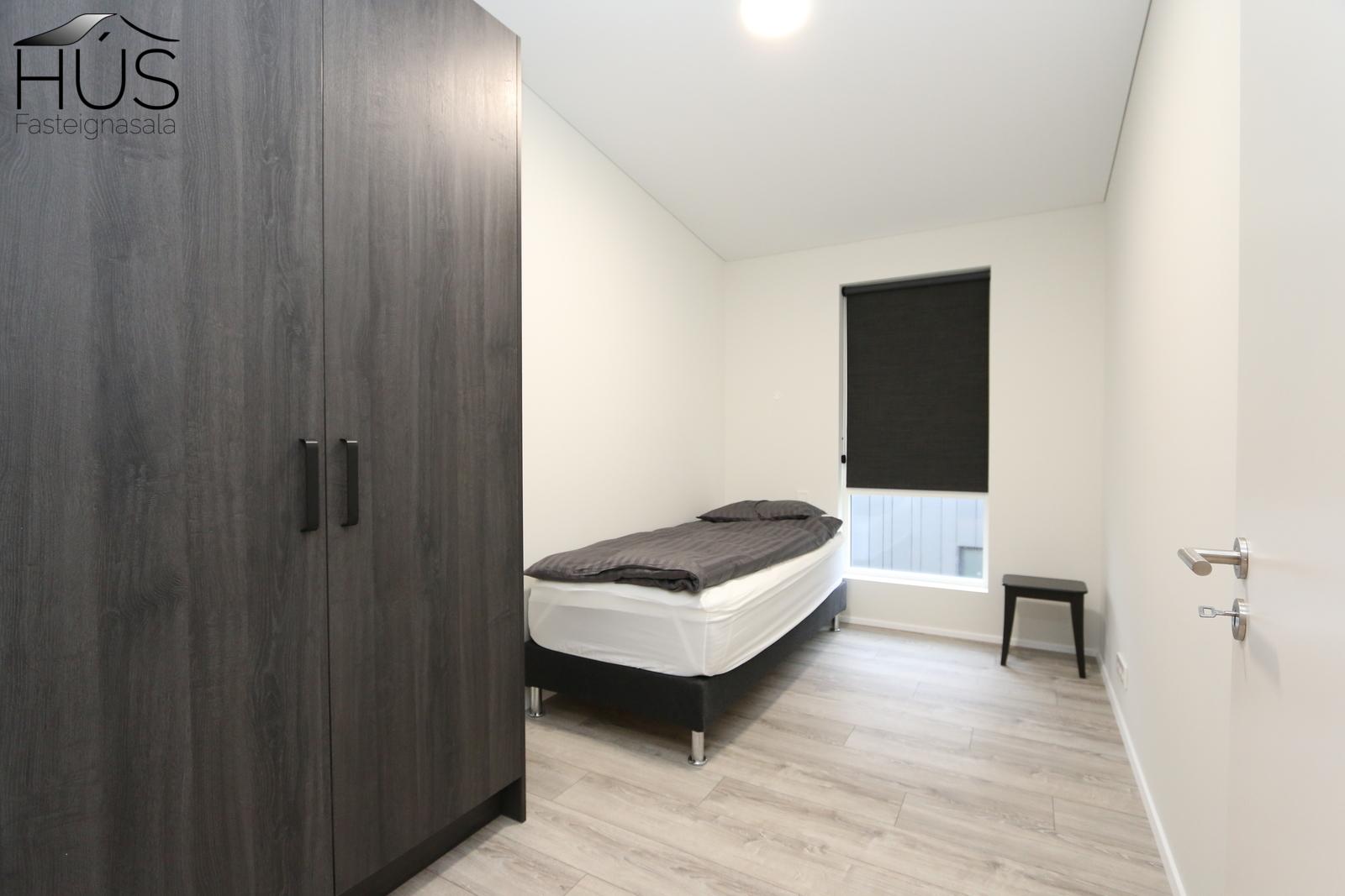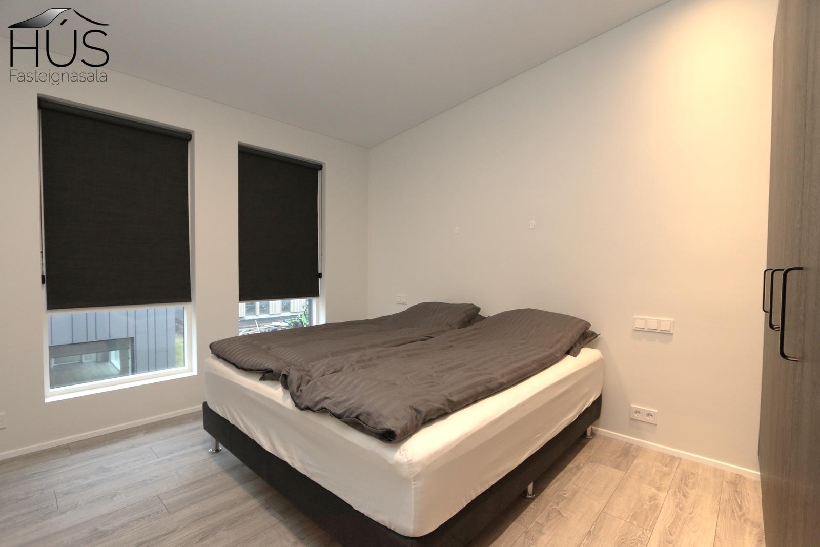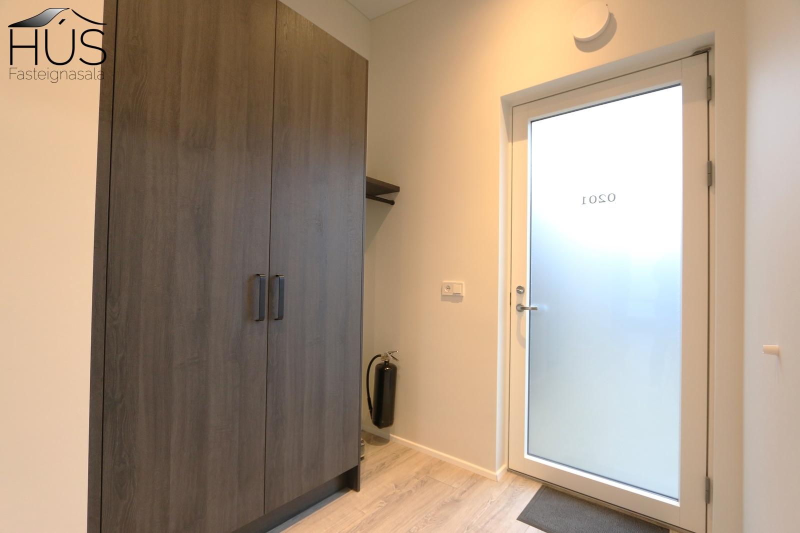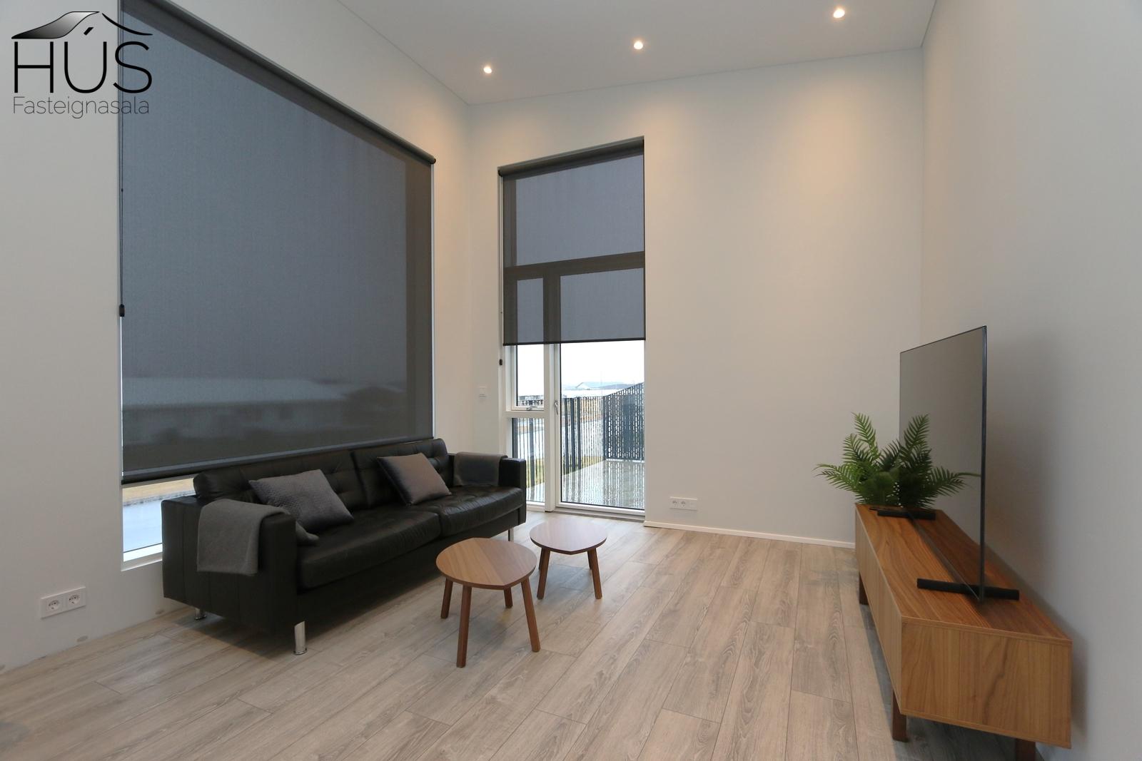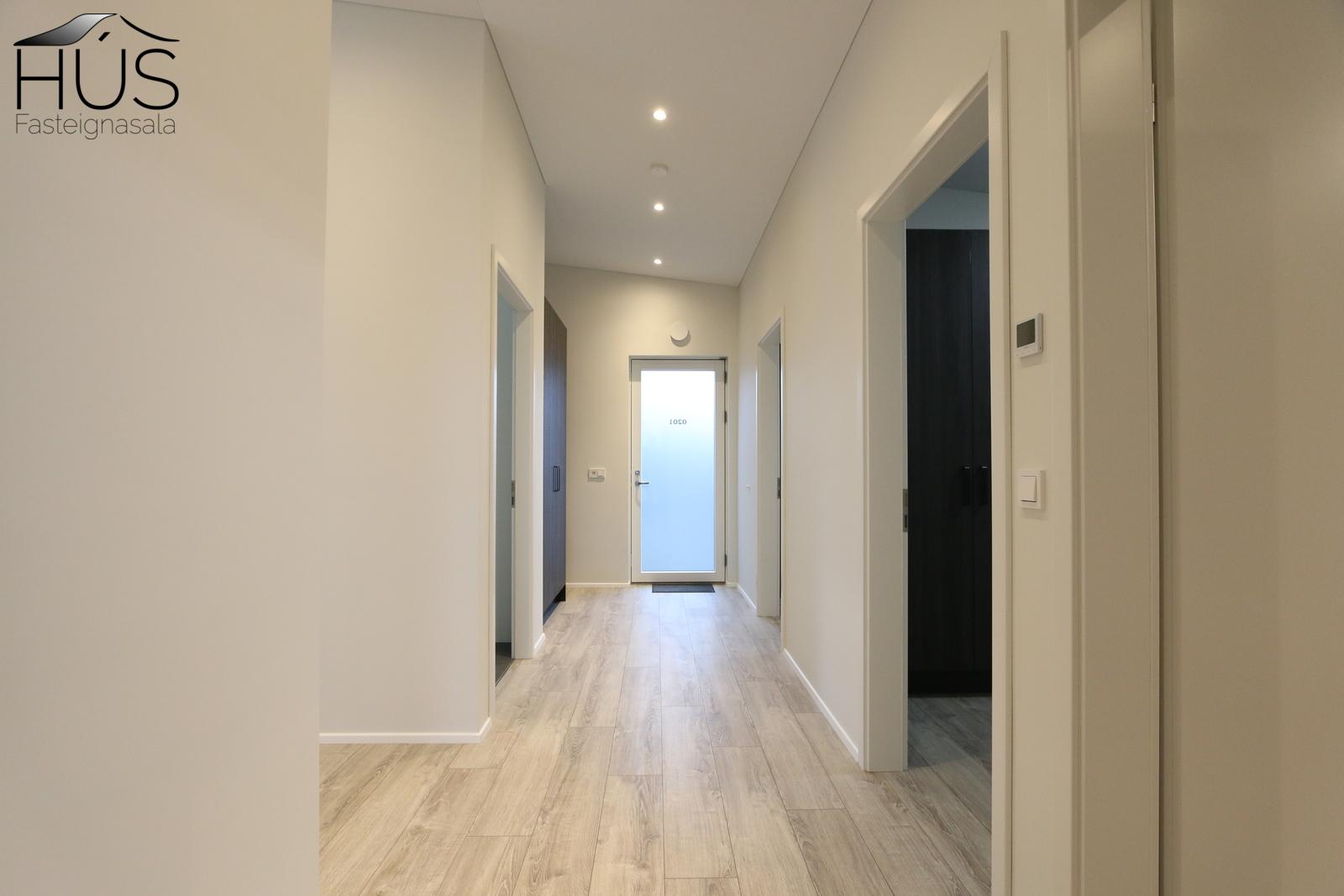Rúmgóð forstofa með innbyggðum fataskáp, gangur með parketi á gólfi, þrjú svefnherbergi með parketi á gólfi öll með fataskápum. Rúmgott baðherbergi flísalagt í hólf og gólf, handklæðaofn, innrétting, speglaskápur og "walk inn" sturta með innbyggðum blöndunartækjum. Flísalagt þvottahús með innréttingu sem gerir ráð fyrir þvottavél/þurrkara í vinnuhæð. Sérsmíðuð elhúsinnrétting frá Voké-III. Ljúflokur á öllum skúffum og skápum ásamt innbyggðri ledlýsingu sem er undir efri skápum í eldhúsi. Heimilistæki frá AEG. Stofa, borðstofa og eldhús eru í opnu og björtu rými þar sem útgengt er út á svalir. Á svölum er skjólveggur og svalahandrið er polýhúðað stál.