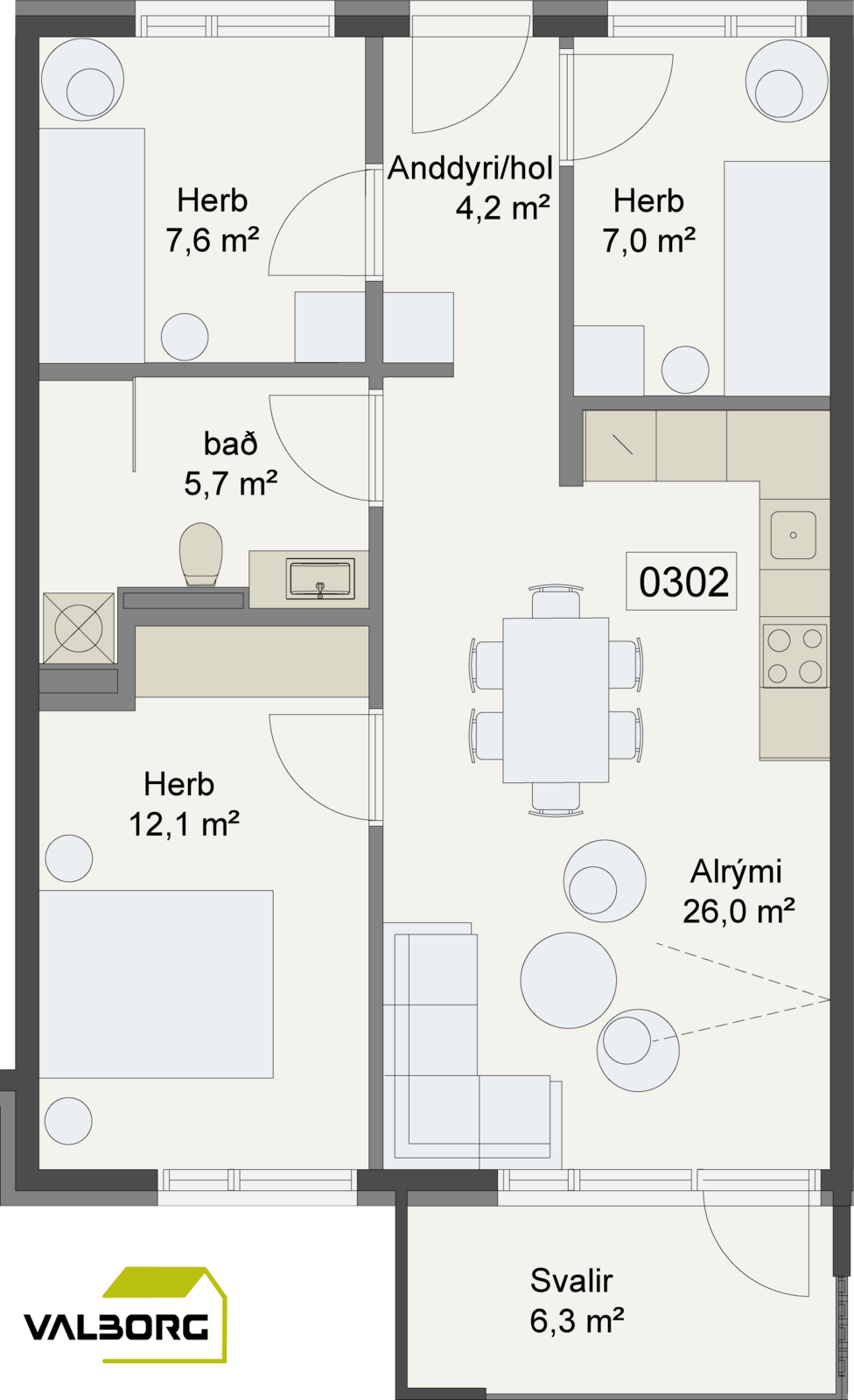 Alrými: eldhús og stofa eru saman í opnu rými og þar er útgengt á svalir.
