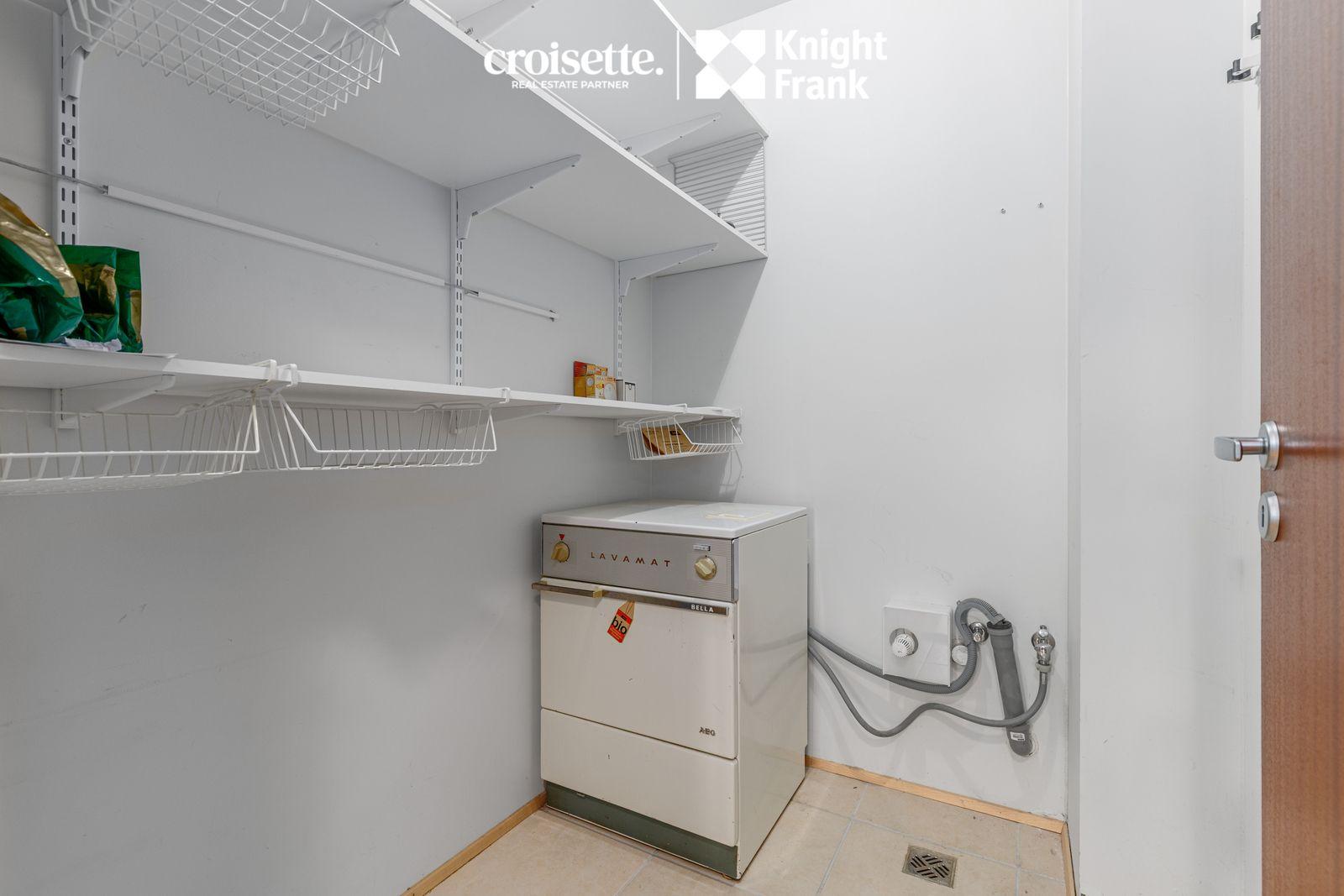 Þvottahús: Tengi fyrir þvottavél og þurrkara, flísar á gólfi, hillur á veggjum.