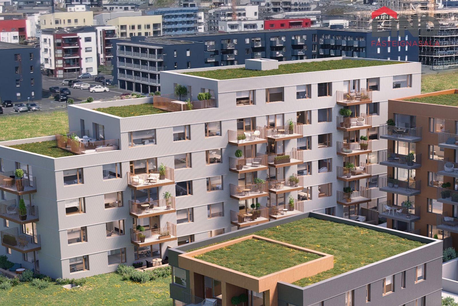 Íbúð 105: Er 95,7 fermetra 4ja herbergja íbúð á fyrstu hæð með stórum 11,8 fermetra sérafnotareit. Þar af er geymsla 15,5 fermetrar. Afhending er áætluð í mars/apríl 2026 en þó með fyrirvara um að öryggisúttekt sé komin á húsið.