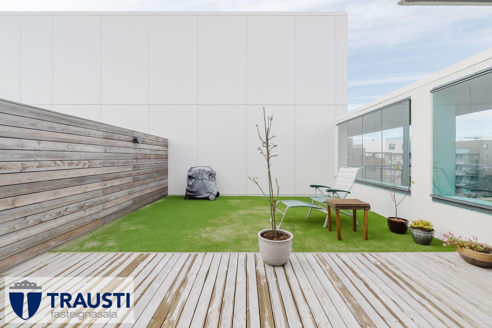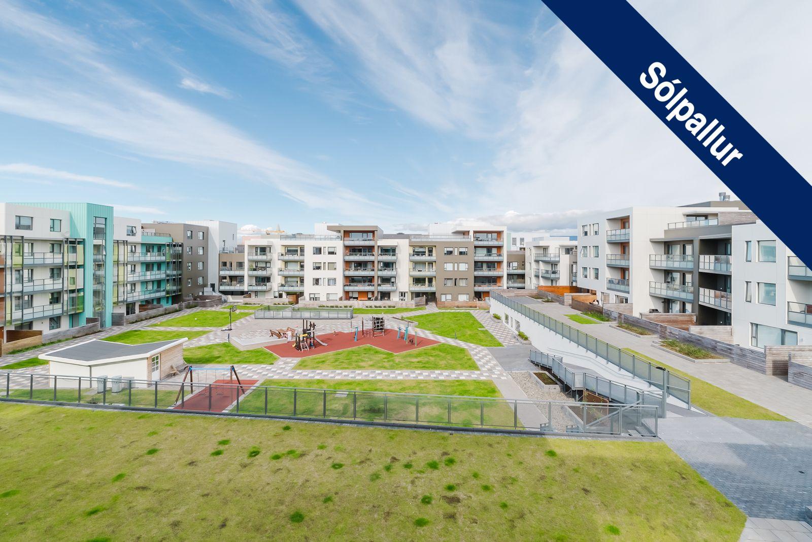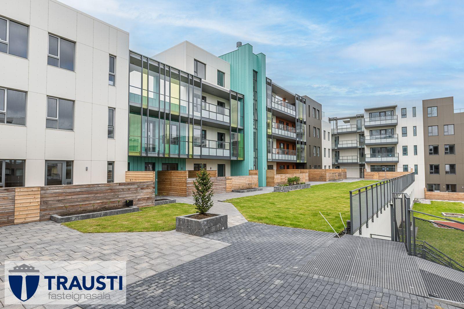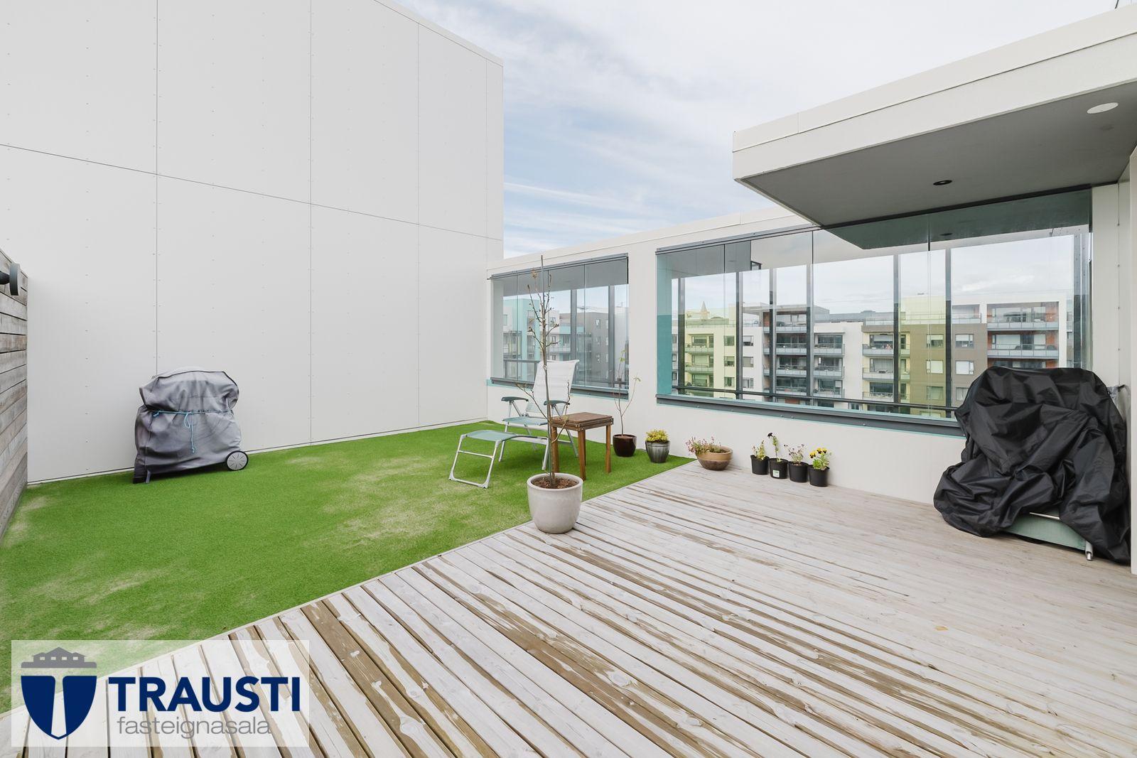 Nánari lýsing eignar: Þegar komið er upp á fjórðu hæð er sérinngangur inn í íbúðina eftir löngum gangi með útsýni yfir garðinn en þessi íbúð er ein með aðgang að ganginum. Forstofa með flísum á gólfi og yfirhafnaskáp. Úr forstofu er gengið út á 37,4 fm þaksvalir þar sem hægt er að koma fyrir heitum potti. Stofa og opið eldhús, hvít innrétting með eyju. Gengið er út á suður svalir frá stofu/eldhúsi Rúmgóð þrjú svefnherbergi, með fataskáp. Baðherbergi með sturtu, ljósri innréttingu, handlaug og upphengdu salerni og handklæðaofn. Sér þvottahús með flísum á gólfi. Geymsla í kjallara, innan bílskúrs 11,6 fm Bílskúr með stálvaski, 48,7 fm Bílastæði í lokuðu bílastæðahúsi, fyrir fram skúr nr. B21 Stór og fallegur garður er í miðju bygginganna með leiktækjum fyrir börn.