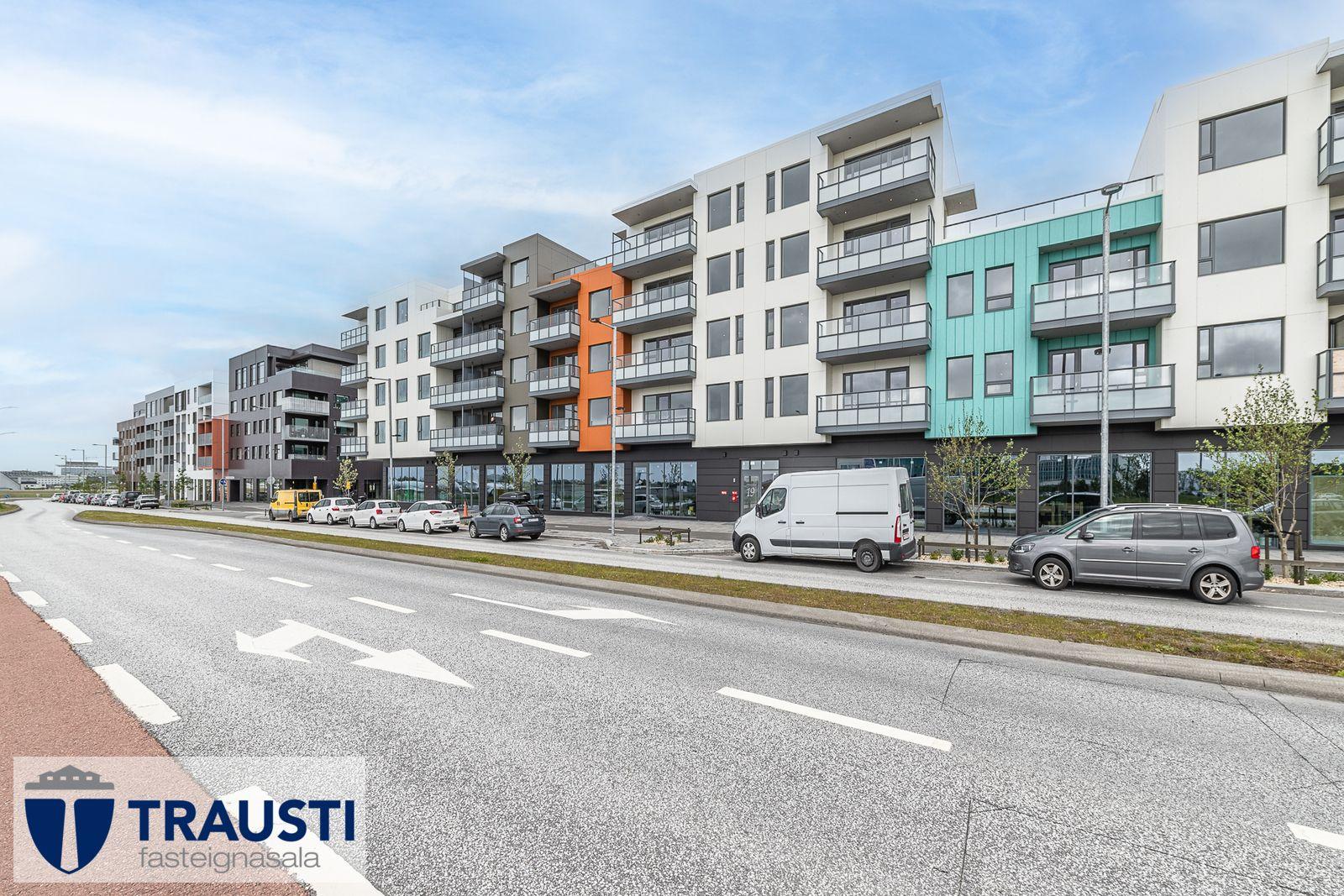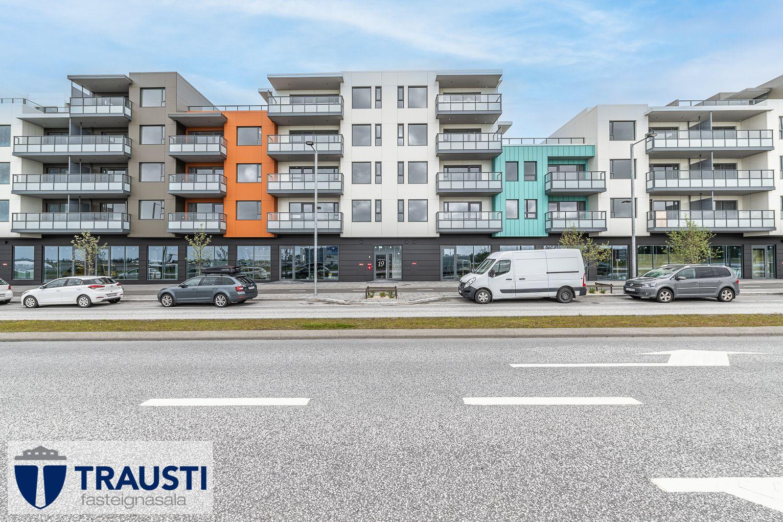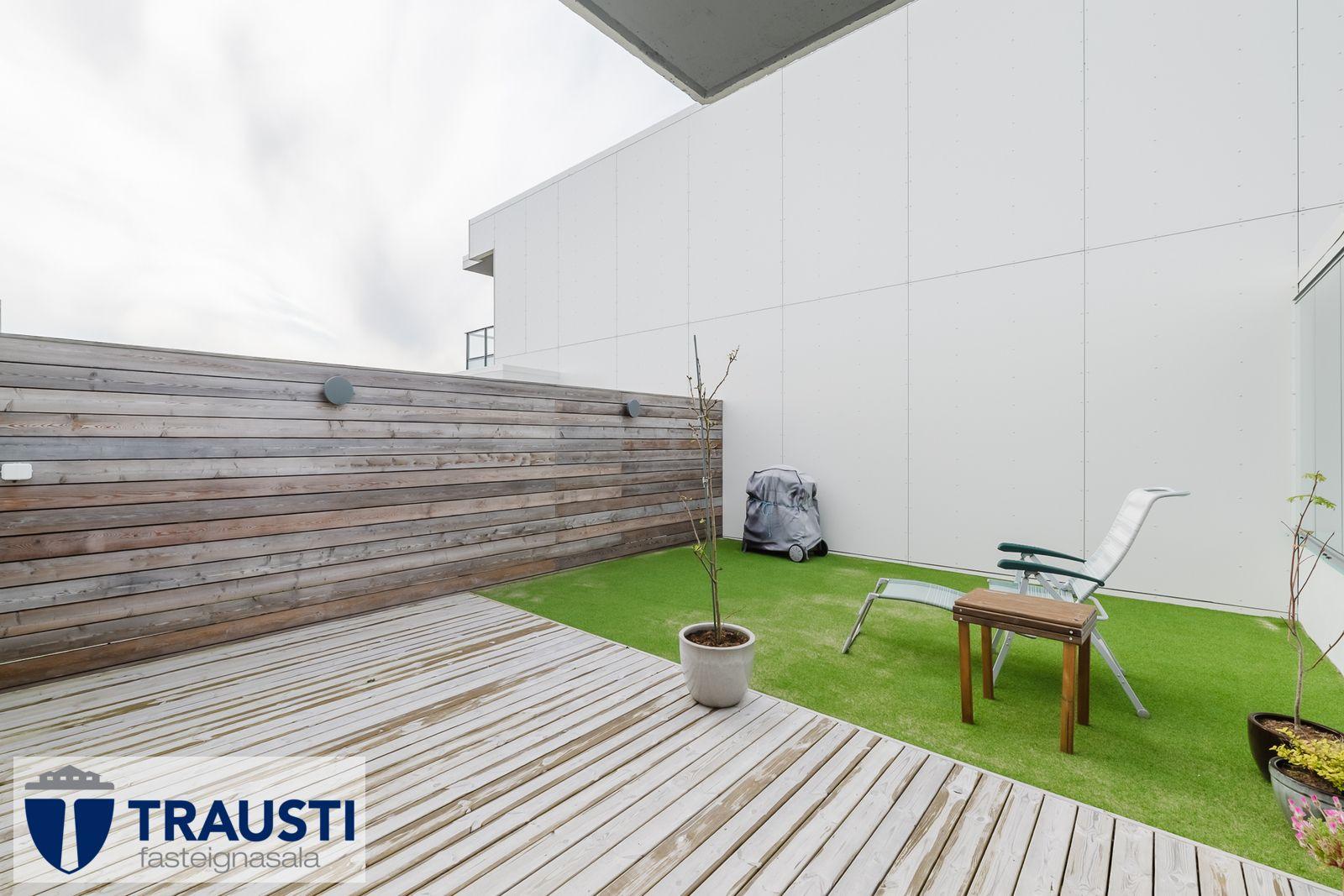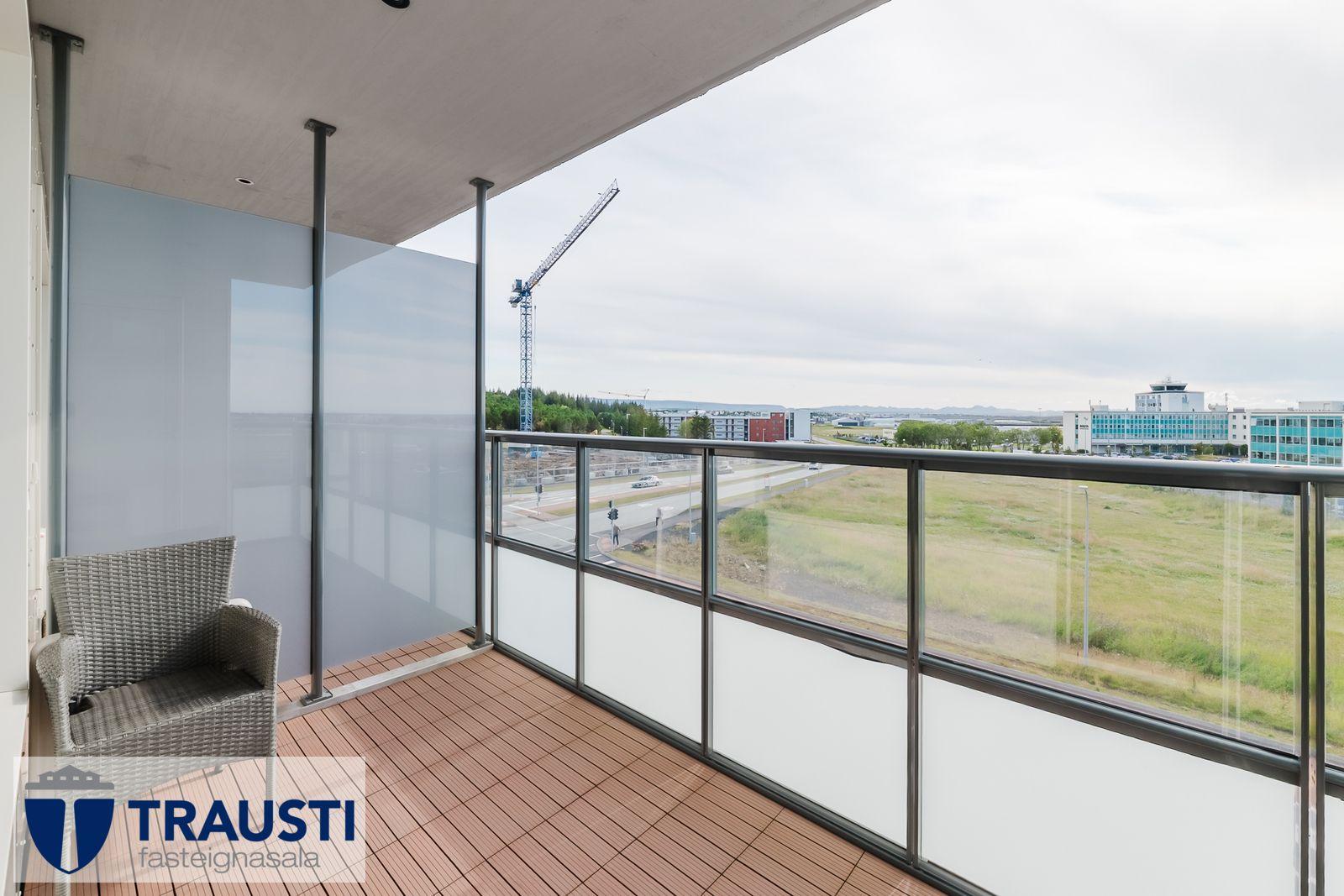 Nánari lýsing eignar: Þegar komið er upp á fjórðu hæð er sérinngangur inn í íbúðina eftir löngum gangi með útsýni yfir garðinn en þessi íbúð er ein með aðgang að ganginum. Forstofa með flísum á gólfi og yfirhafnaskáp. Úr forstofu er gengið út á 37,4 fm þaksvalir þar sem hægt er að koma fyrir heitum potti. Stofa og opið eldhús, hvít innrétting með eyju. Gengið er út á suður svalir frá stofu/eldhúsi Rúmgóð þrjú svefnherbergi, með fataskáp. Baðherbergi með sturtu, ljósri innréttingu, handlaug og upphengdu salerni og handklæðaofn. Sér þvottahús með flísum á gólfi. Geymsla í kjallara, innan bílskúrs 11,6 fm Bílskúr með stálvaski, 48,7 fm Bílastæði í lokuðu bílastæðahúsi, fyrir fram skúr nr. B21 Stór og fallegur garður er í miðju bygginganna með leiktækjum fyrir börn.