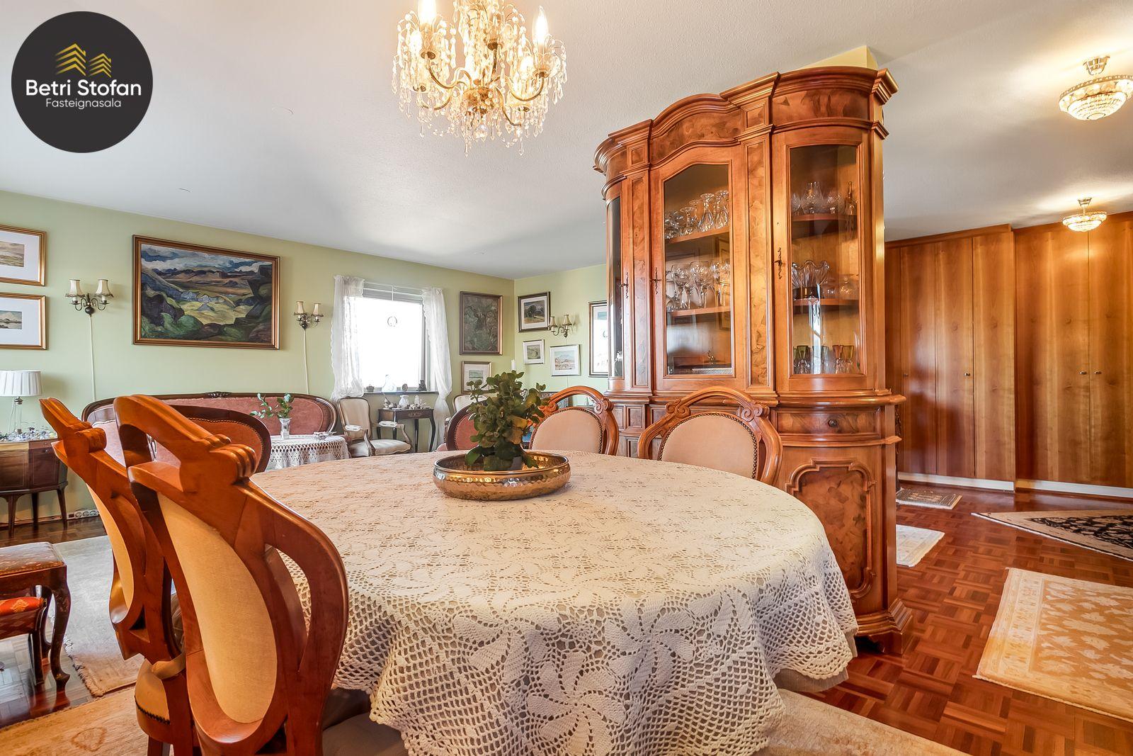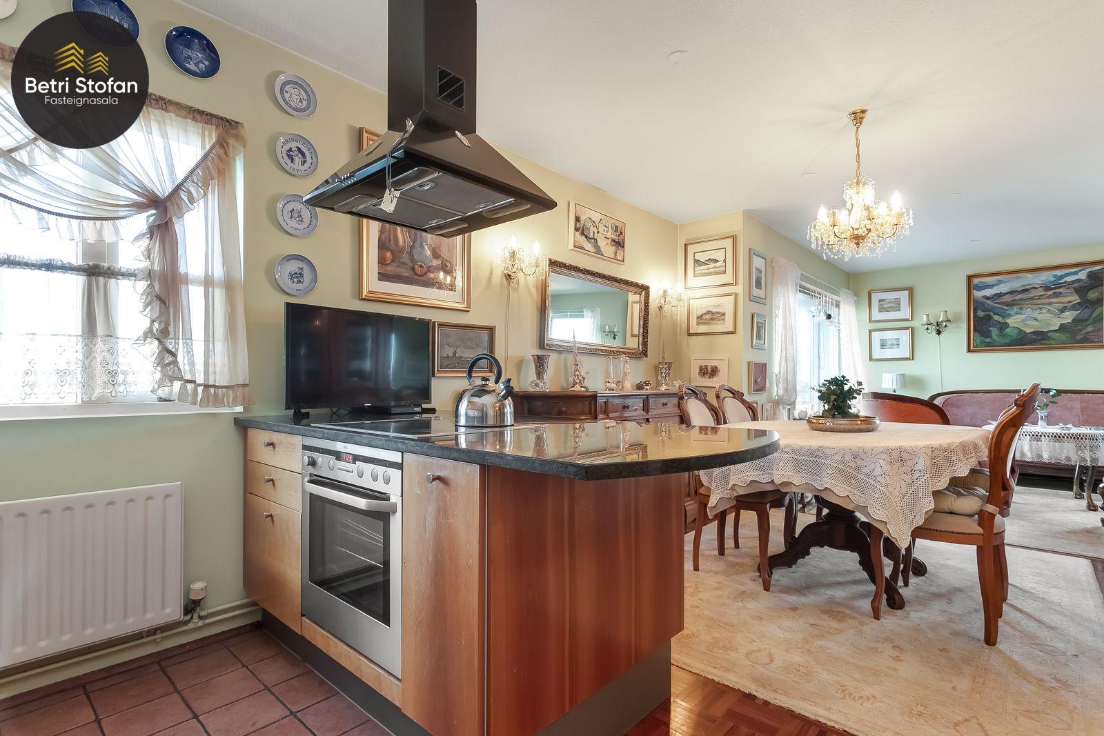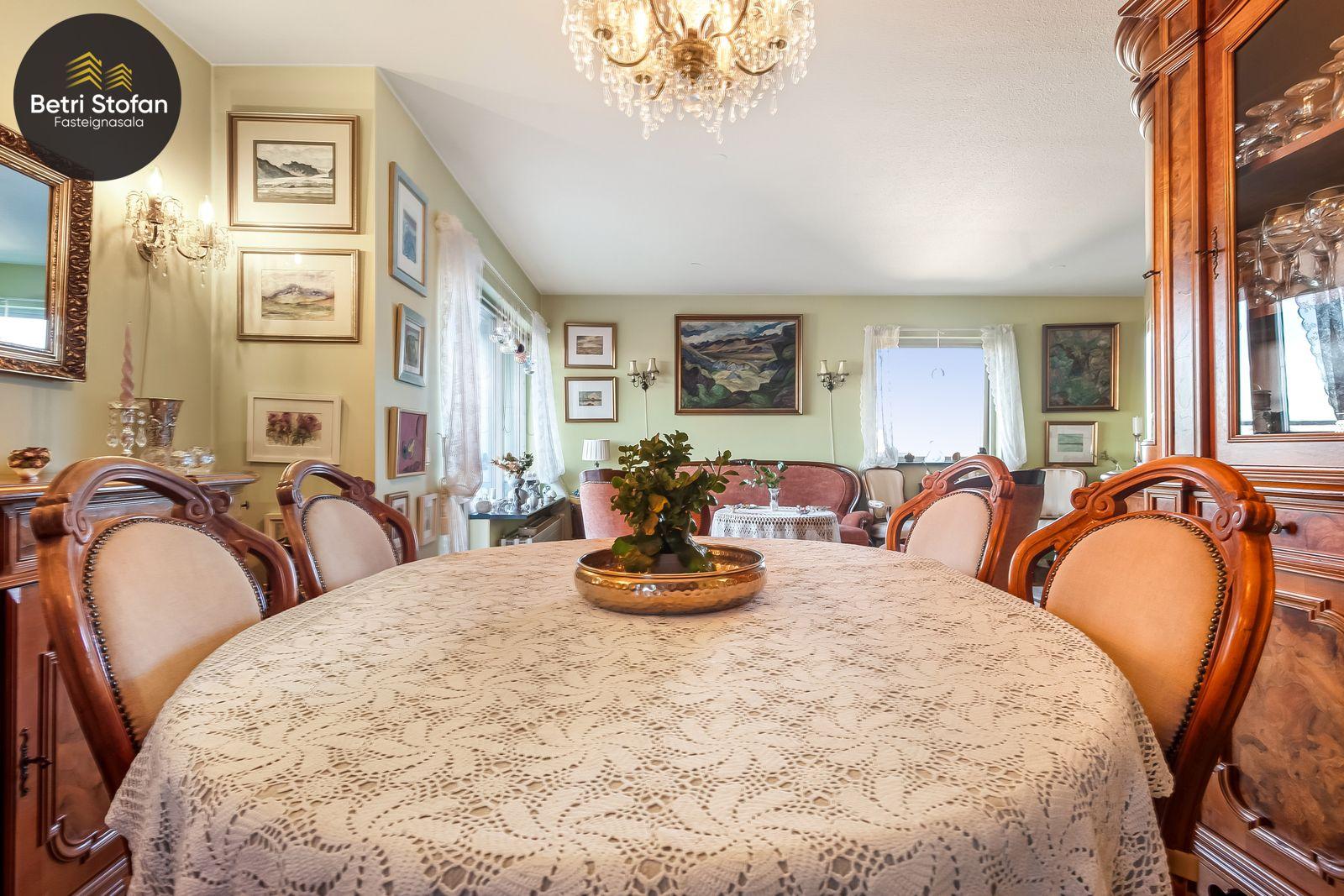 Nánari lýsing neðri hæð Rúmgott hol með fataskáp. Gestasalerni flísalagt í hólf og gólf. Rúmgóð björt stofa og borðstofa með glæsilegu útsýni yfir sundin. Fallegt eldhús , vönduð eldunartæki, flísar á milli innréttingarinnar.