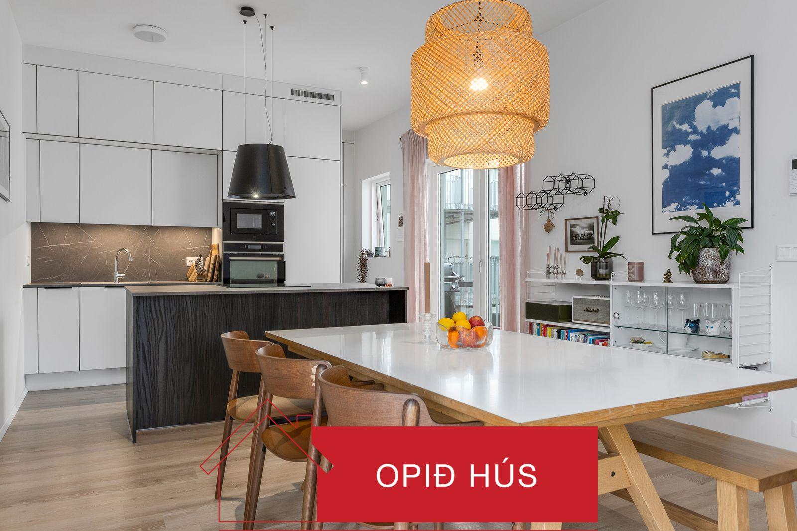 Eldhús + búr: Fallegar innréttingar frá Voke-III eru í eldhúsinu þar sem er innrétting á einn vegg með efri og neðri skápum ásamt eyju sem skilur eldhúsið frá borðstofunni. Fyrir aftan eldhúsið er gengið inn í gott búr með miklu skápaplássi ásamt vinnuvaski og hillum. Hægt er að tengja auka uppþvottavél í búrinu eða breyta því í þvottaherbergi ef aðilar kjósa það. Gengið er út á svalir sem snúa inn í lokaðan sameiginlegan hring þar sem svalagangurinn inn að íbúðinni liggur frá eldhúsinu.