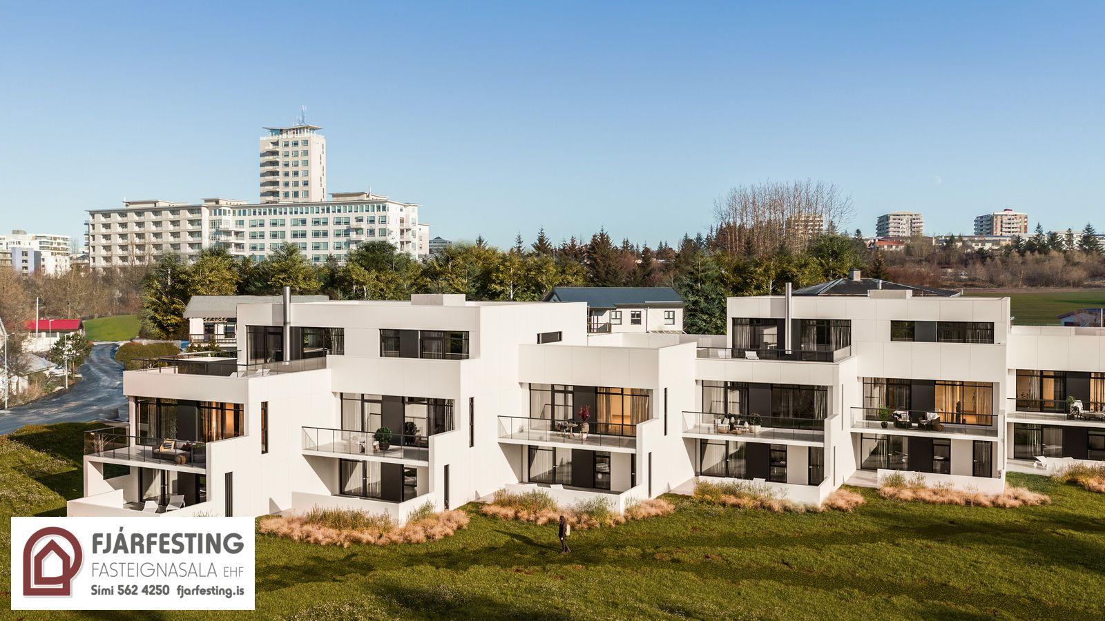 FJÁRFESTING FASTEIGNASALA, SÍMI 562-4250, ER MEÐ TIL SÖLU STÓRGLÆSILEGA 5 HERB. ÍBÚÐ (HÁLFGERT RAÐHÚS) Á TVEIMUR HÆÐUM Í NÝJU TENGIHÚSI VIÐ FOSSVOGSVEG 8-34 Í REYKJAVÍK. STÆÐI Í LOKAÐRI BÍLAGEYMSLU FYLGIR ÍBÚÐINNI.Glæsileg og vel skipulögð