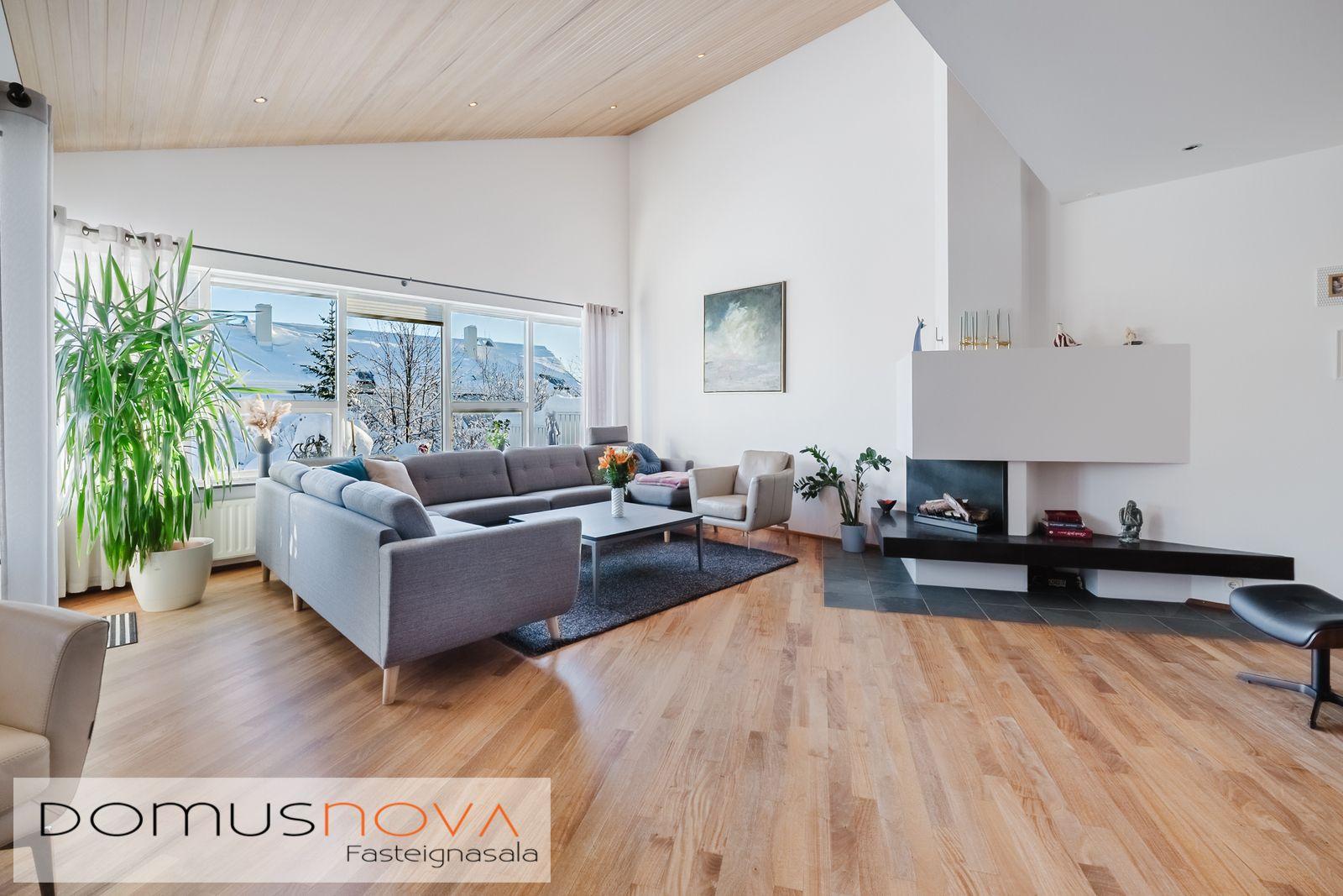 Lýsing eignar: Aðkoma:Húsið er innarlega í rólegum botnlanga. Fyrir framan húsið má með góðu móti leggja þremur bílum. Einnig rúmgott svæði fyrir setuaðstöðu fyrir framan hús. Forstofa: Flísalögð forstofa með fallegum dökkum náttúru steinflísum og góðu skápaplássi. Þvottahús: Innaf forstofu er gengið inn í þvottahús. Þar er stæði fyrir þvottavél og þurrkara. Fínt vinnupláss og góð innrétting. Opnanlegur gluggi. Flísar á gólfi. Eldhús:Mjög vönduð innrétting. Mikið skápa og borðpláss. Granítplötur á borðum. Innfelld uppþottavél og ísskápur ásamt bakaraofni í vinnuhæð. Borðkrókur er í eldhúsinu. Háfur yfir eyju. Stórir gluggar og flísar á gólfi. Baðherbergi:Innrétting með ágætis geymsluplássi. Granítplata á borði. Baðkar og sér sturtuklefi. Handklæðaofn og upphengt salerni. Flísar á gólfi og opnanlegur gluggi. Stofa/borðstofa: Alrýmið er einstaklega fallegt með mjög mikilli lofthæð. Á gólfum er parket og náttúru steinflísar á gólfi. Arinn með íslensku grágrýti í eldhólfi og á syllu. Stórir gluggar á alrýminu gefa fallega sýn. Útgengt frá stofu út á verönd/garð. Svefnherbergi I:Á neðri hæðinni er hjónaherbergið. Það er parketlagt með góðum fataskáp. Svefnherbergi II:Búið er að breyta alrýminu og nýtist þetta svefnherbergi sem hluti af alrýminu í dag. Þessu rými væri hægt að breyta aftur í svefnherbergi. Svefnherbergi III: Þetta herbergi er á efri hæðinni. Rúmgott herbergi. Parket á gólfi. Mikið útsýni til norðurs. Í herberginu er gott geymslurými undir súð sem er lokað af. Efri hæð:Nýtist í dag sem sjónvarpsrými, vinnuaðstaða og svefnherbergi. Undir súð er gott geymslurými. Bílskúr:Mjög snyrtilegur. Heitt og kalt vatn. Opnanlegur gluggi. Rafmagnsopnari á bílskúrshurð. Gott geymsluloft.