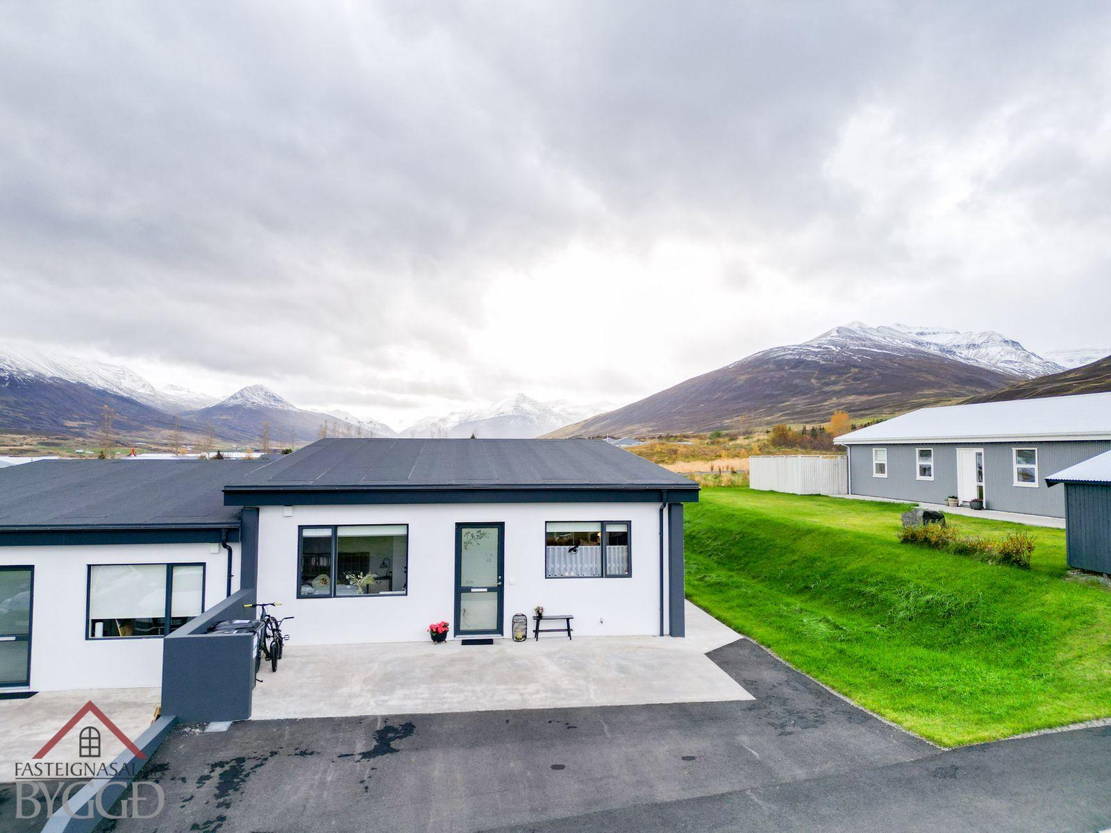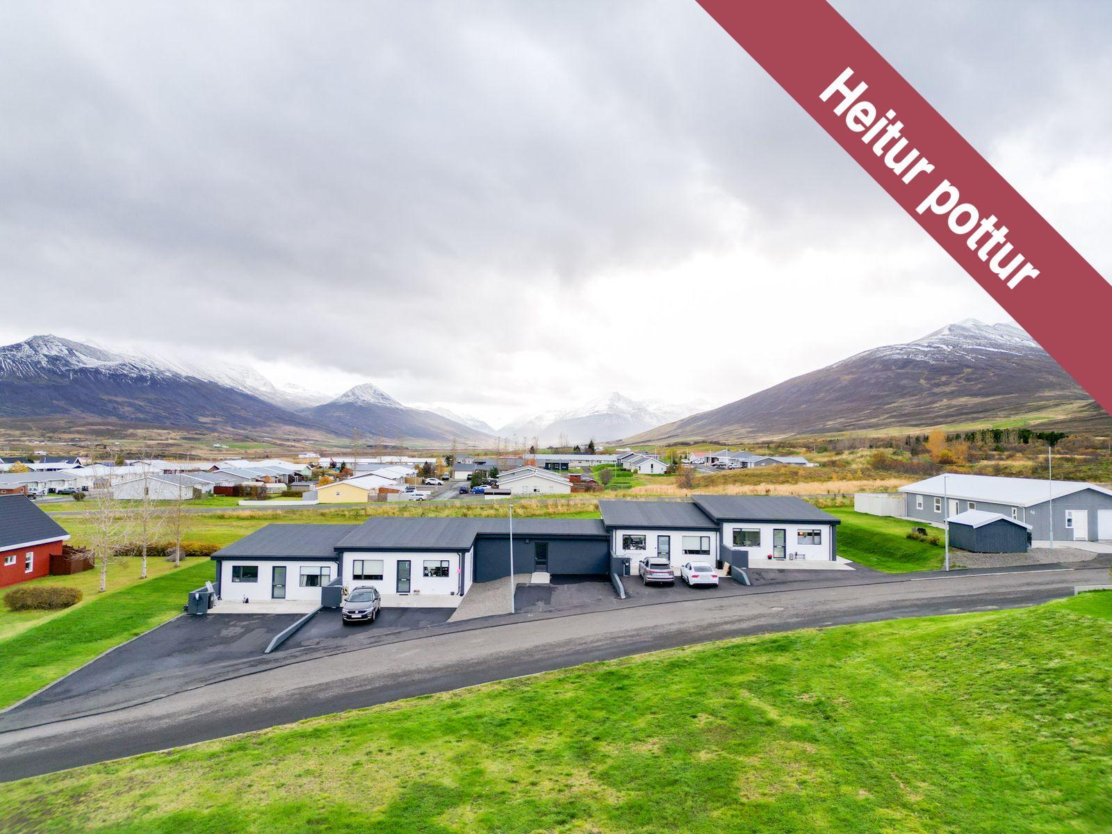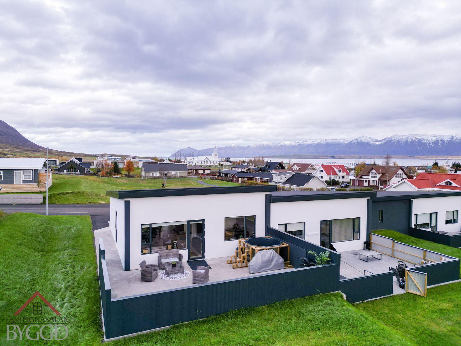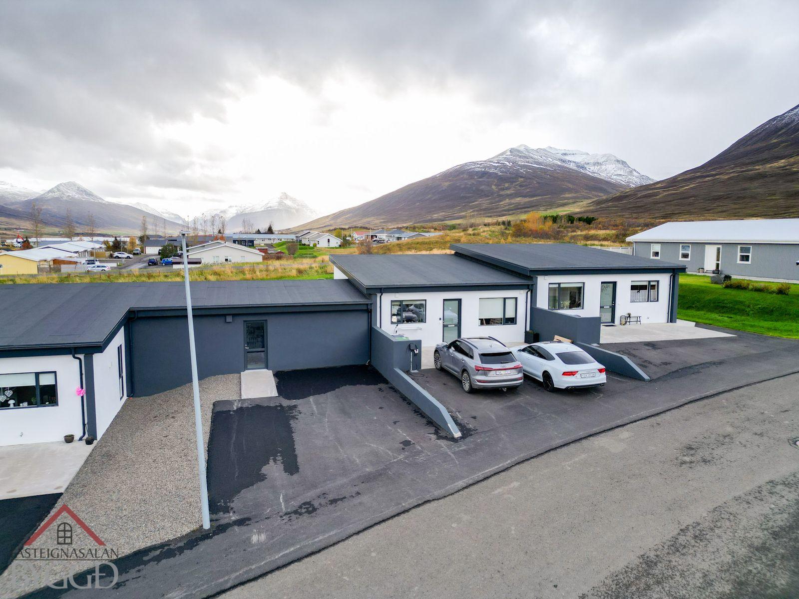 Glæsileg þriggja herbergja endaraðhús íbúð í fjögurra íbúða húsi á flottum stað á Dalvík. Sameiginleg vagna- og hjólageymsla ásamt sérgeymslu er í miðju húsinu. Glæsilegt útsýni og víðsýnt til suðurs af steyptri verönd sem er með heitum potti.