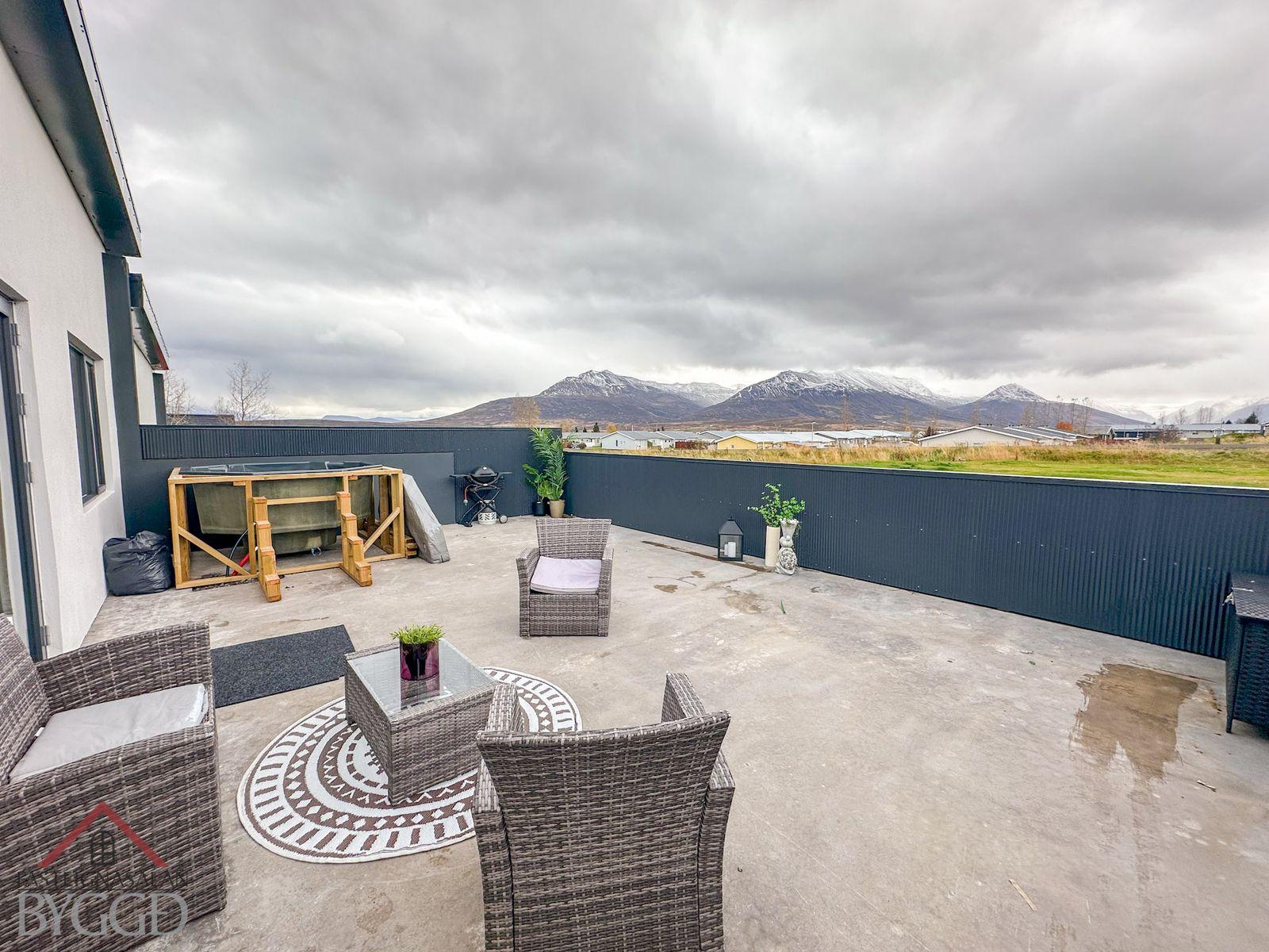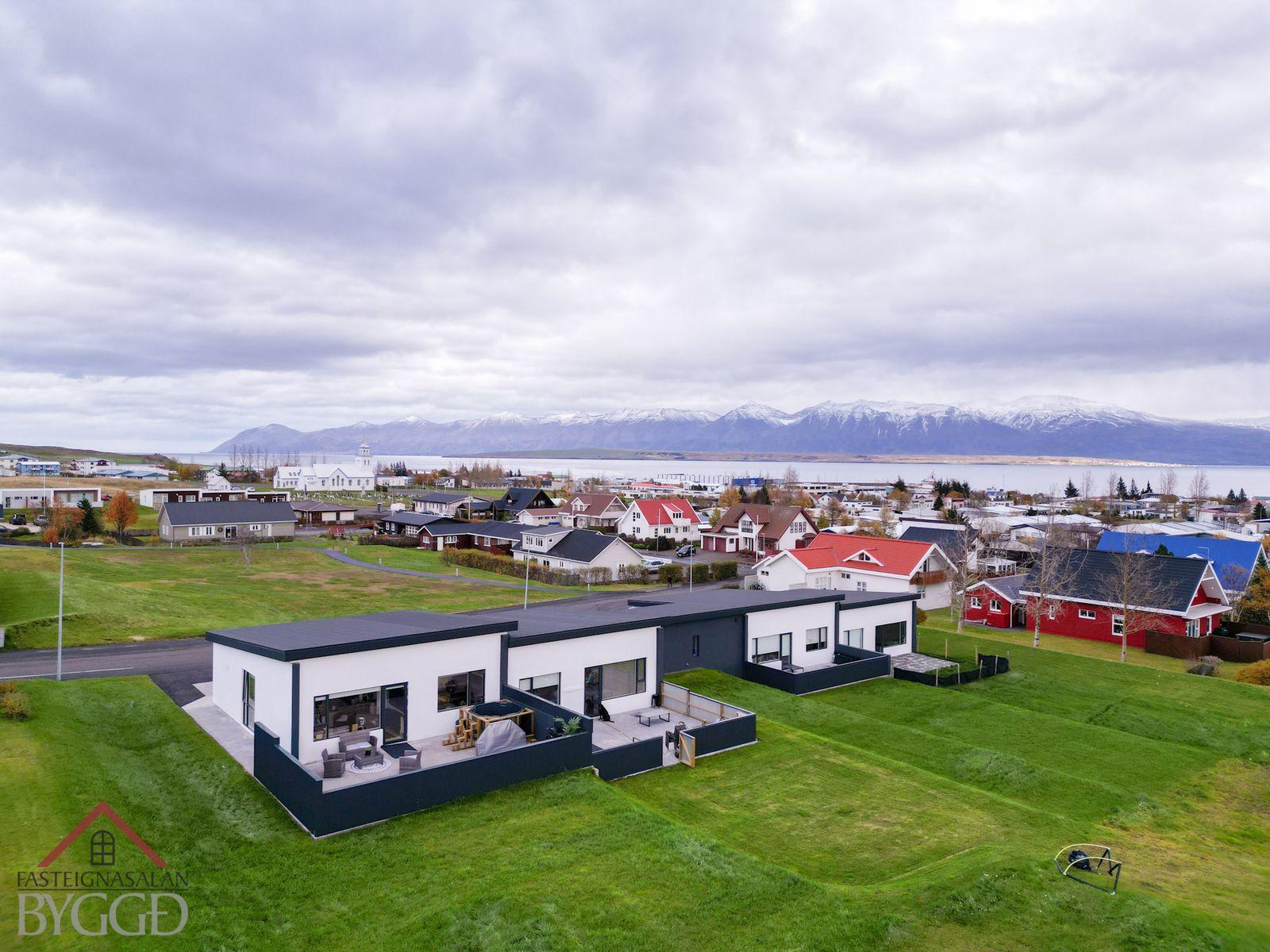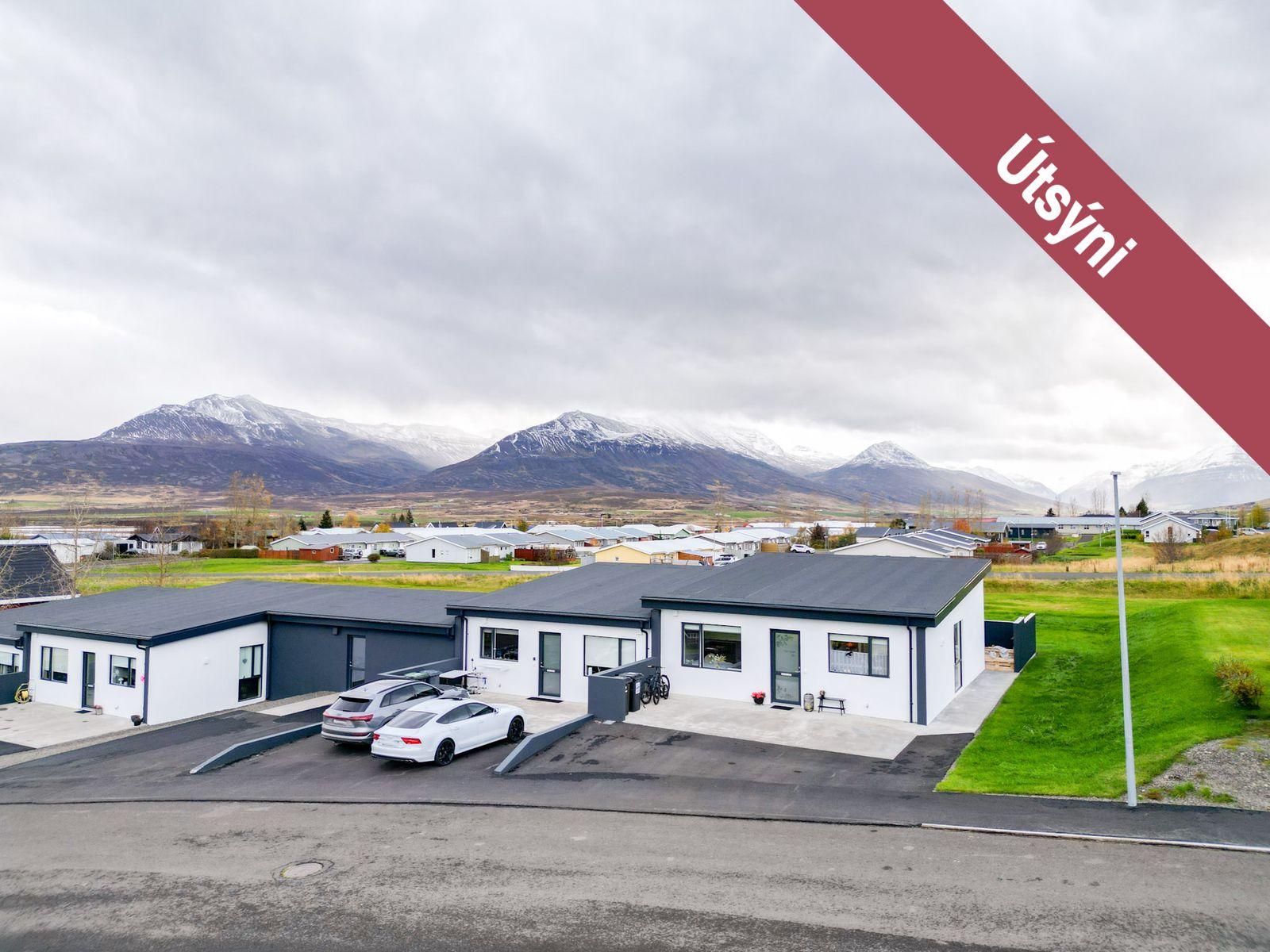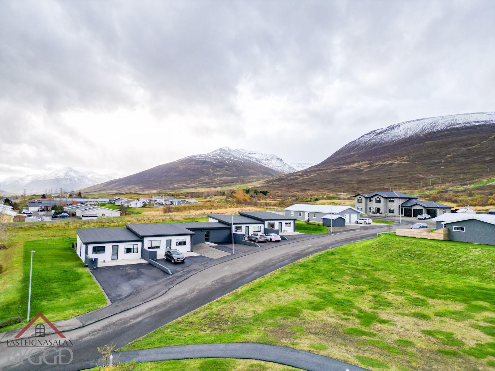Glæsileg þriggja herbergja endaraðhús íbúð í fjögurra íbúða húsi á flottum stað á Dalvík. Sameiginleg vagna- og hjólageymsla ásamt sérgeymslu er í miðju húsinu. Glæsilegt útsýni og víðsýnt til suðurs af steyptri verönd sem er með heitum potti.