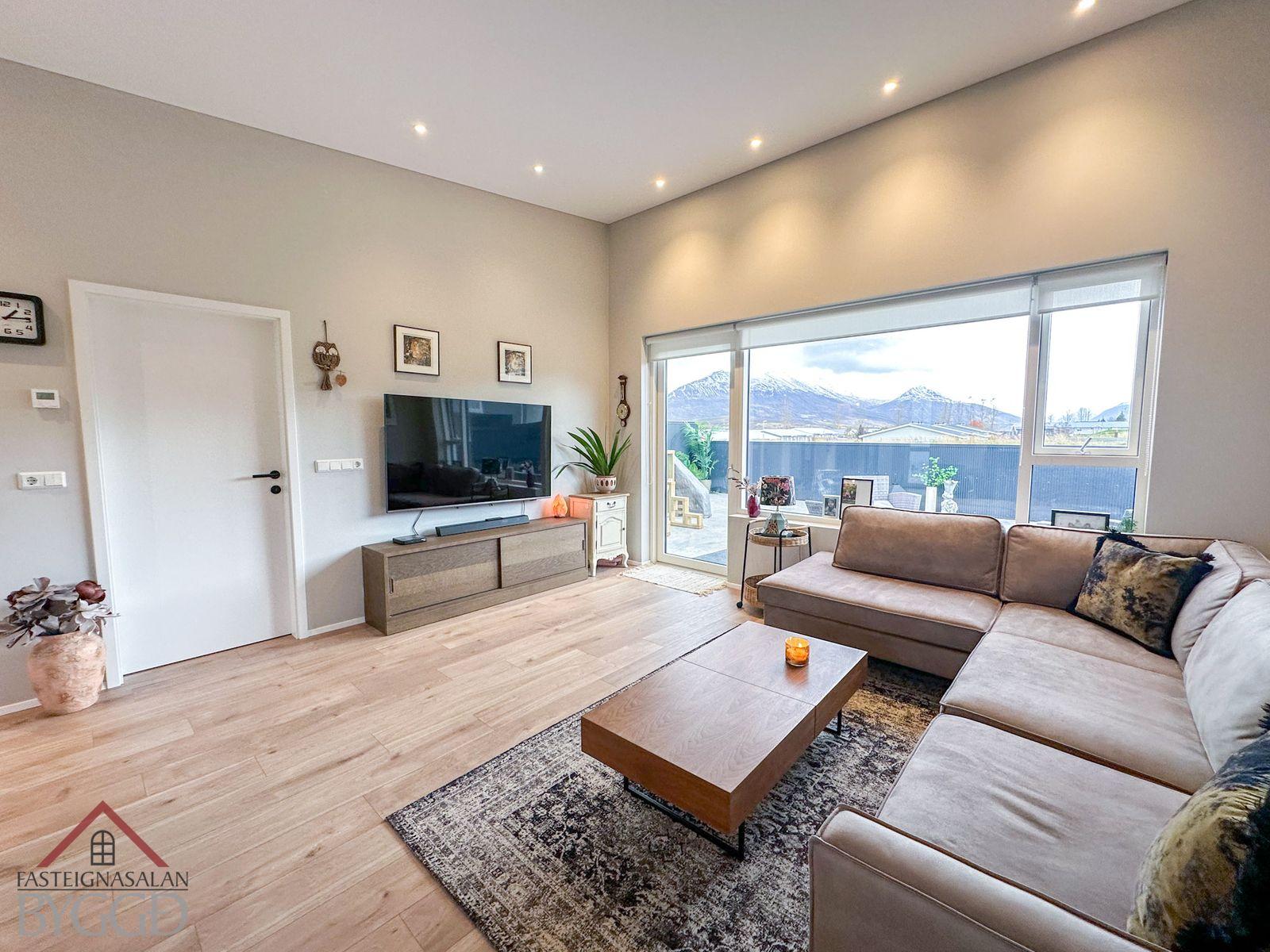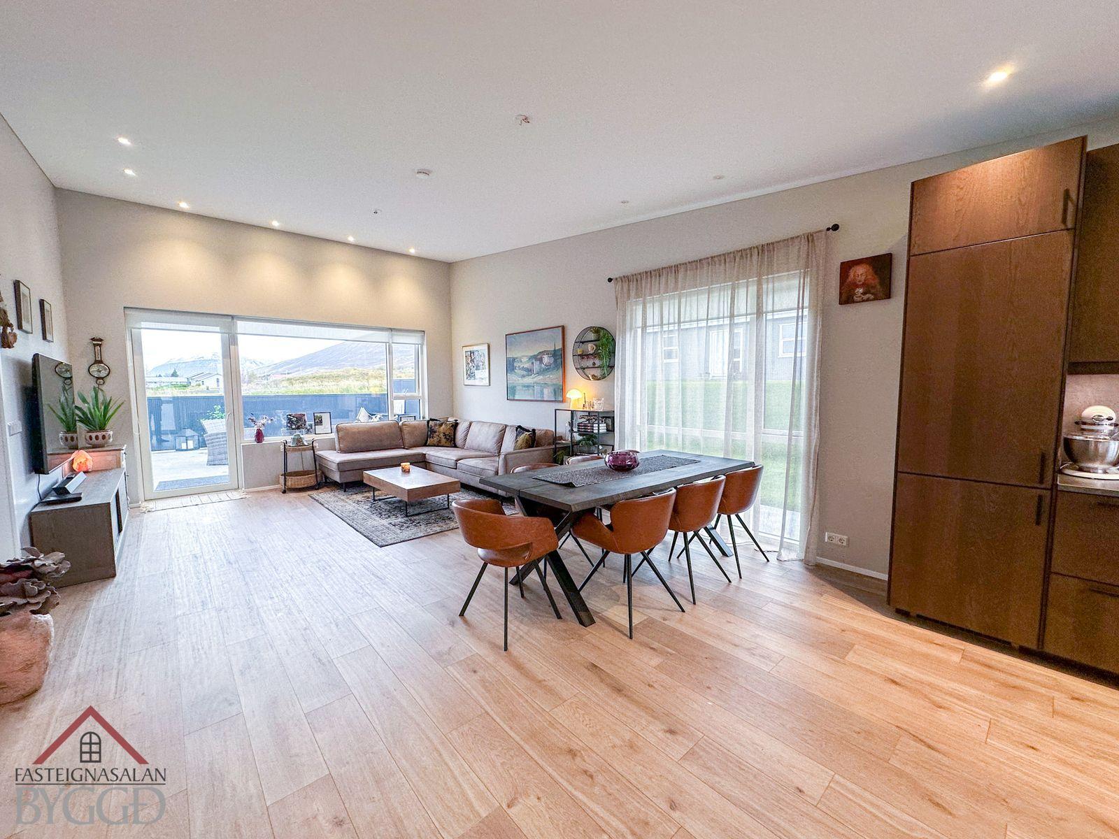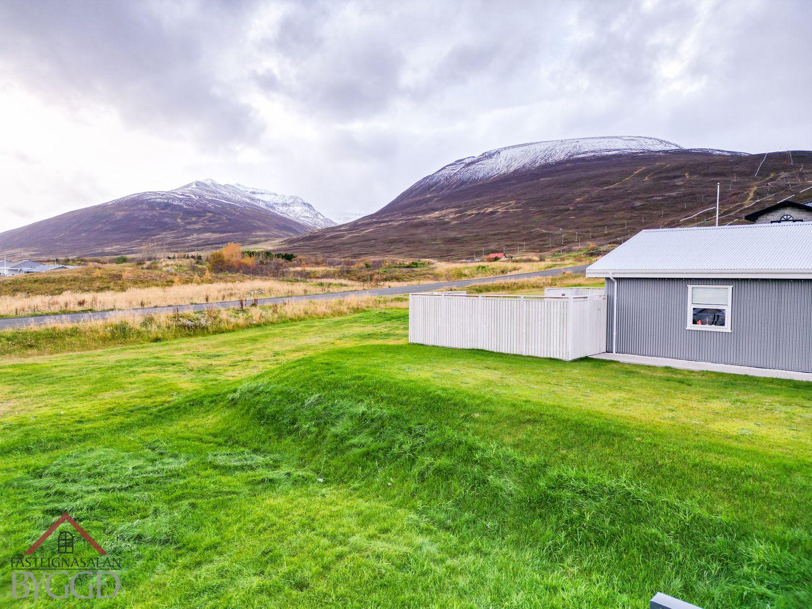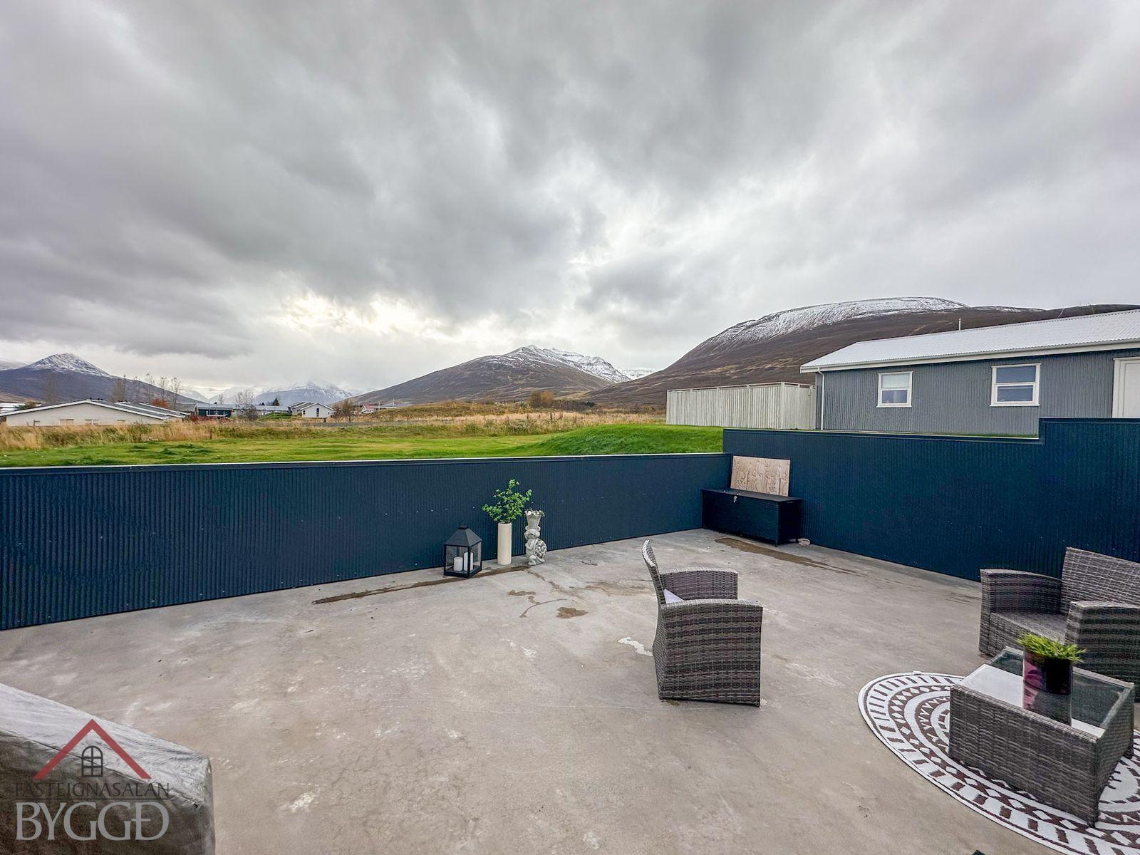 Glæsileg þriggja herbergja endaraðhús íbúð í fjögurra íbúða húsi á flottum stað á Dalvík. Sameiginleg vagna- og hjólageymsla ásamt sérgeymslu er í miðju húsinu. Glæsilegt útsýni og víðsýnt til suðurs af steyptri verönd sem er með heitum potti.