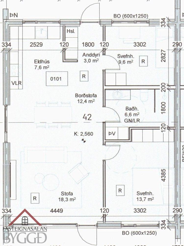 -Húsið er staðsteypt í plasteinangrunarkubba. Undirstöður eru einnig steyptar í plasteinangrunarkubba.