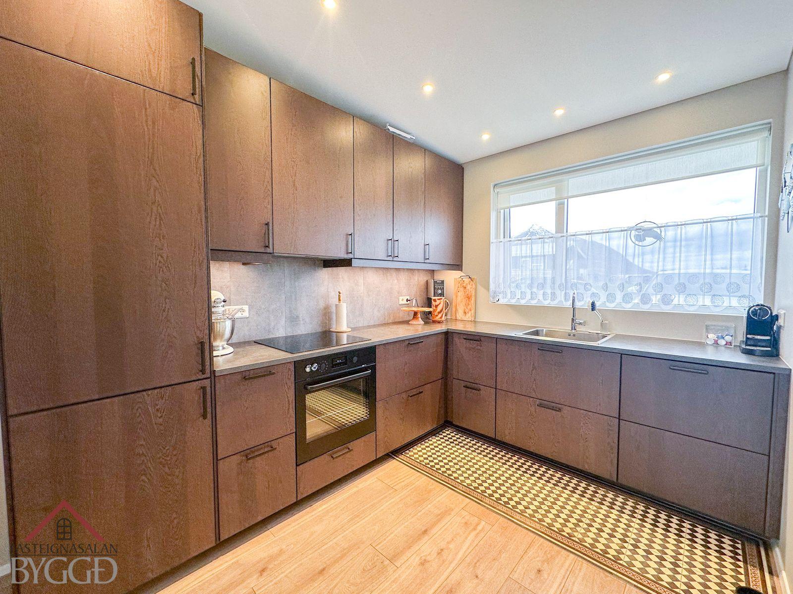 Eldhús er með parket á gólfi, góð innrétting með innbyggðum ísskáp og uppþvottavél og spanhelluborði.