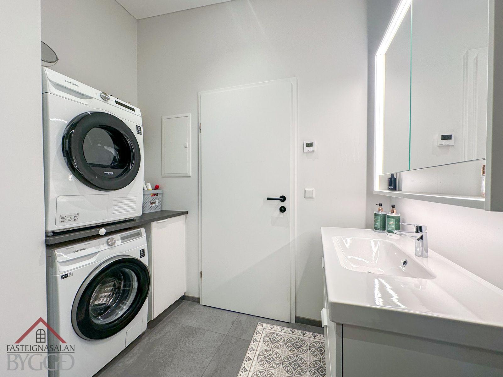 Baðherbergi er með flísar á gólfi og í kringum sturtu. Góð innrétting í kringum vask, upphengt salerni, sturtugler, handklæðaofn og stæði fyrir þvottavél og þurrkara.