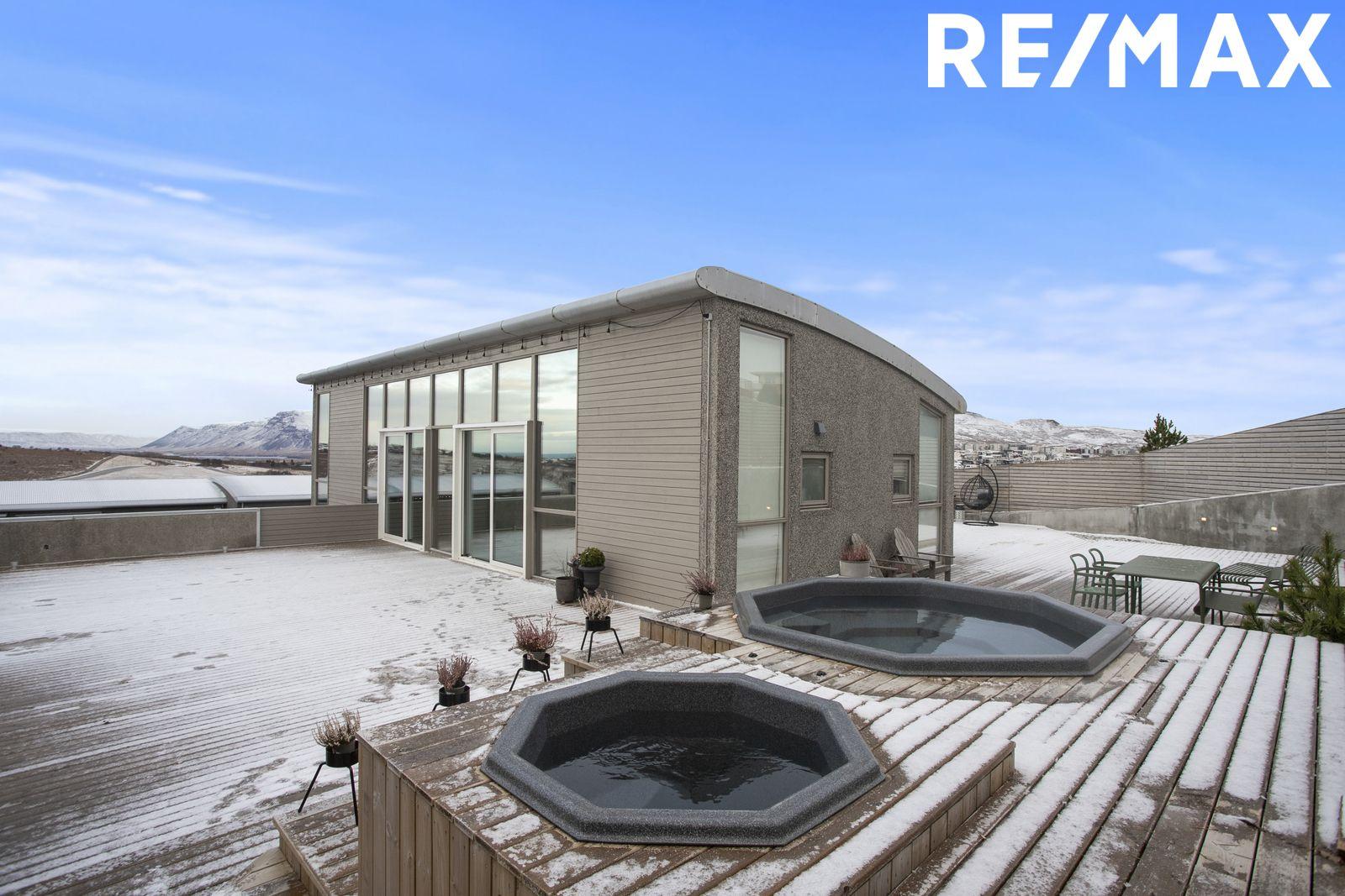 Útisvæði: Suðvestan megin við húsið er lóðin afgirt. Mjög stór ao falleg nýleg timburverönd með lýsingu. Bæði heitur- og kaldur pottur. Frábært útsýni.
