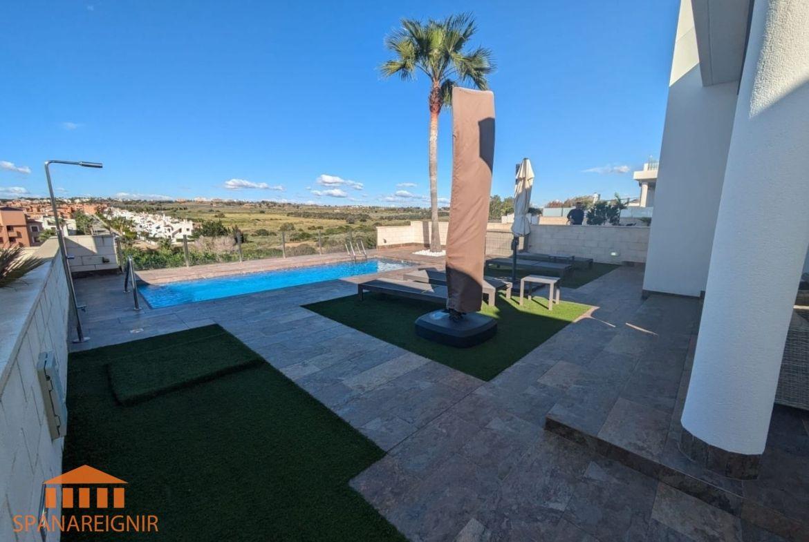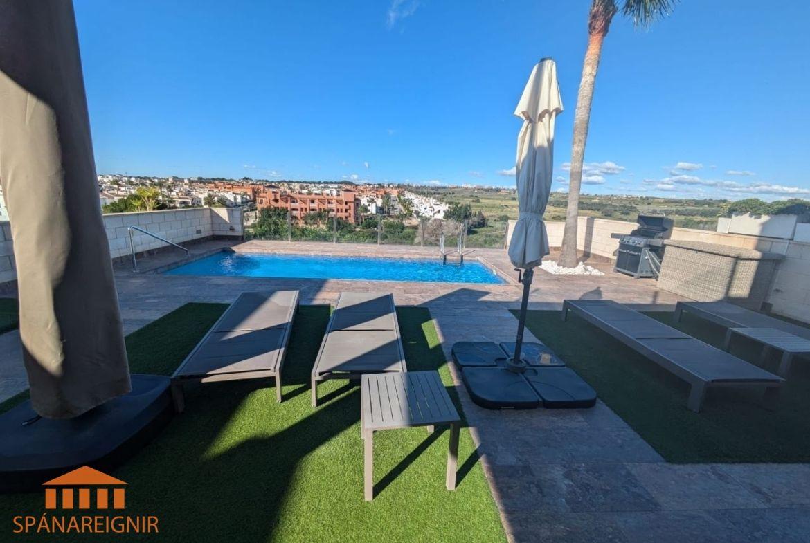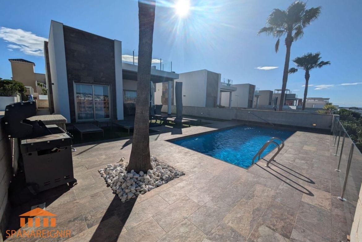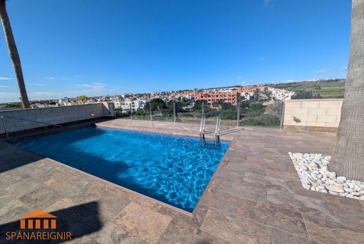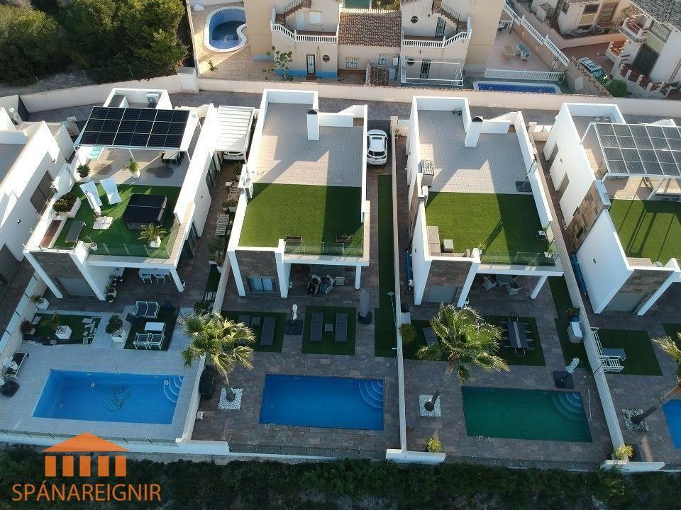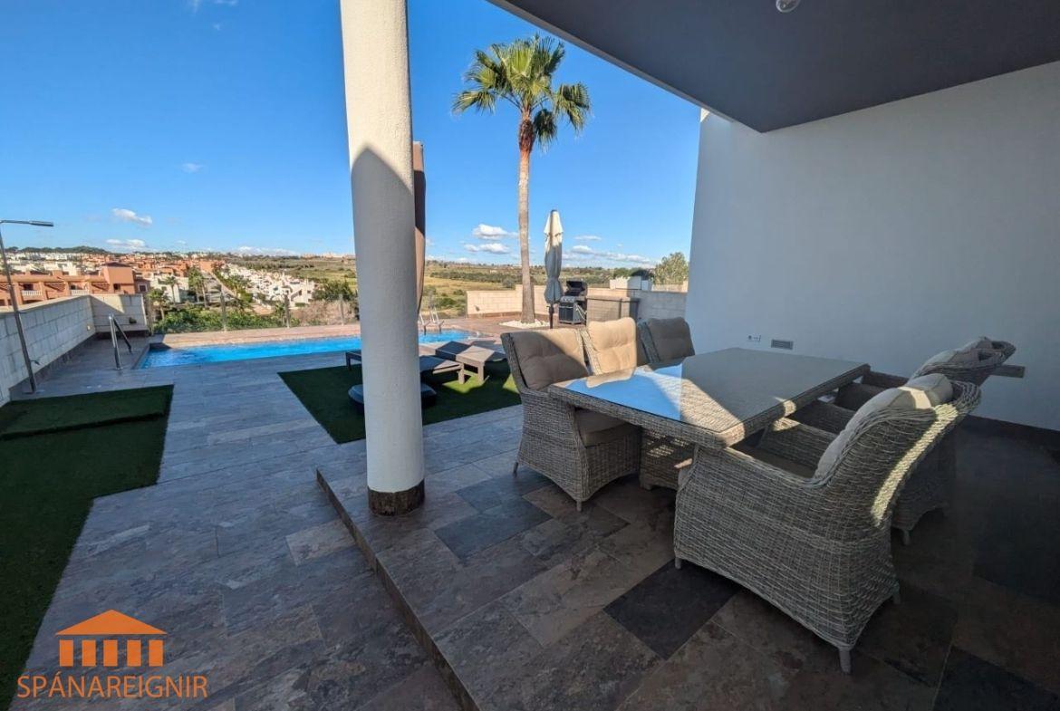 SPÁNAREIGNIR KYNNIR: *EINBÝLISHÚS Í VILLAMARTIN MEÐ FRÁBÆRU ÚTSÝNI* *UPPHITUÐ EINKASUNDLAUG, BÍLASTÆÐI Á LÓÐ* *STÓRAR ÞAKSVALIR MEÐ SJÁVARÚTSÝNI* *3 SVEFNHERBERGI, 2 BAÐHERBERGI* *NÁLÆGT GOLFVÖLLUM, VERSLUNUM OG VEITINGASTÖÐUM*Eignin stendur á 312 m² lóð til suðurs með viðhaldslitlum garði, einkasundlaug, grænum svæðum og veröndum þar sem hægt er að slaka á og njóta útsýnis yfir nærliggjandi svæði. Húsið samanstendur af 3 svefnherbergjum, 2 baðherbergjum, og opnu rými með stofu, borðstofu og eldhúsi. Auk stóra garðsins eru líka stórar þaksvalir þar sem hægt er að njóta sjávarútsýnis. Eignin er innréttuð með mjög vönduðum húsgögnum og kemur með miðlægu loftræstikerfi, bílastæði innan lóðar með rafdrifnum hliðum, rafknúnum gardínum um allt hús, þvottahúsi og geymslu.