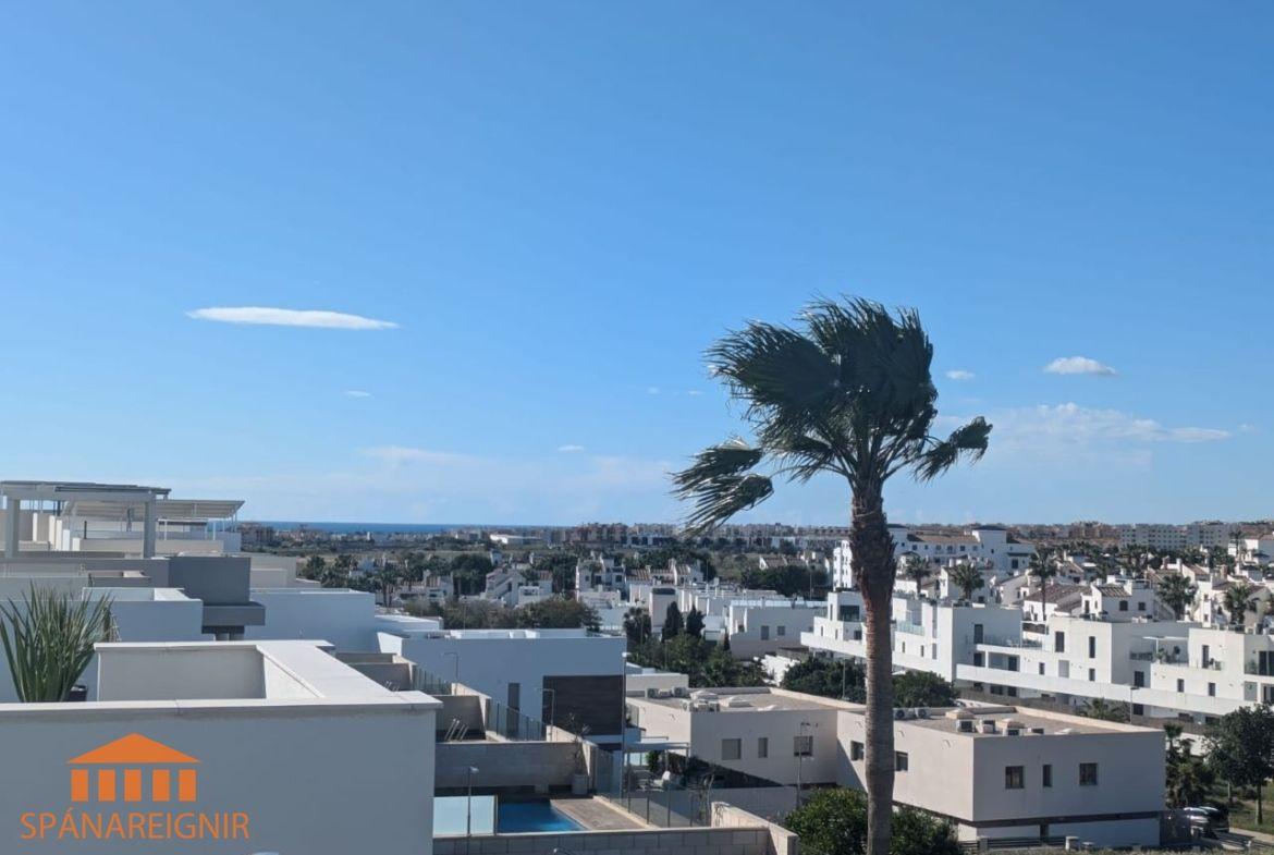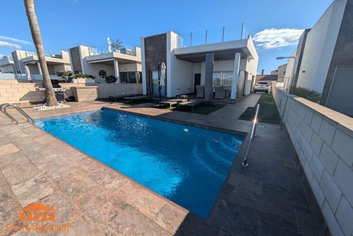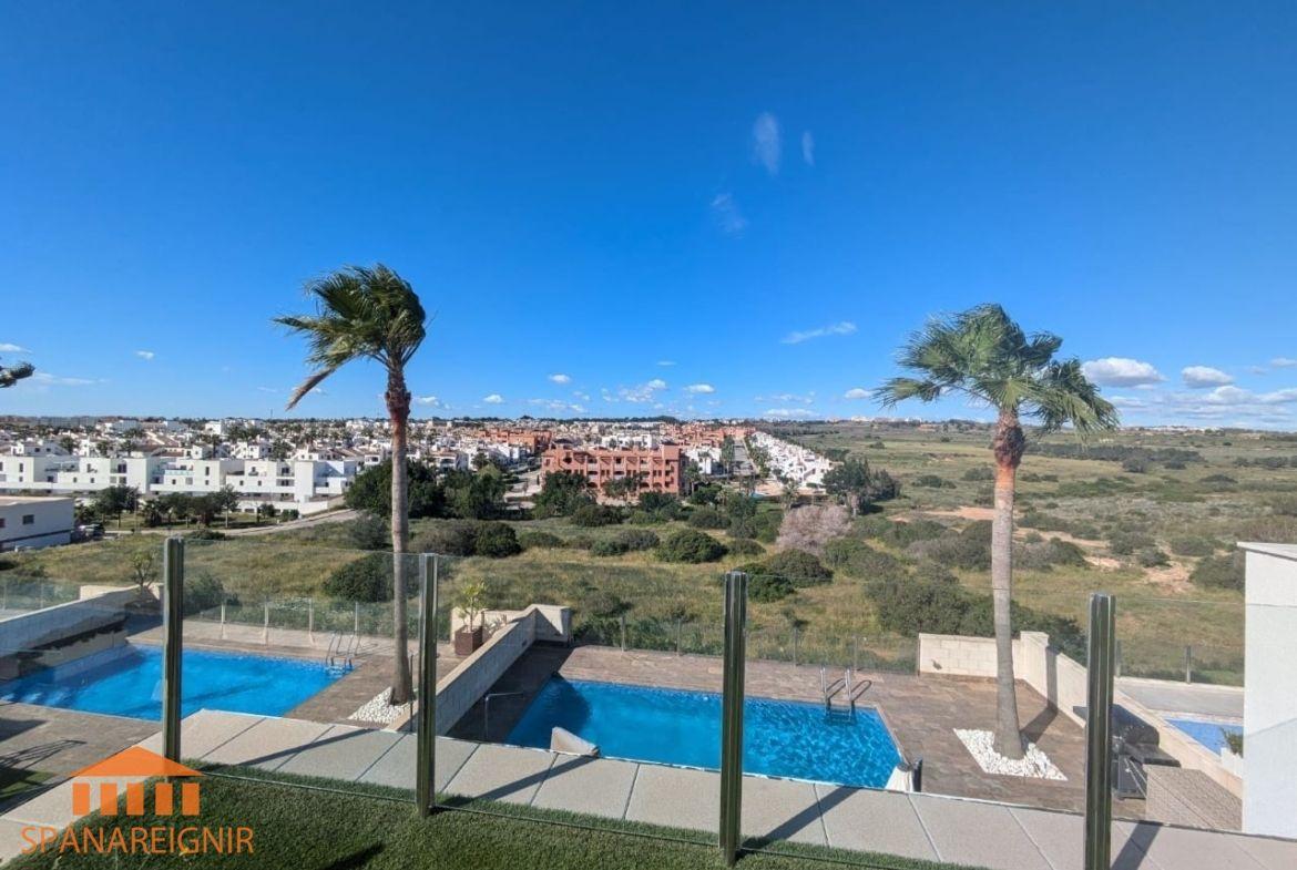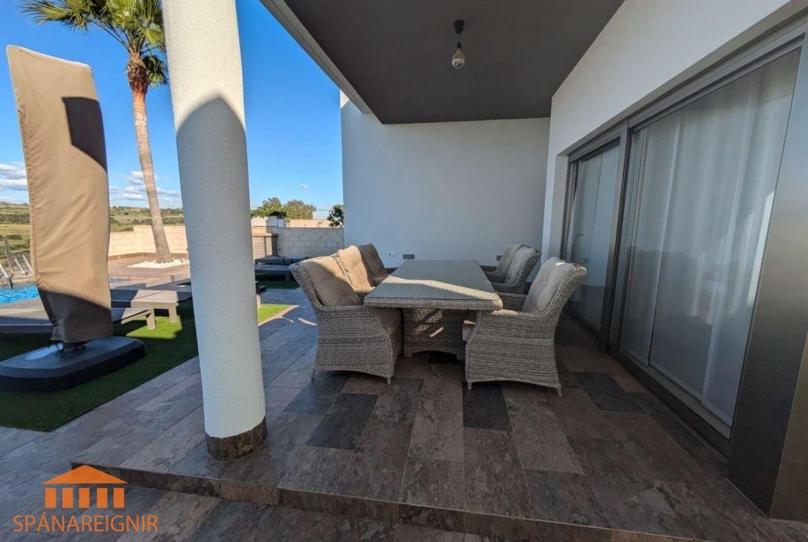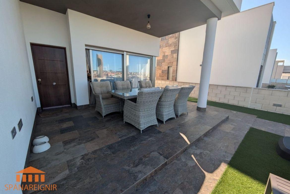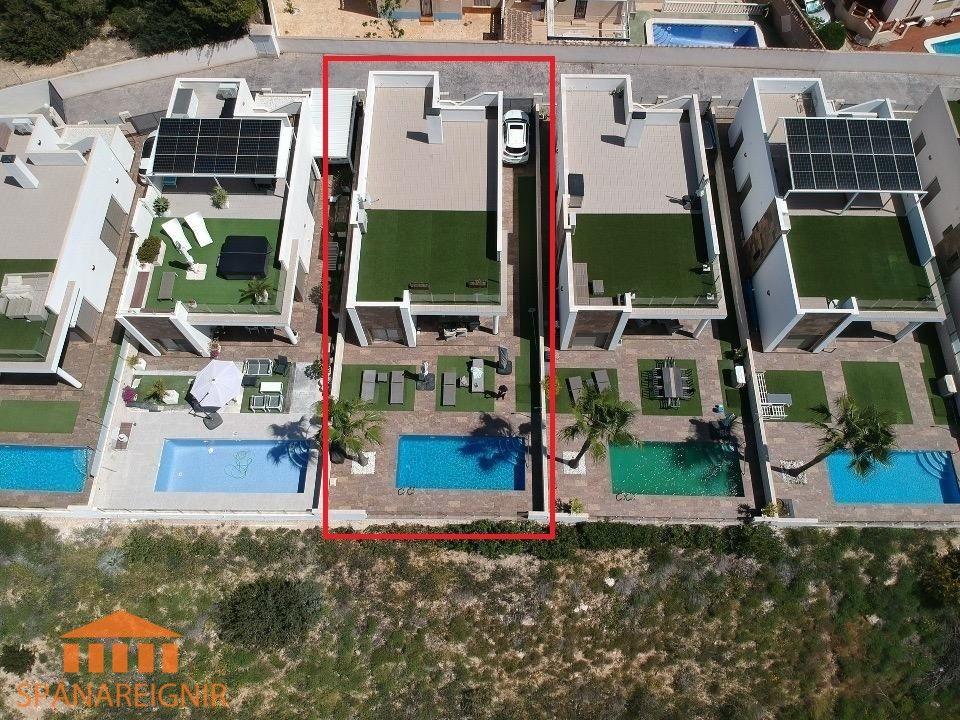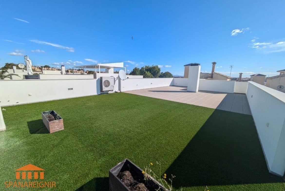 SPÁNAREIGNIR KYNNIR: *EINBÝLISHÚS Í VILLAMARTIN MEÐ FRÁBÆRU ÚTSÝNI* *UPPHITUÐ EINKASUNDLAUG, BÍLASTÆÐI Á LÓÐ* *STÓRAR ÞAKSVALIR MEÐ SJÁVARÚTSÝNI* *3 SVEFNHERBERGI, 2 BAÐHERBERGI* *NÁLÆGT GOLFVÖLLUM, VERSLUNUM OG VEITINGASTÖÐUM*Eignin stendur á 312 m² lóð til suðurs með viðhaldslitlum garði, einkasundlaug, grænum svæðum og veröndum þar sem hægt er að slaka á og njóta útsýnis yfir nærliggjandi svæði. Húsið samanstendur af 3 svefnherbergjum, 2 baðherbergjum, og opnu rými með stofu, borðstofu og eldhúsi. Auk stóra garðsins eru líka stórar þaksvalir þar sem hægt er að njóta sjávarútsýnis. Eignin er innréttuð með mjög vönduðum húsgögnum og kemur með miðlægu loftræstikerfi, bílastæði innan lóðar með rafdrifnum hliðum, rafknúnum gardínum um allt hús, þvottahúsi og geymslu.