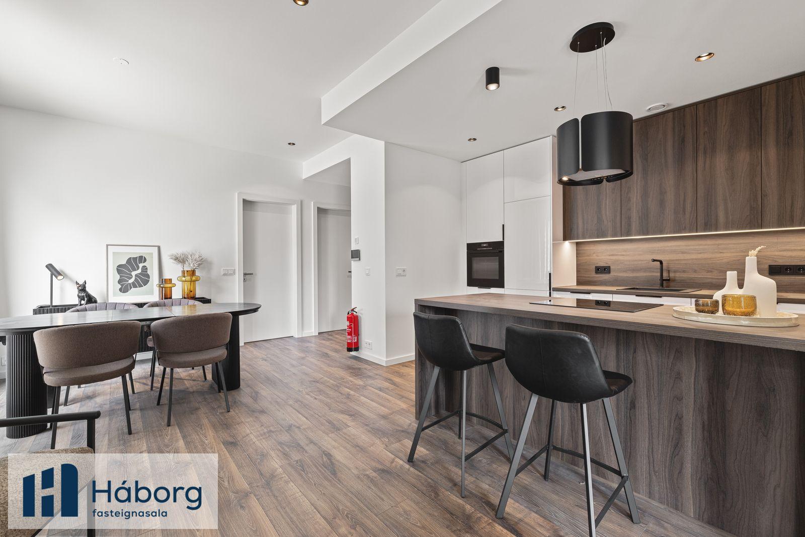 nýbygging. Eign á 5.hæð, stærð 90,2 fm, 108 Reykjavík. Glæsileg 3ja herbergja með fallega innréttuðu alrými, eldhús með eyju og gengið út á suð-vestur svalir úr stofu. Stofa er rúmgóð og björt með gólfsíðum gluggum. Hjónaherbergið er einnig með gólfsíðum gluggum, það er rúmgott og með góðum skápum. Barnaherbergið er einnig með gólfsíðum gluggum og góðum fataskápum. Baðherbergið er flísalagt að hluta, með sturtu sem gengið er beint inní, óbein lýsing fyrir ofan sturtu, skúffu innrétting undir handlaug og spegill fyrir ofan handlaug einnig með óbeinni lýsingu.Sér þvottahús innan íbúðar með góðri vinnuaðstöðu með skolvaski. Eigninni fylgir geymsla í kjallara. Aðgengi að bílakjallara á 3.hæðum.