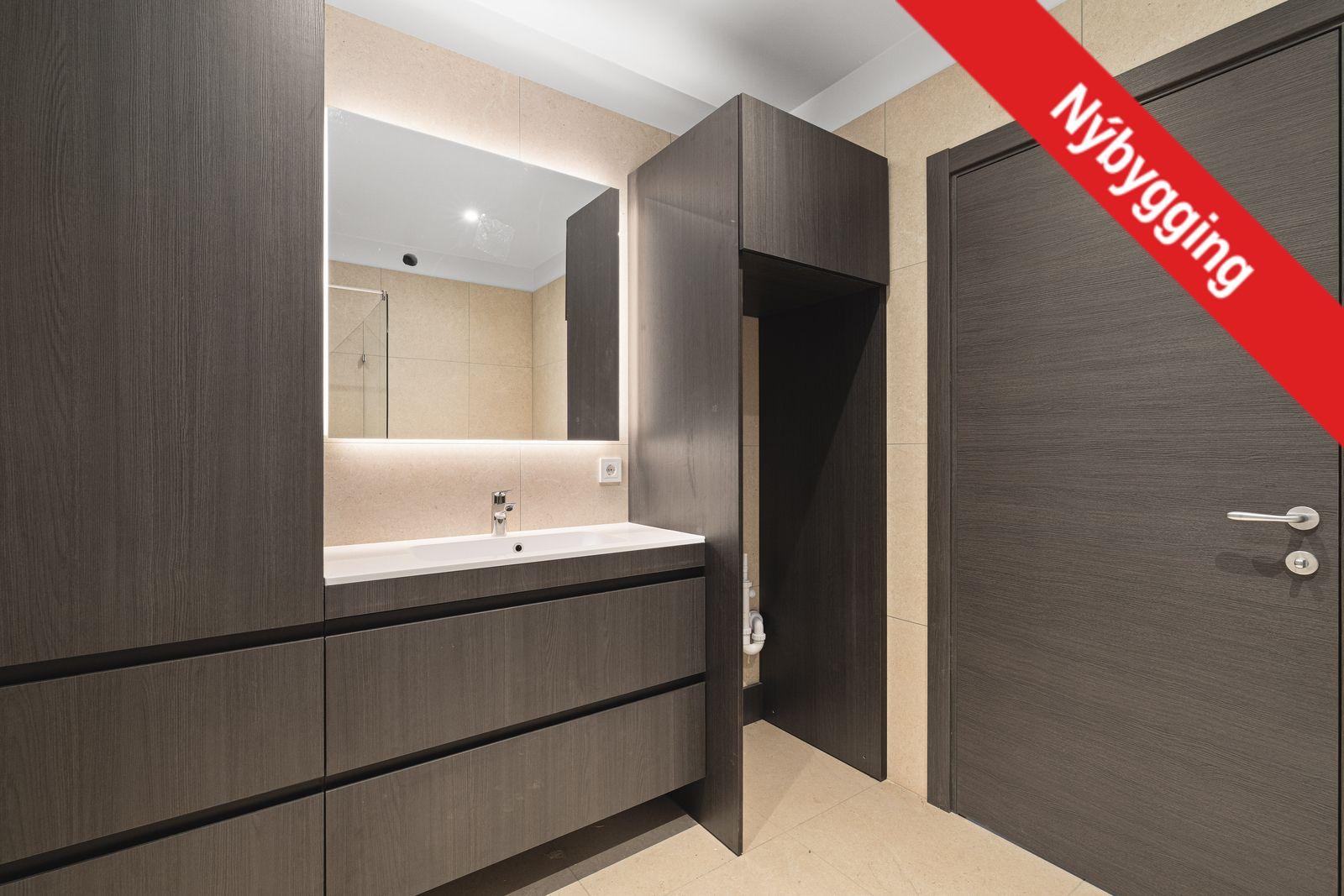 3 AM. Salerni er upphengt, handklæðaofn og sturta með glerskilrúmi. Gert er ráð fyrir þvottavél og þurrkara á baðherberginu með sérsmíðaðri innrétingu frá