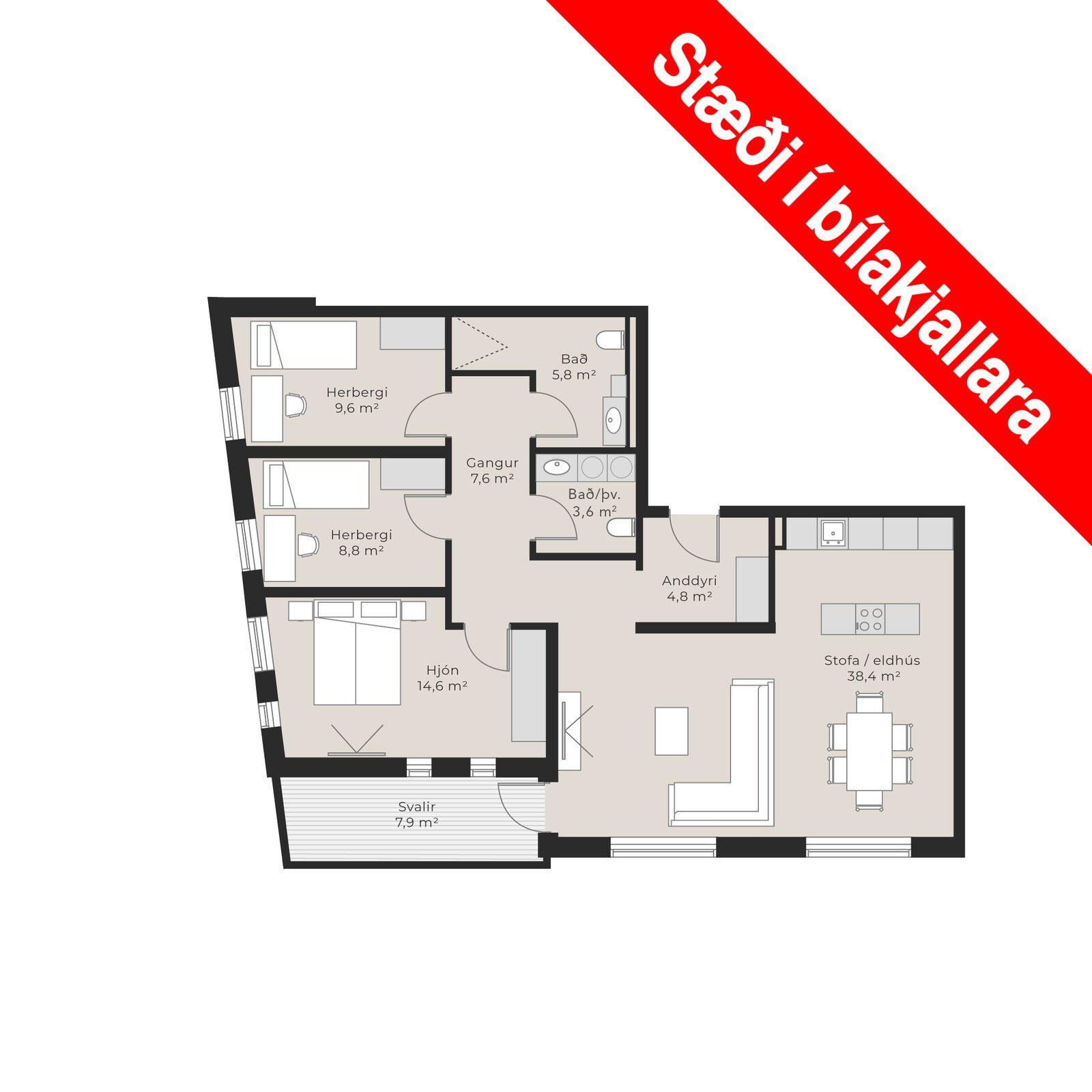 Ef bílastæði inn í lokuðum bílakjallara er metið á 8.000.000kr, þá er fermetraverð eignar 894.859þ.kr./m2 fyrir fullbúna nýja íbúð sem hægt er að flytja inn á kaupsamningsdegi.Nánari upplýsinga veitir: