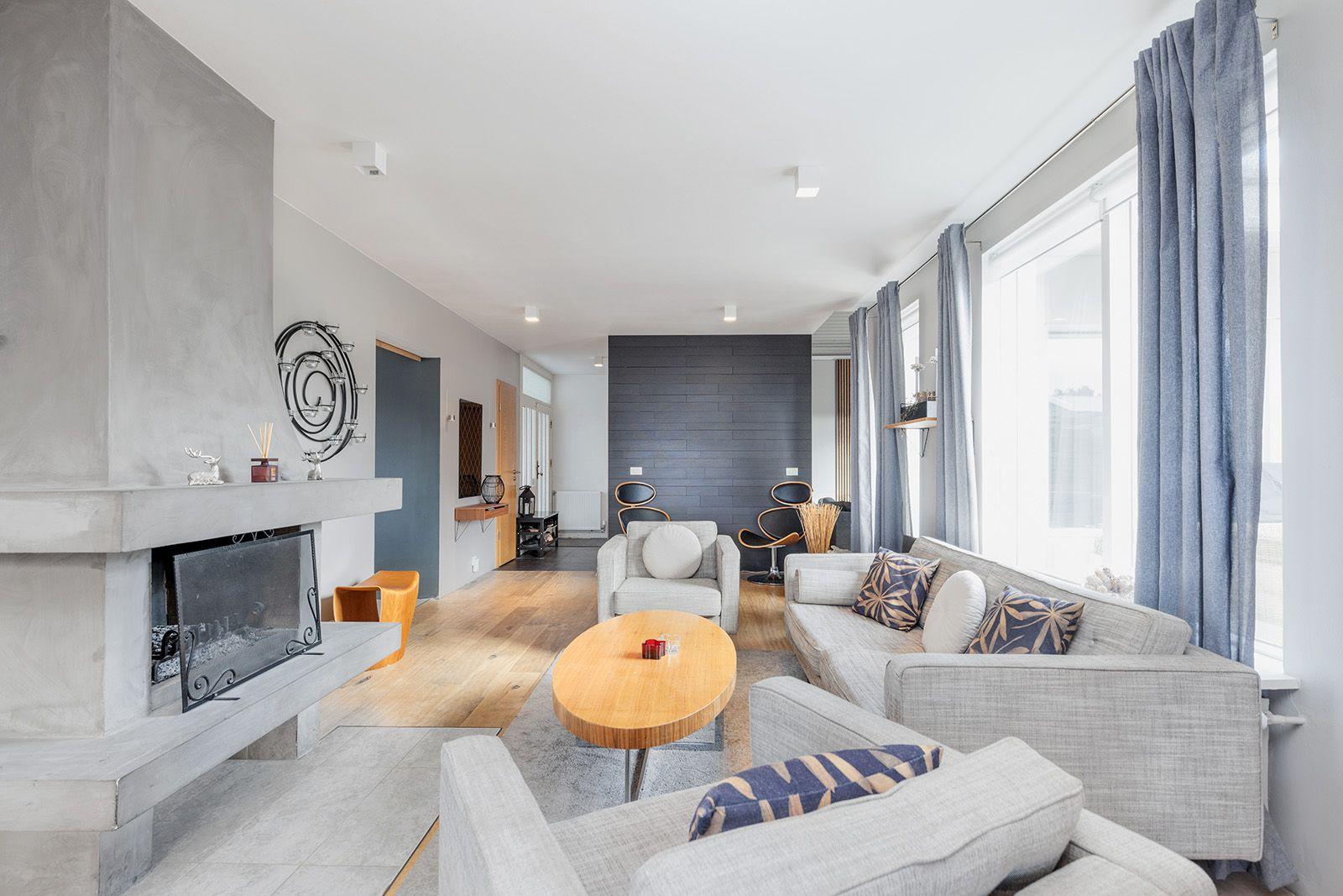 Stofa: Björt og rúmgóð stofa með glæsilegum arni. Parket á gólfi.