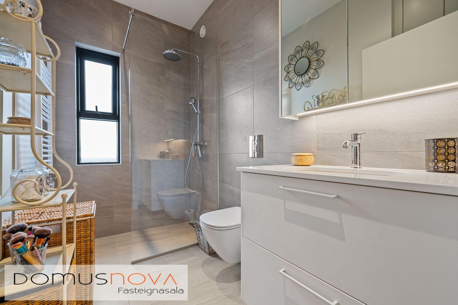 Baðherbergi - er flísalagt með 60x60 cm ljósgráum flísum frá EBSON á bæði gólf og hluti veggja. Baðherbergið er með vandaðri innréttingu með Quartz stein frá Technistone.  Tenging fyrir þvottavél og þurrkara er í innréttingu á baði.