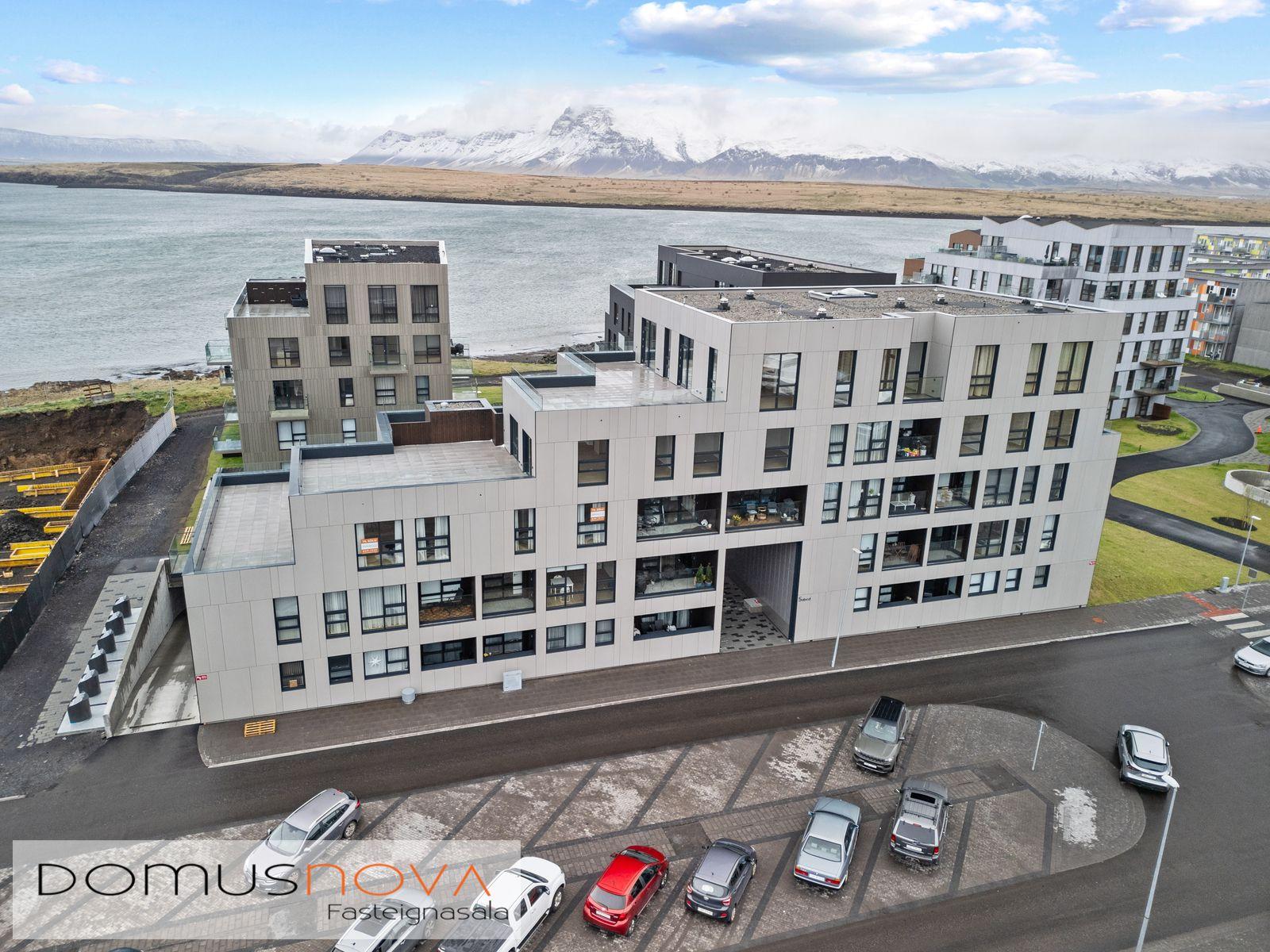 Stóra tveggja herbergja endaíbúð á fyrstu hæð með sérafnotareit og sjárvarsýn.