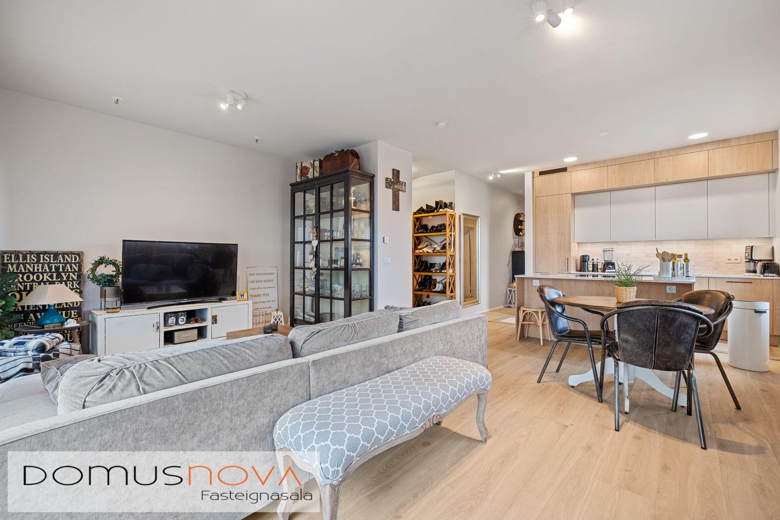 Eldhús - með eyju, góðu skápaplássi og nær innrétting til lofts.  Innrétting er vönduð með Quartz stein á borðplötum, innbyggð heimilistæki sem sýnd eru með eigninni frá AEG fylgja íbúðinni.