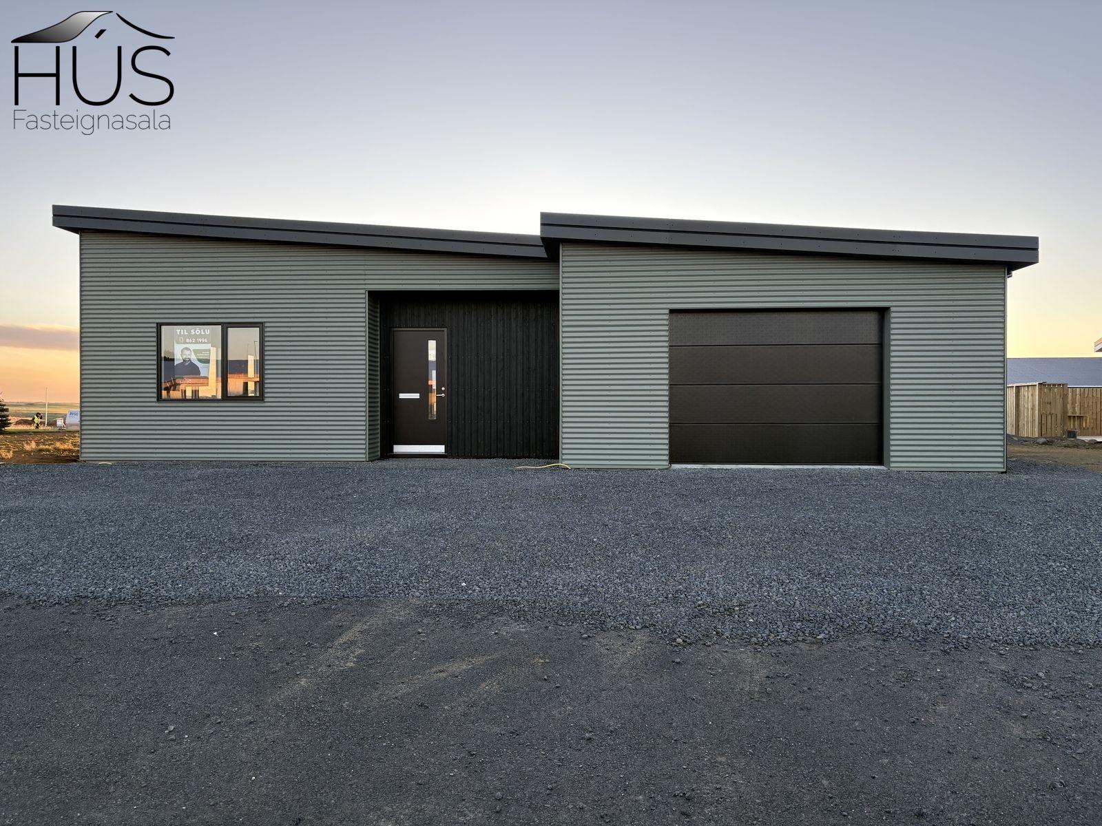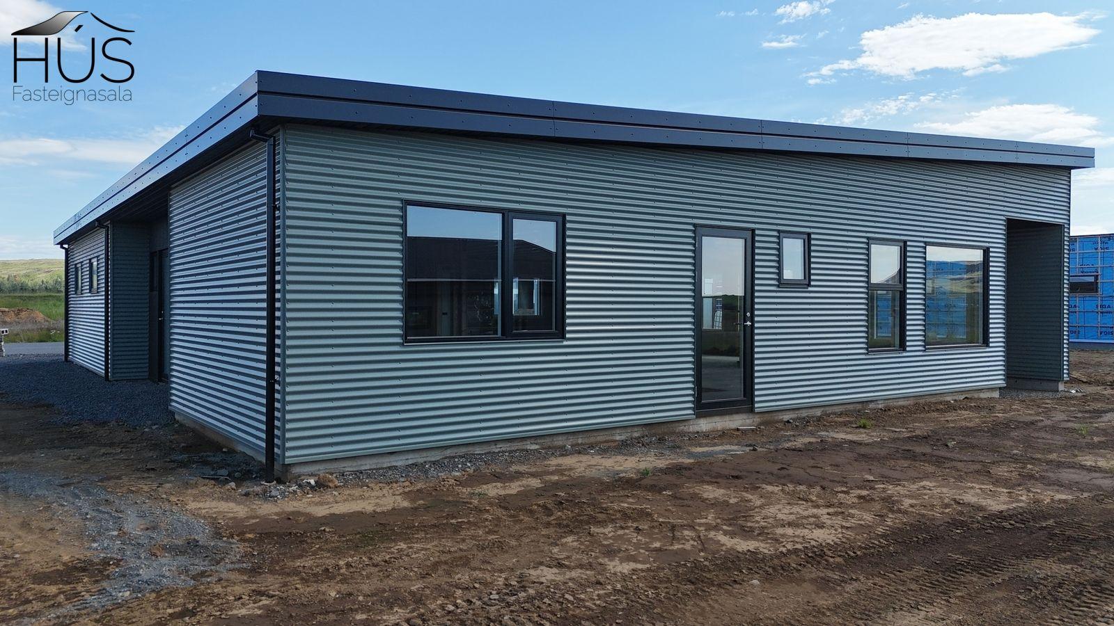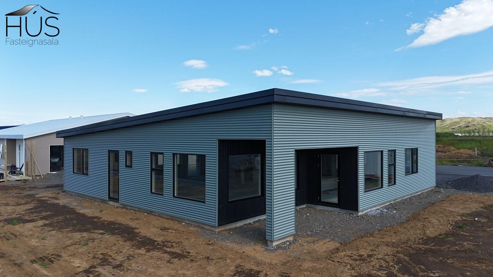 Húsið afhendist á byggingarstiginu fullbúið að utan en rúmlega fokhelt að innan skv. skilalýsingu byggingaraðila. Búið er að einangra og ganga frá rakasperru og rafmagnsgrind. Einnig er búið setja upp eldvarnarvegg milli íbúðar og bílskúrs. Búið er að taka inn rafmagn og heitt vatn. Hægt er að fá eignina afhenta lengra komna eftir nánara samkomulagi. Húsið er byggt úr timbri, klætt að utan með liggjandi báruáli og standandi timbur klæðning. Þak er niðurtekið kraftsperruþak með 4° þakhalla. Ofan á sperrur kemur lekta, 18 mm þakkrossviður og að lokum 2 lög af bræddum þakpappa. Vindskeiðar eru úr lituðu áli og álrennur innfeldar. Útihurðir og gluggar eru ál-tré
