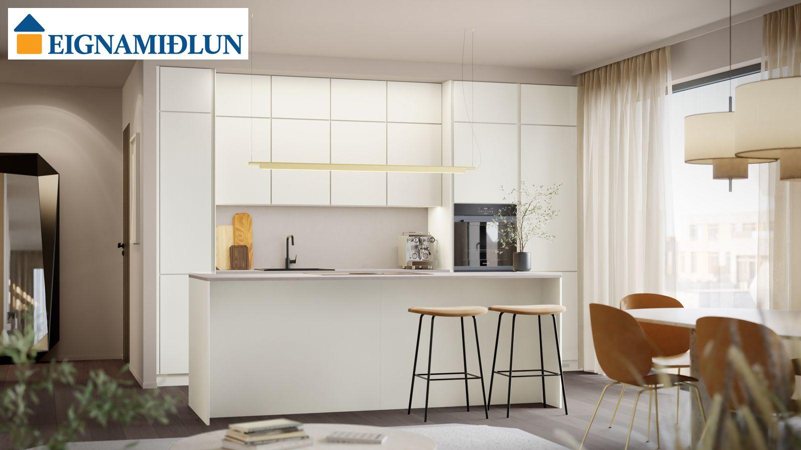 Innréttingaþema er Safír harmónía (500). Val þegar kemur að innréttingum og frágangi. Fimm innréttingaþemu frá Nobilia (Lser). Steinn á borðum. Vönduð eldhústæki frá Siemens, Elica og Bora.