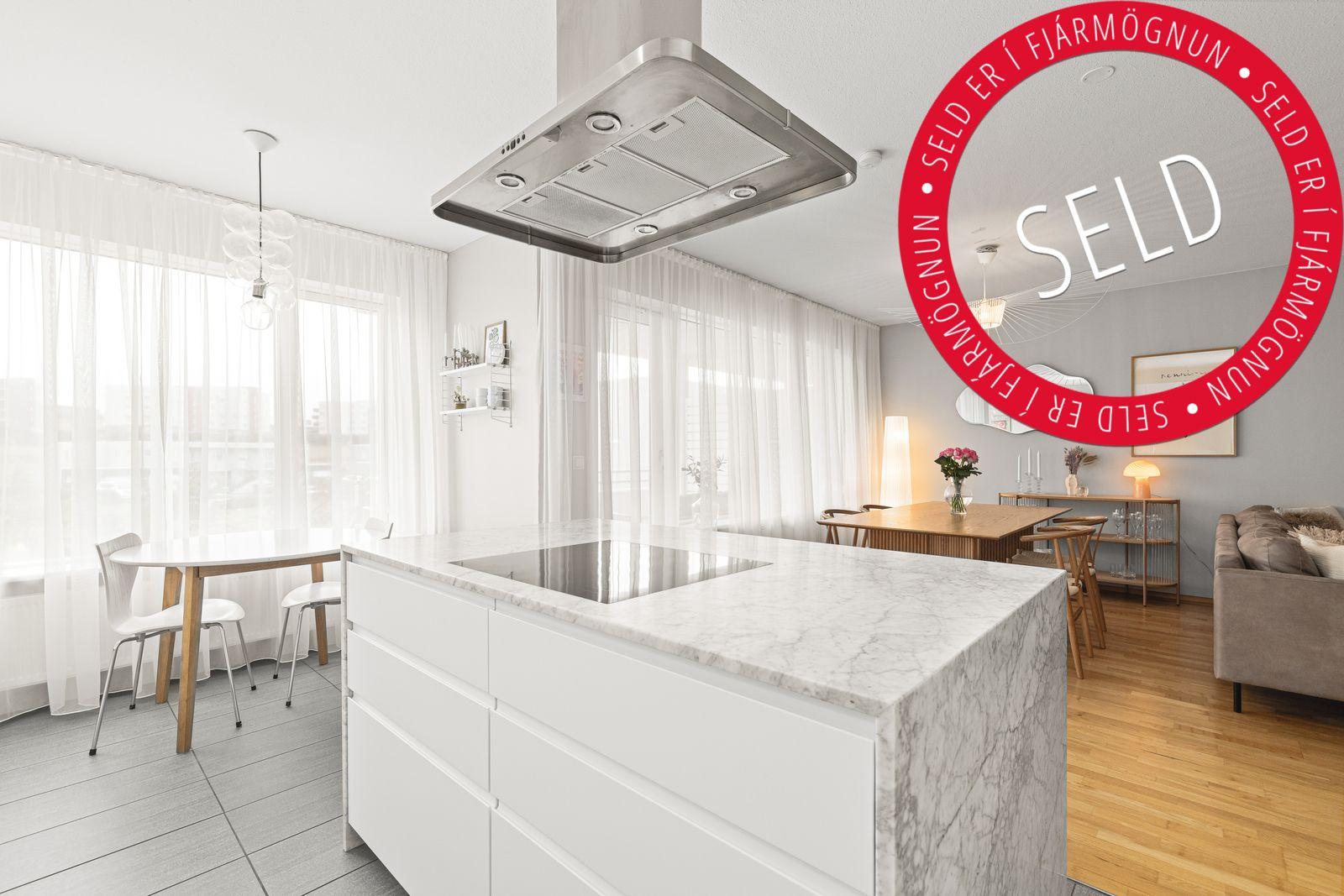 Íbúðin er skráð 114,6 fm skv. HMS, þar af 7,4 fm geymsla í kjallara. Glæsilegt eldhús sem nýlega var endurnýjað að mestu með marmara steini á borði og á eyju. Opið og bjart alrými með útsýni, þvottahús innan íbúðar og rúmgóðar svalir sem snúa til suðvesturs. Rafhleðslustöð í bílageymslu og næg stæði eru fyrir framan húsið. Þriðja svefnherberginu var nýlega bætt við úr hluta af stofurými, en auðvelt er að fjarlægja vegginn og opna rýmið aftur.