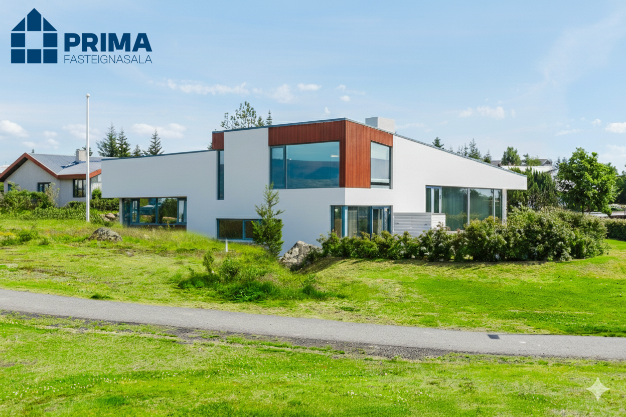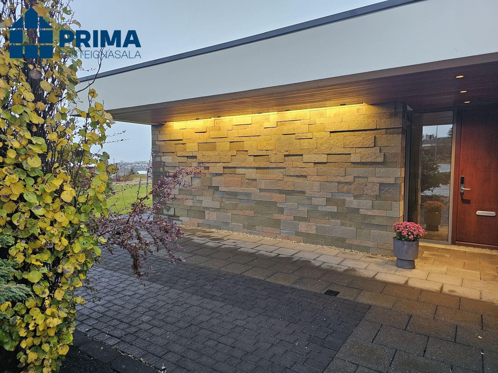 Einstaklega fallegt og vandað hús sem vert er að skoða. Húsið er staðsteypt, einangrað að utan og klætt með múrklæðningu og setrusviðarklæðningu. Húsið hefur fengið