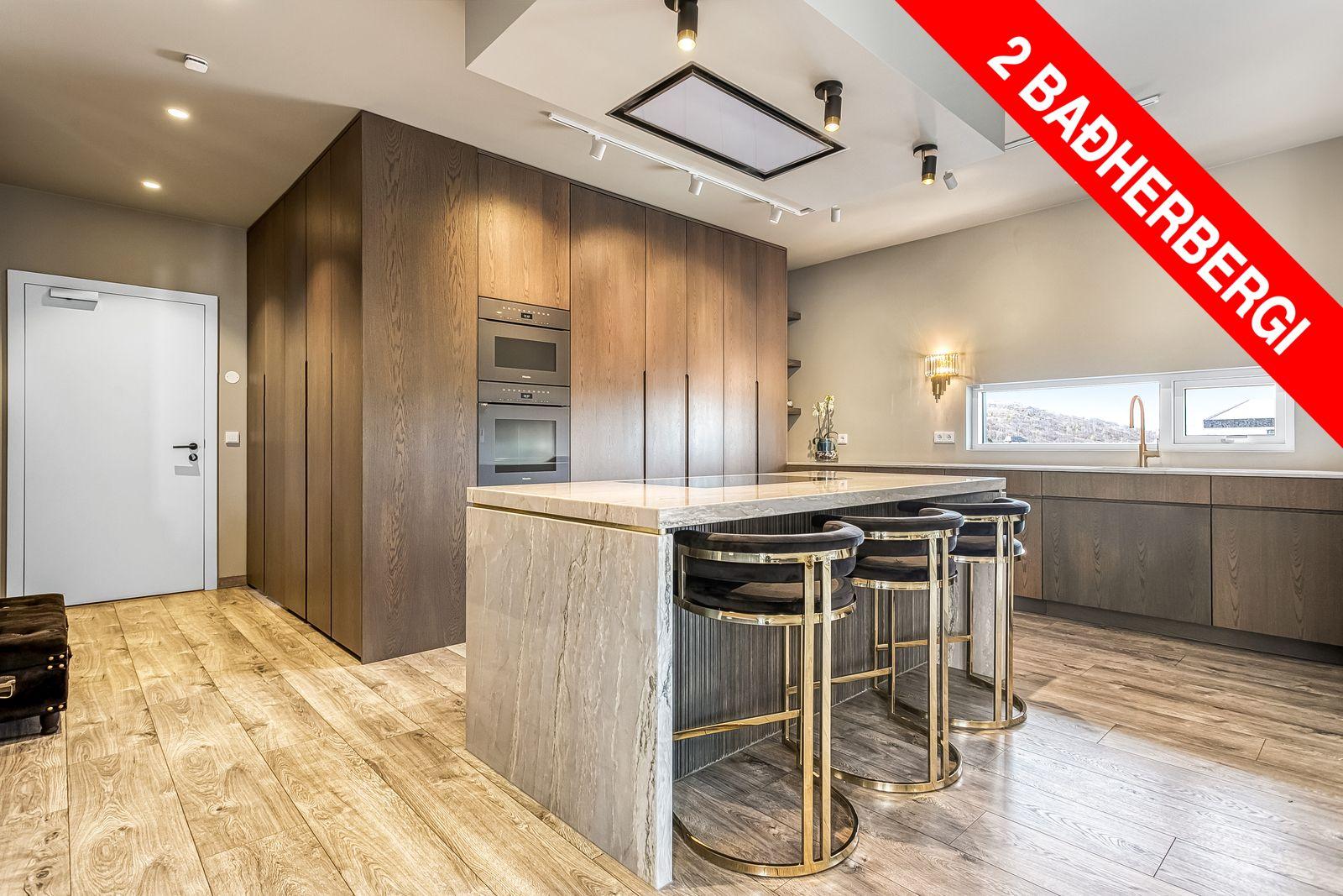 Eldhús: Gott skápa og borðpláss ásamt fallegri eyju, búr skápur með lýsingu. Innréttingin er frá Fagus. Borðplötur eru sérsmíðaðar úr gráæðóttum Quartzite náttúrustein. Undirlímdur gull-litaður vaskur af gerðinni Gessi frá Ebson, span helluborð á eyju og 2 innbyggðir ofnar frá Miele. innbyggður ísskápur, frystir og uppþvottavél.