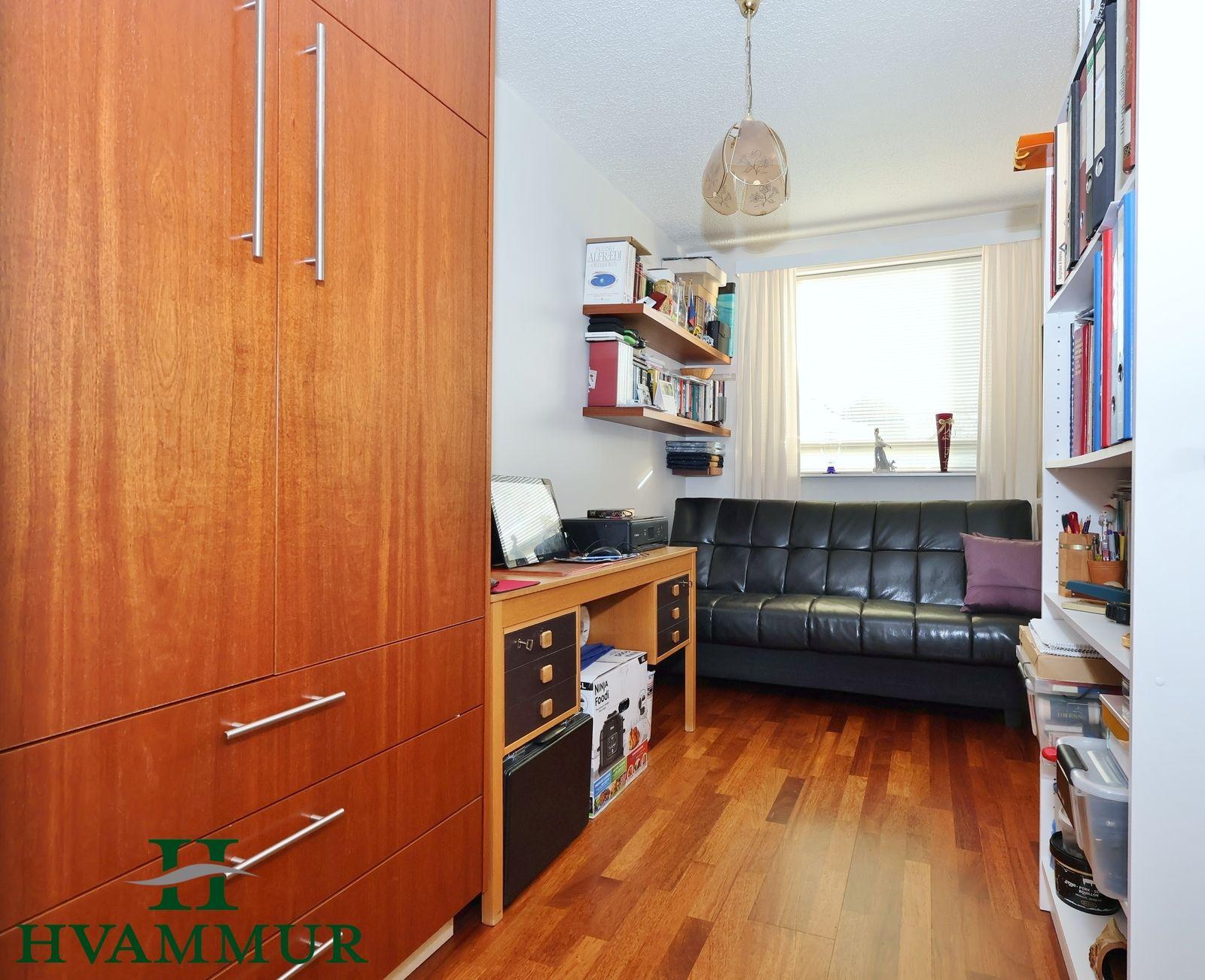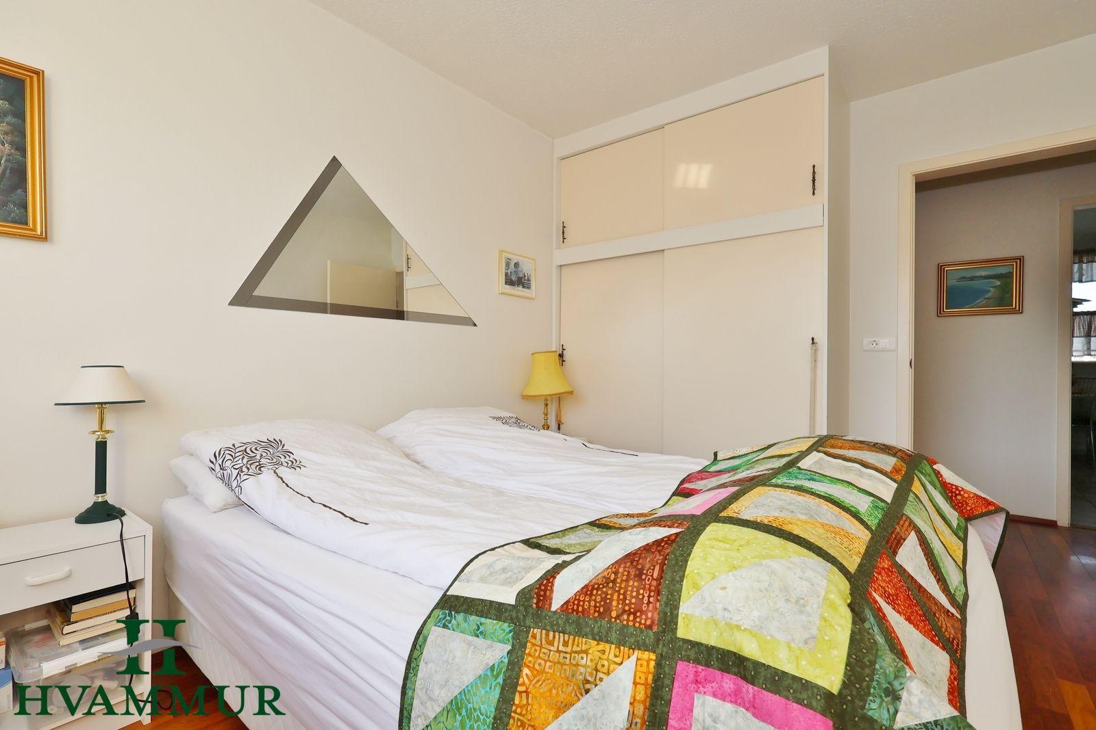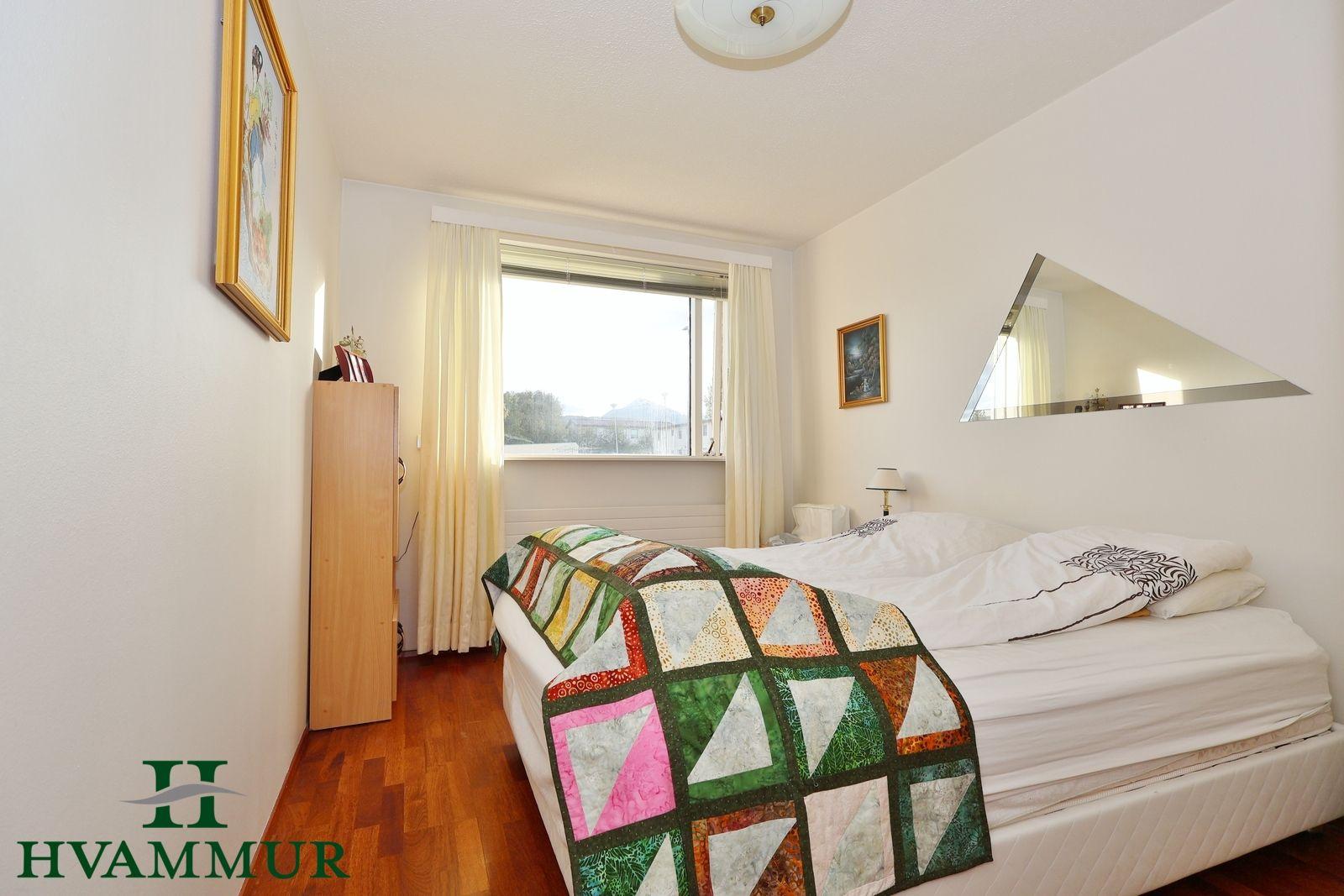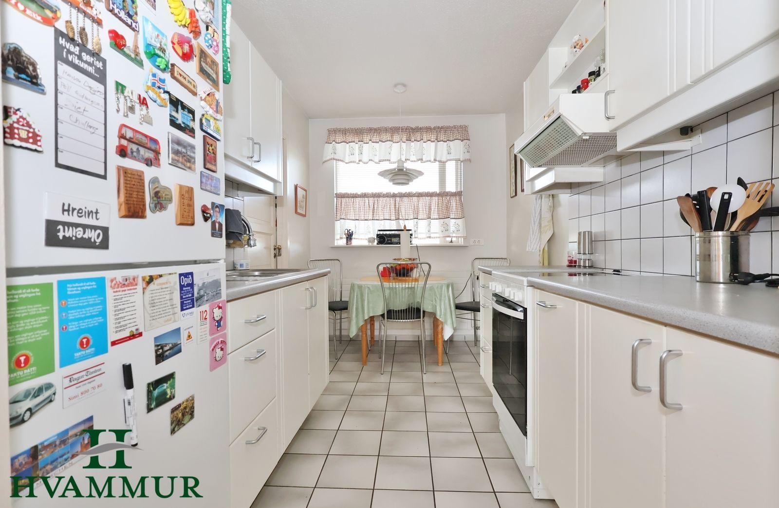 Forstofa er með flísum á gólfi og fataskáp sem og opnu fatahengi. Eldhús er með ljósri innréttingu og góðum borðkrók. Flísar eru á gólfi. Stofa er með parketi á gólfi. Úr eldhúsi er gengið út á svalir er snúa til vesturs. Svefnherbergi eru tvö bæði með parketi og fataskáp. Baðherbergi er með ljósri innréttingu, sturtuklefa og wc. Dúkur á gólfi og hluta veggja. Þvottahús er inn af eldhúsi. Þar eru hillur og borðplata. Tengi er fyrir vask. Flísar á gólfi og opnanlegur gluggi. Geymsla, mjög rúmgóð geymsla í sameign með hillum.