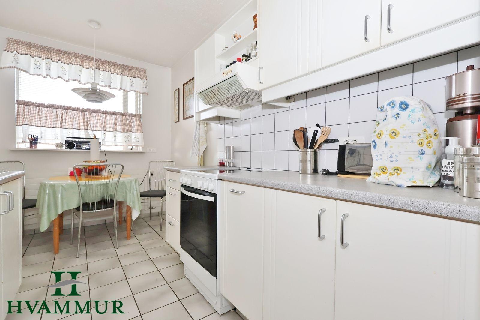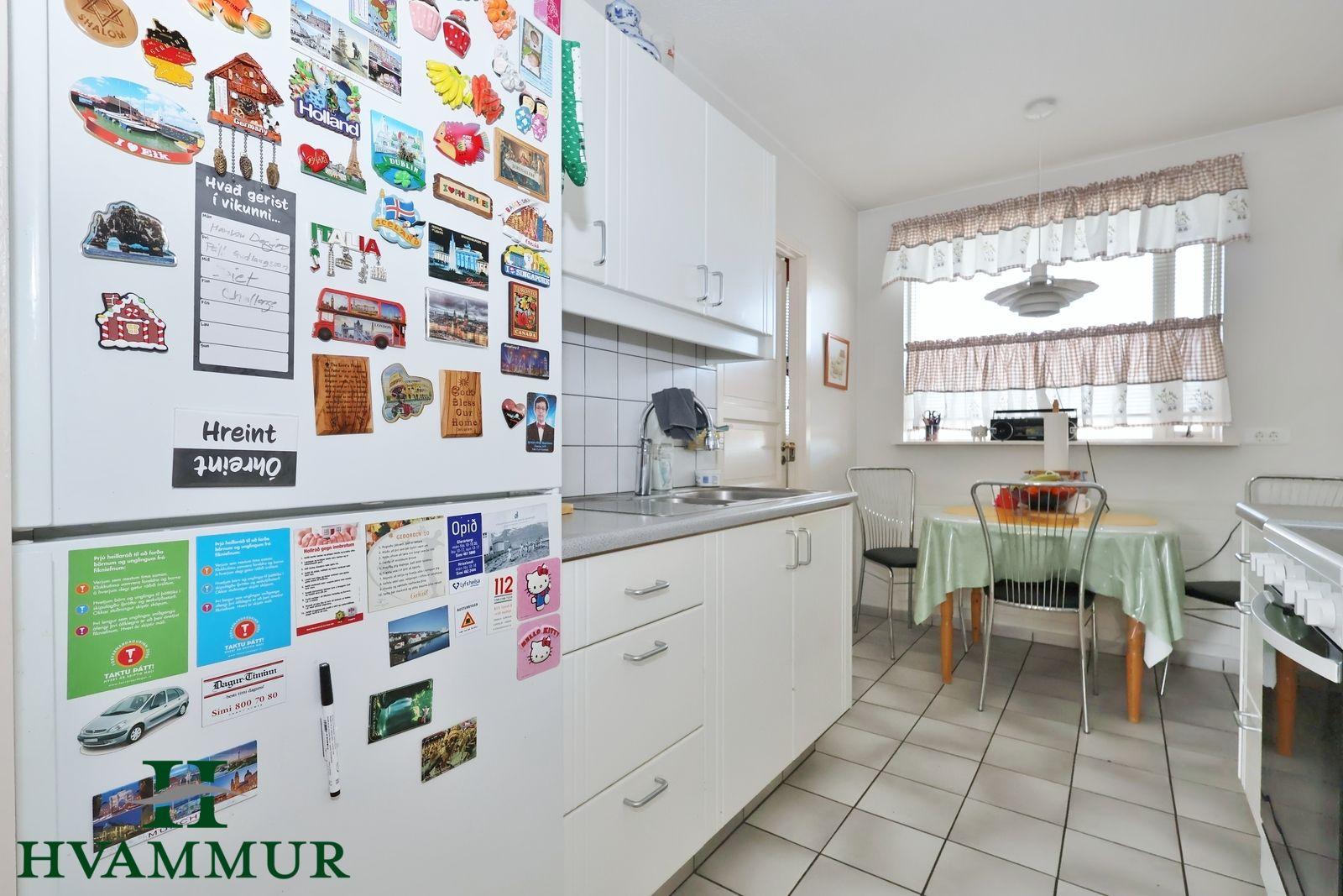 Eignin skiptist í forstofa, eldhús, stofu, tvö svefnherbergi, baðherbergi, þvottahúsi og geymslu í sameign.