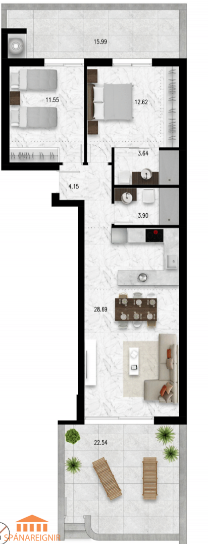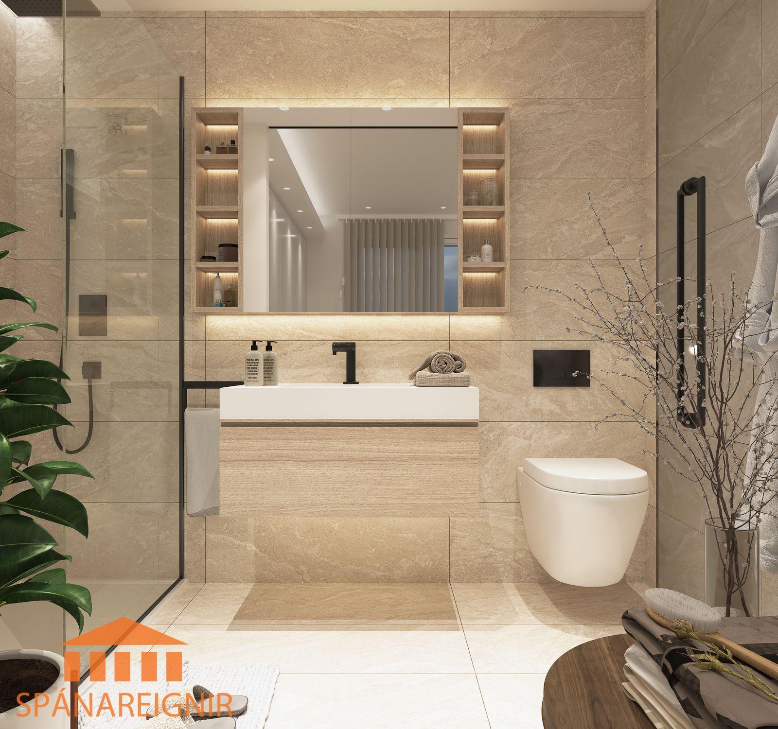 3ja herbergja íbúð, tvö svefnherbergi og tvö baðherbergi. Verð frá 320.000 Evrum (ISK 45.700.000) + kostn. við kaupinÁ sama stað er líka hægt að fá 4ra herbergja íbúð, þrjú svefnherbergi og tvö baðherbergi. Verð frá 369.000 Evrum (ISK 53.500.000) + kostn. við kaupin