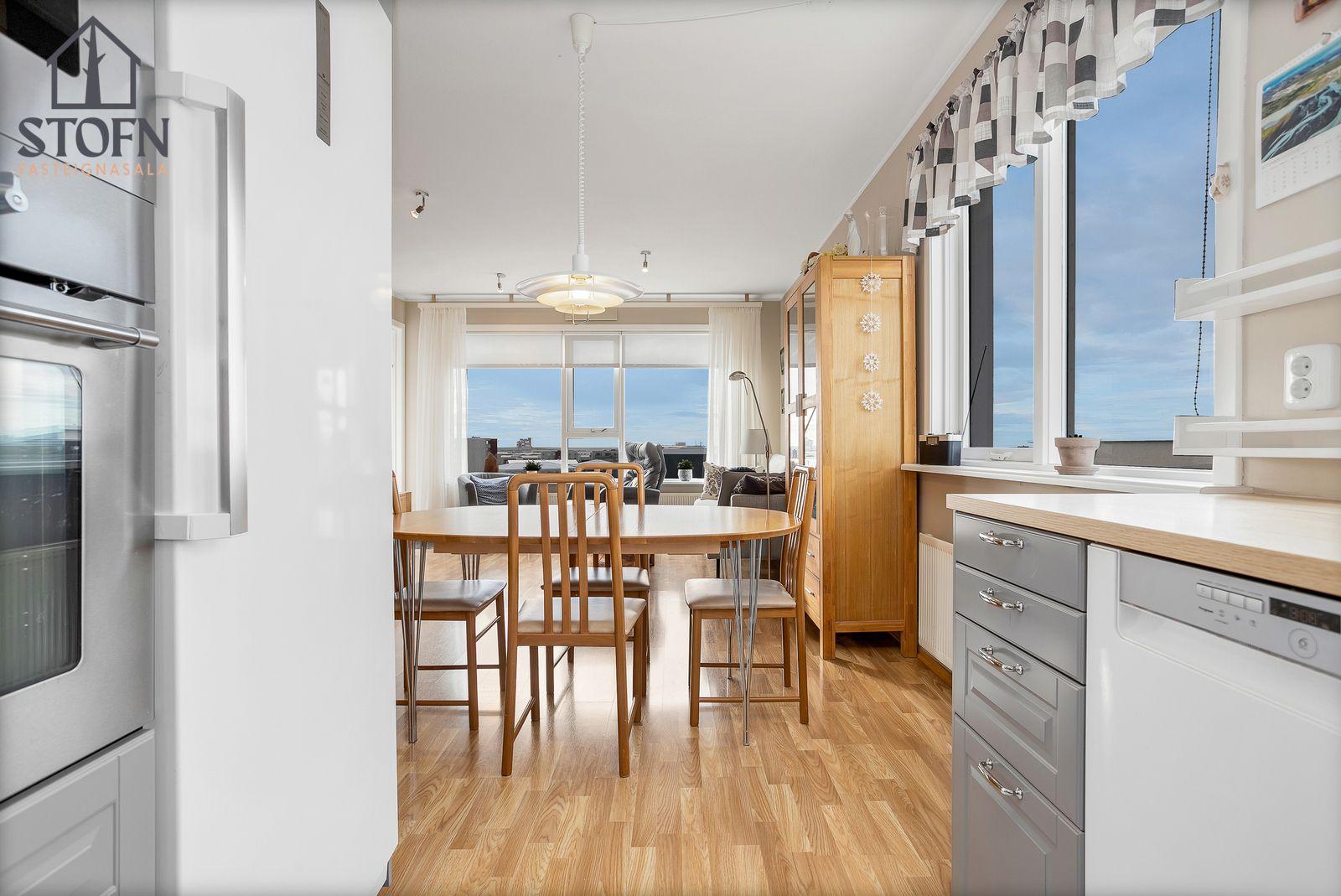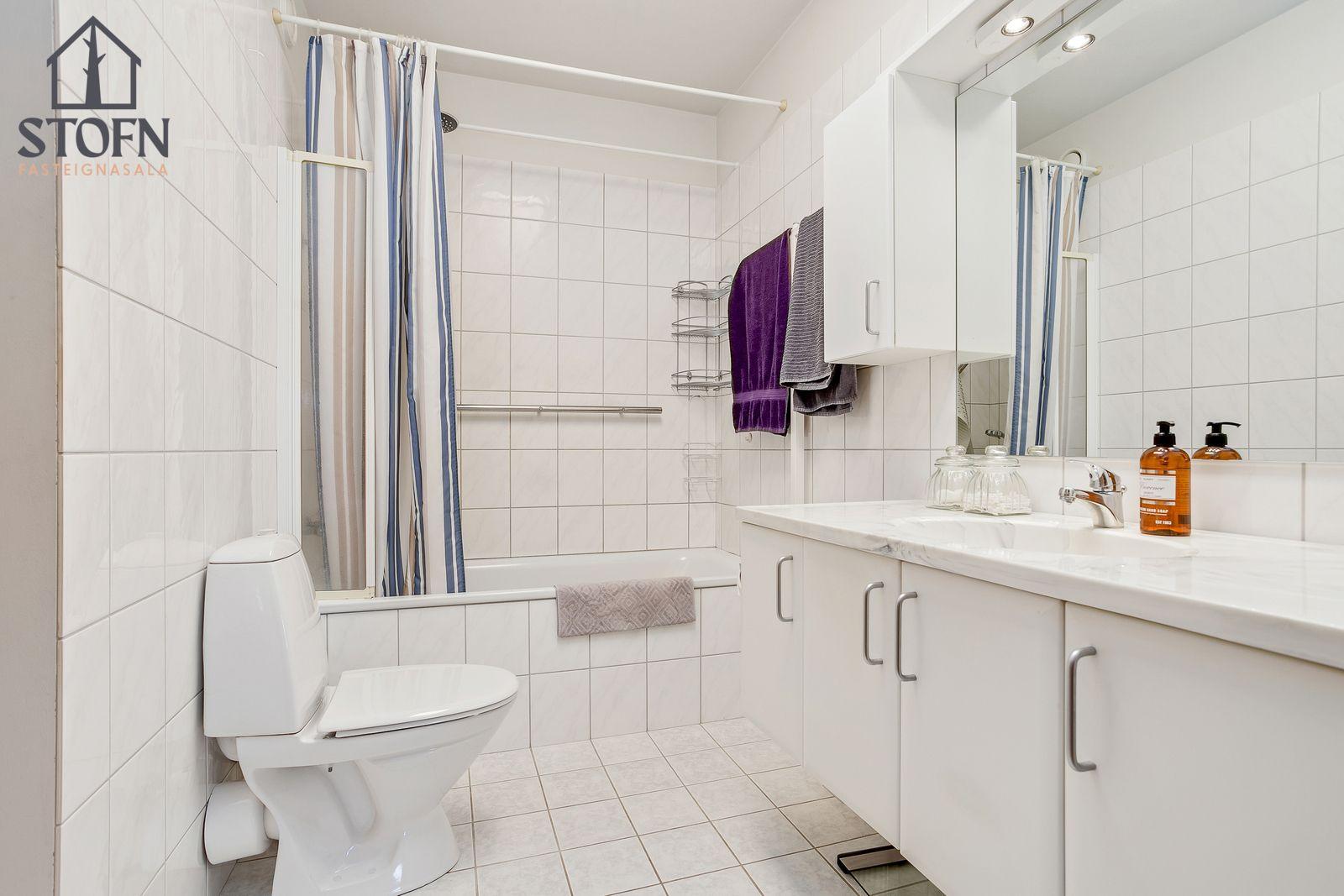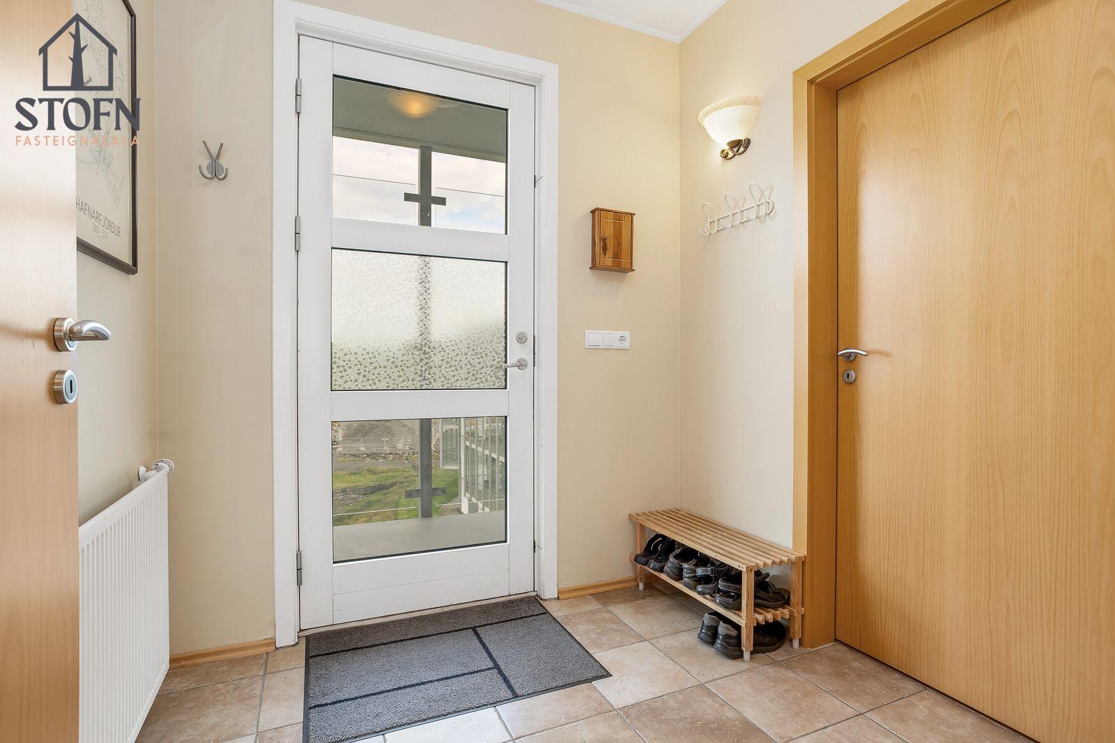 Forstofa er með flísum á gólfi og skápum. Hol er með parketi á gólfi. Stofa er með parketi á gólfi og þaðan er útgengt á suðursvalir með svalalokun og skemmtilegu útsýni til suðvesturs. Eldhús er með korkflísum á gólfi, viðarinnrétting og veggplötur á milli efri og neðri skápa. Svefnherbergin eru þrjú og eru með parketi á gólfum og skápar í tveimur af þrem herbergjum. Baðherbergi er með flísar á gólfi, wc, skápar undir vask og yfir ásamt baðkari með sturtu. Þvottahús er með flísar á gólfi ásamt vinnuborði, vask, hillum og snúrum. Geymsla er í sameign. Hjóla- og vagnageymsla er í sameign. Stæði í bílageymslu í bílakjallara.
