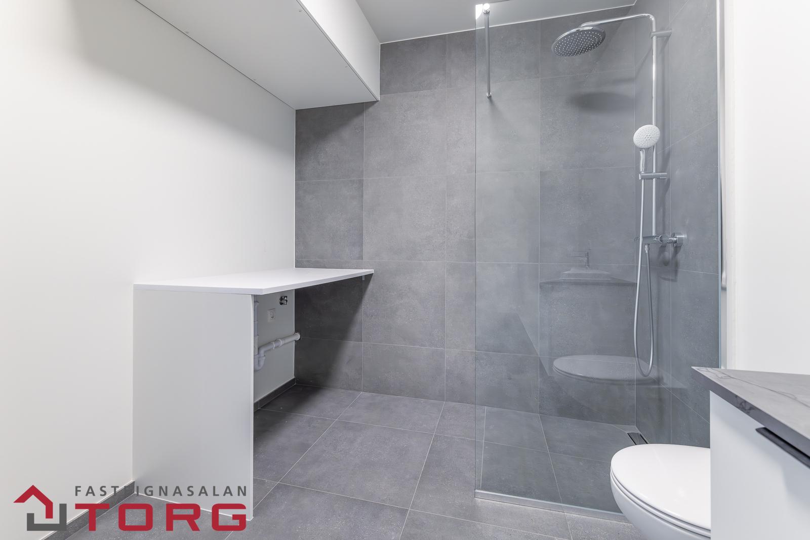 Gólf baðherbergis og hluti veggja á baðherbergi eru flísalagðir á 2 eða 3 veggi, upp að 2,1m. Öll salerni eru upphengd og innbyggð í vegg. Á baði er handklæðaofn. Sturta er í öllum íbúðum og sturtubotn flísalagður.