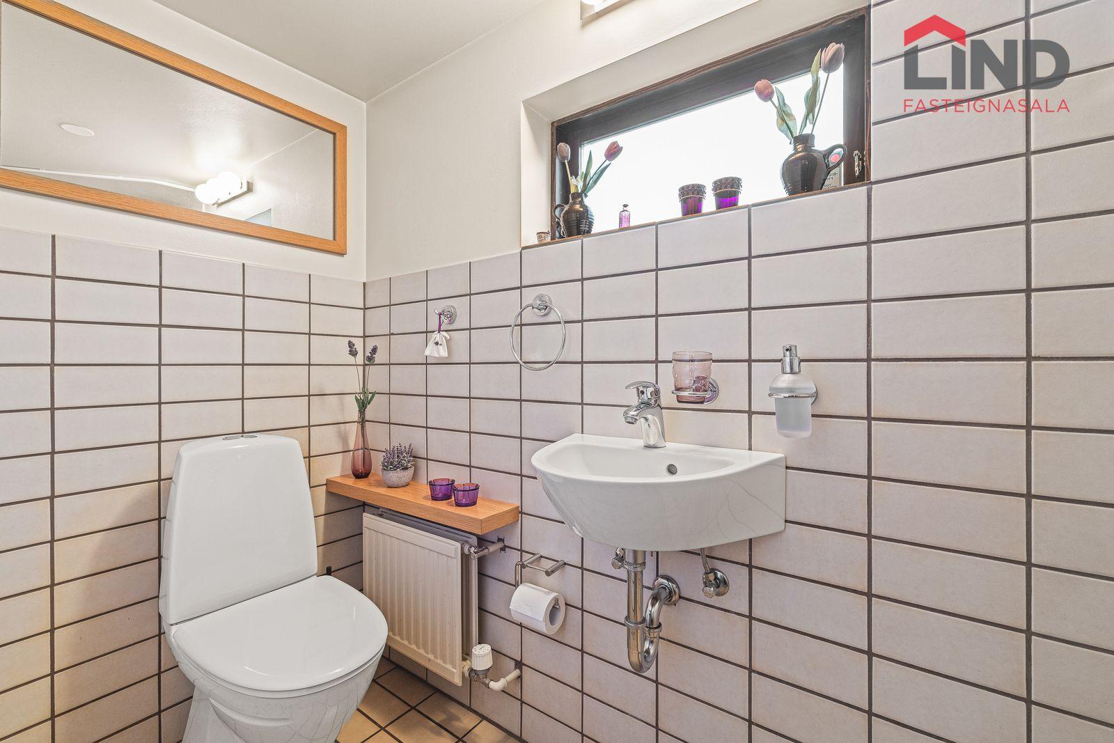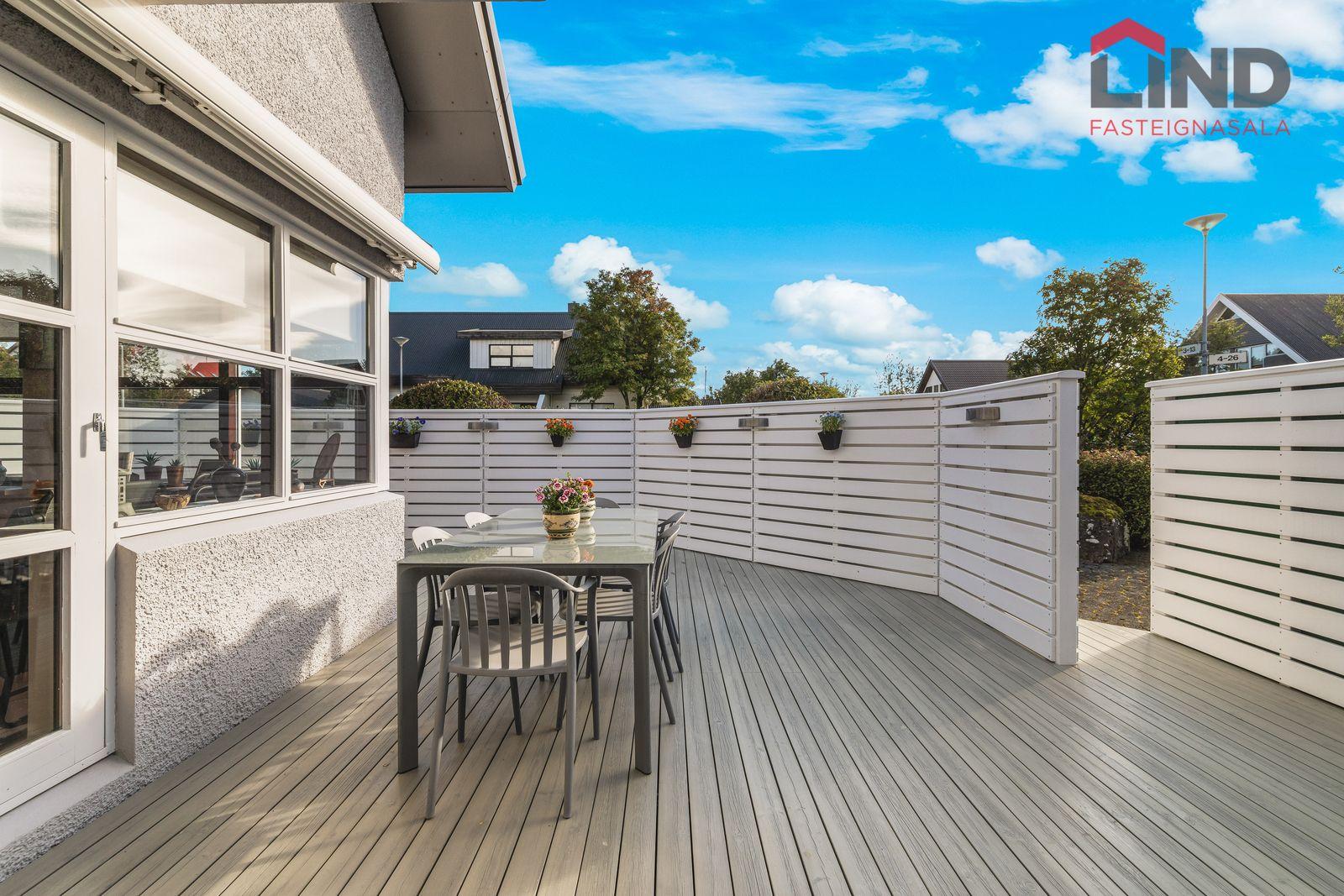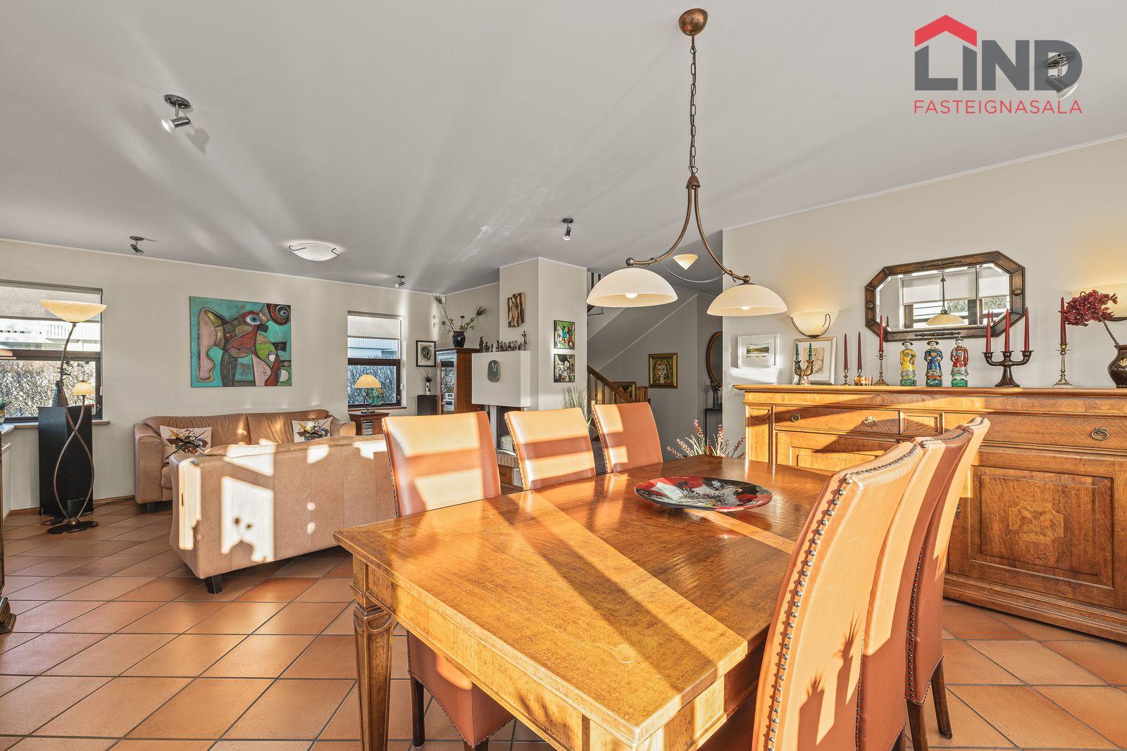 Nánari lýsing: Neðri hæð: Forstofa: Flísar á gólfi og skápar. Eldhús: Með flísum á gólfi og fallegri viðar eldhúsinnréttingu. Flísar á milli skápa, bakaraofn, keramik helluborð og tengi fyrir uppþvottavél. Borðkrókur og gluggar til suðurs og austurs. Stofa: Er rúmgóð, með flísum á gólfi og fallegum arni. Gluggar eru til suðurs, vesturs og norðurs. Útgengi frá stofu á verönd. Verönd: Er rúmgóð og afgirt. Falleg kvöldlýsing í grindverki og markísa sem nær yfir hluta af verönd. Virkilega skjólgóð og falleg verönd sem hefur verið vel við haldið. Svefnherbergi I: Með teppi á gólfi, skápum og glugga til norðurs. Þvottaherbergi: Er rúmgott með flísum á gólfi og góðri innréttingu með vinnuborði og vaski. Tenglar fyrir þvottavél/þurrkara með hækkun fyrir betri vinnuhæð ásamt stæði fyrir auka kæliskáp/frystiskáp. Opnanlegur gluggi til austurs og útgengi á stétt við bílskúr. Baðherbergi I: Með flísum á gólfi og hluta veggja. Sturta, salerni og vaskur ásamt glugga til norðurs.