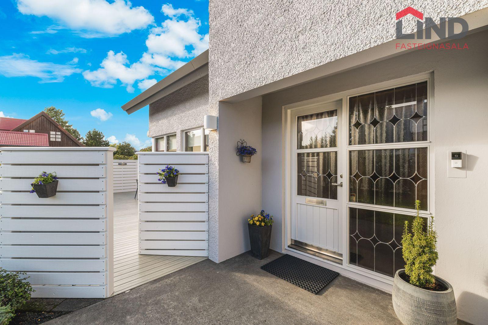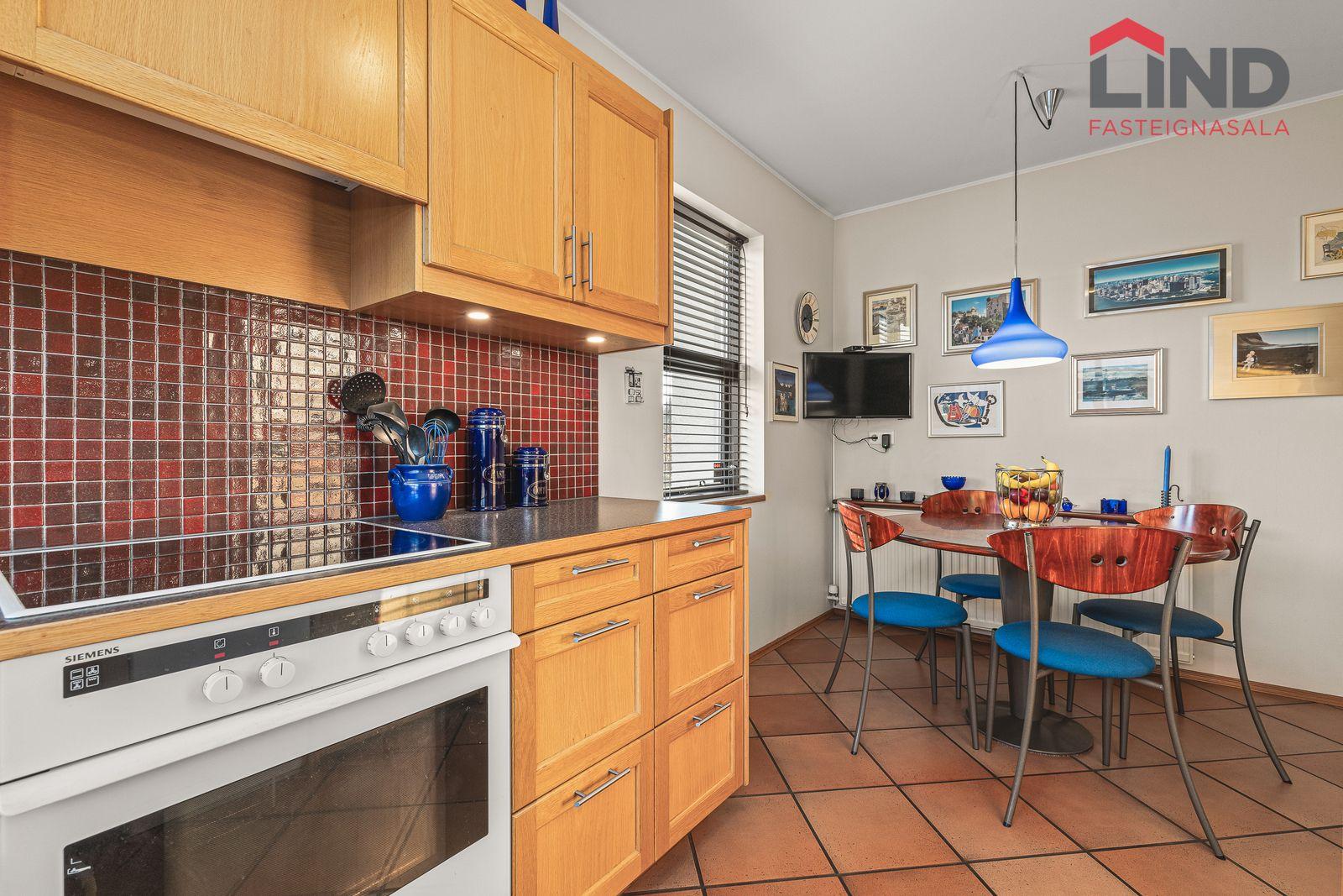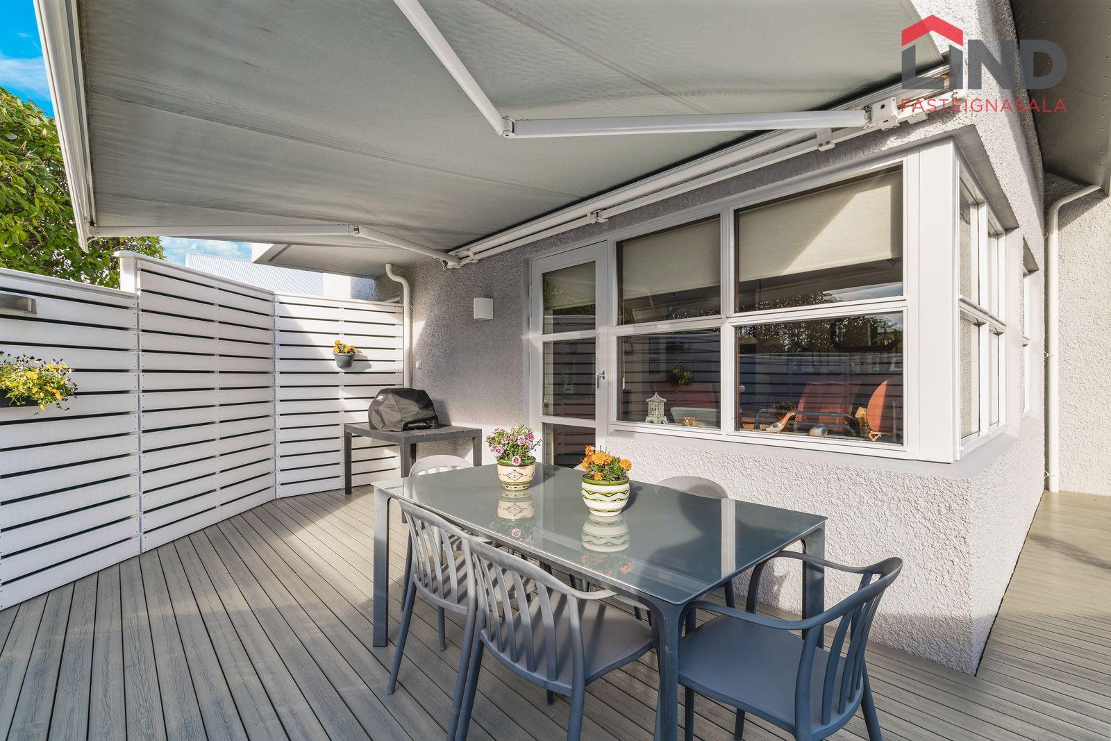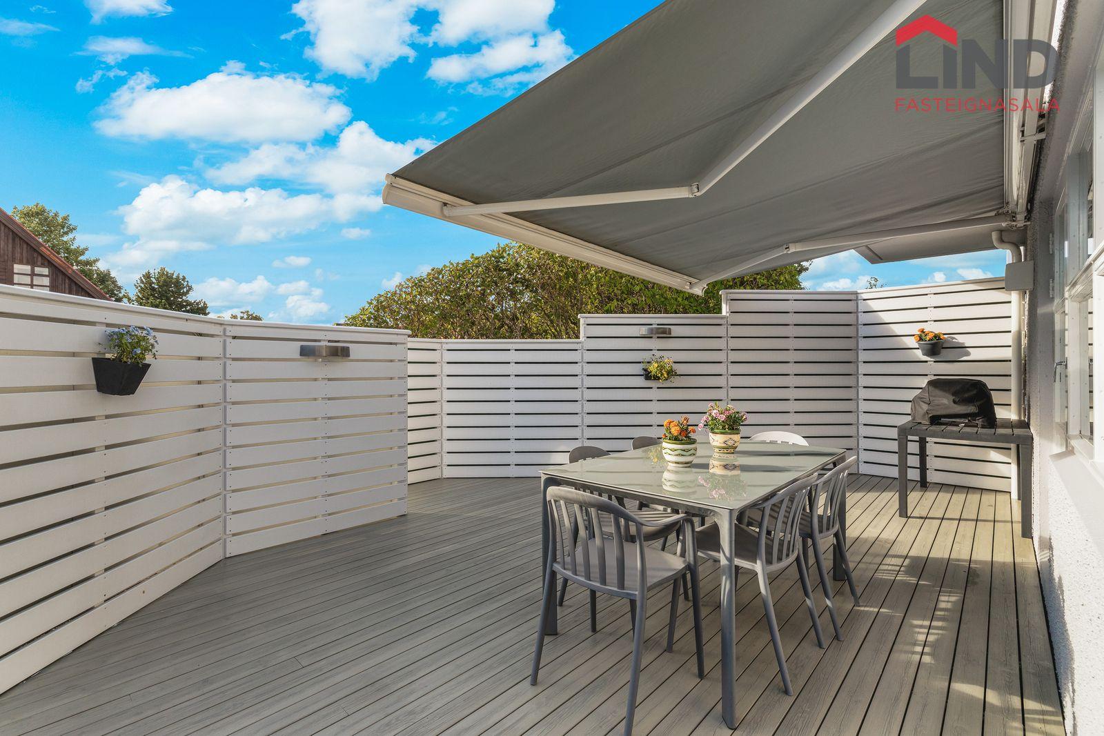 Nánari lýsing: Neðri hæð: Forstofa: Flísar á gólfi og skápar. Eldhús: Með flísum á gólfi og fallegri viðar eldhúsinnréttingu. Flísar á milli skápa, bakaraofn, keramik helluborð og tengi fyrir uppþvottavél. Borðkrókur og gluggar til suðurs og austurs. Stofa: Er rúmgóð, með flísum á gólfi og fallegum arni. Gluggar eru til suðurs, vesturs og norðurs. Útgengi frá stofu á verönd. Verönd: Er rúmgóð og afgirt. Falleg kvöldlýsing í grindverki og markísa sem nær yfir hluta af verönd. Virkilega skjólgóð og falleg verönd sem hefur verið vel við haldið. Svefnherbergi I: Með teppi á gólfi, skápum og glugga til norðurs. Þvottaherbergi: Er rúmgott með flísum á gólfi og góðri innréttingu með vinnuborði og vaski. Tenglar fyrir þvottavél/þurrkara með hækkun fyrir betri vinnuhæð ásamt stæði fyrir auka kæliskáp/frystiskáp. Opnanlegur gluggi til austurs og útgengi á stétt við bílskúr. Baðherbergi I: Með flísum á gólfi og hluta veggja. Sturta, salerni og vaskur ásamt glugga til norðurs.