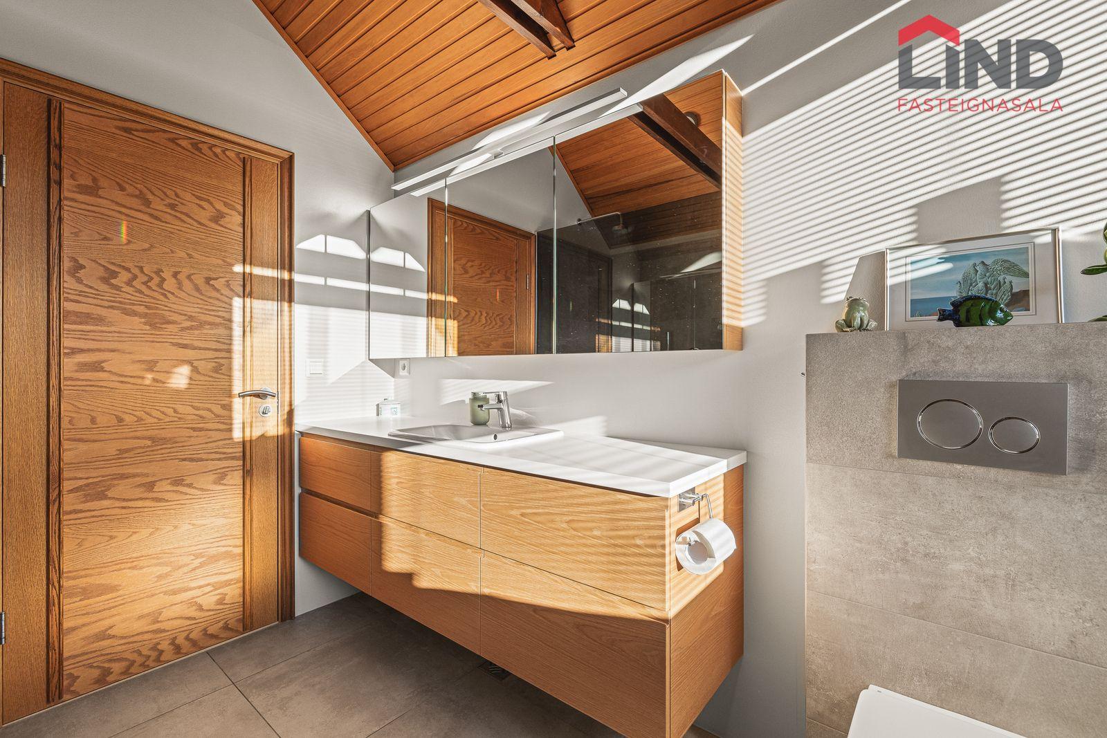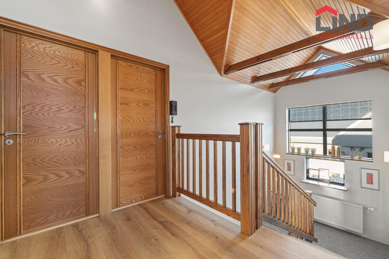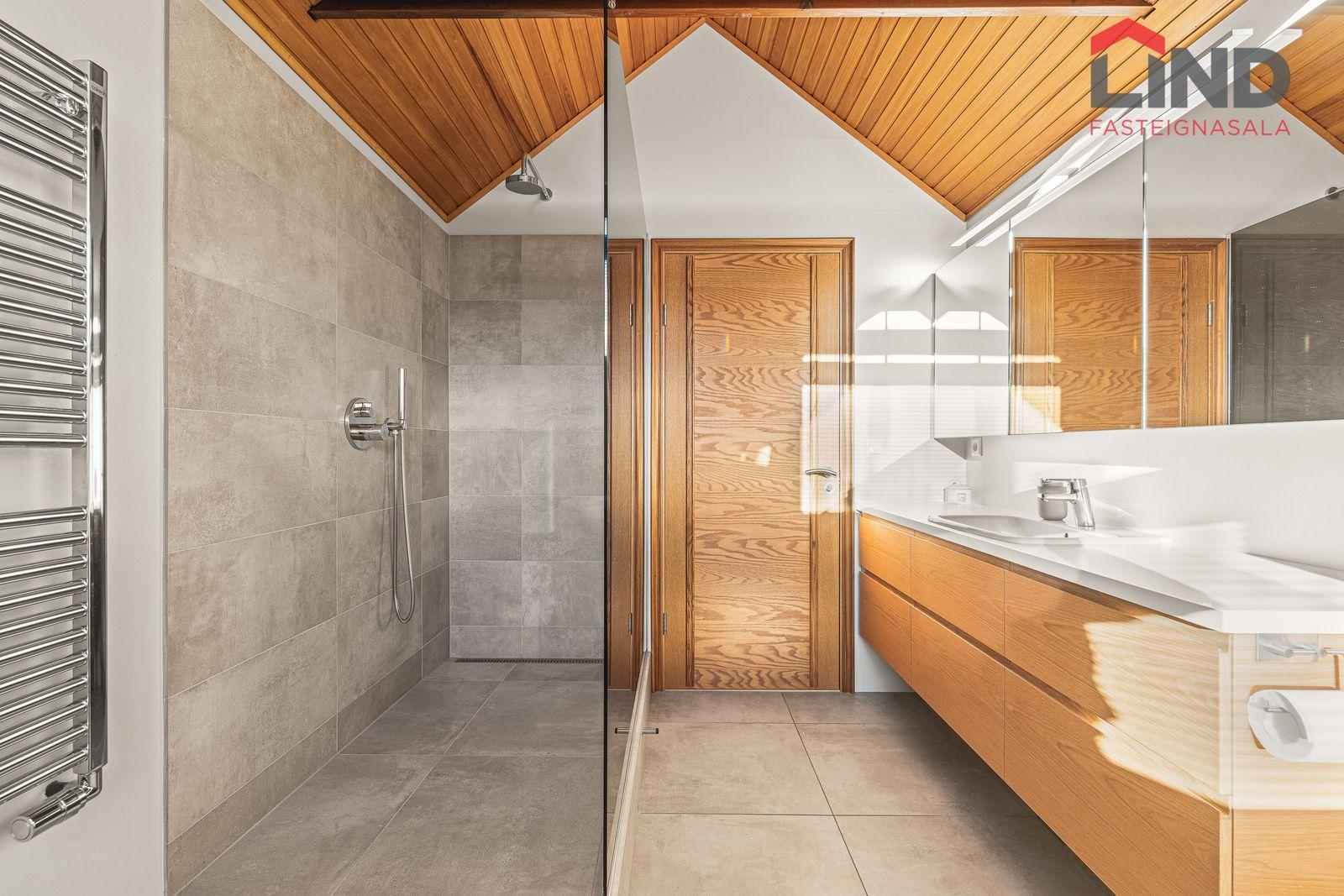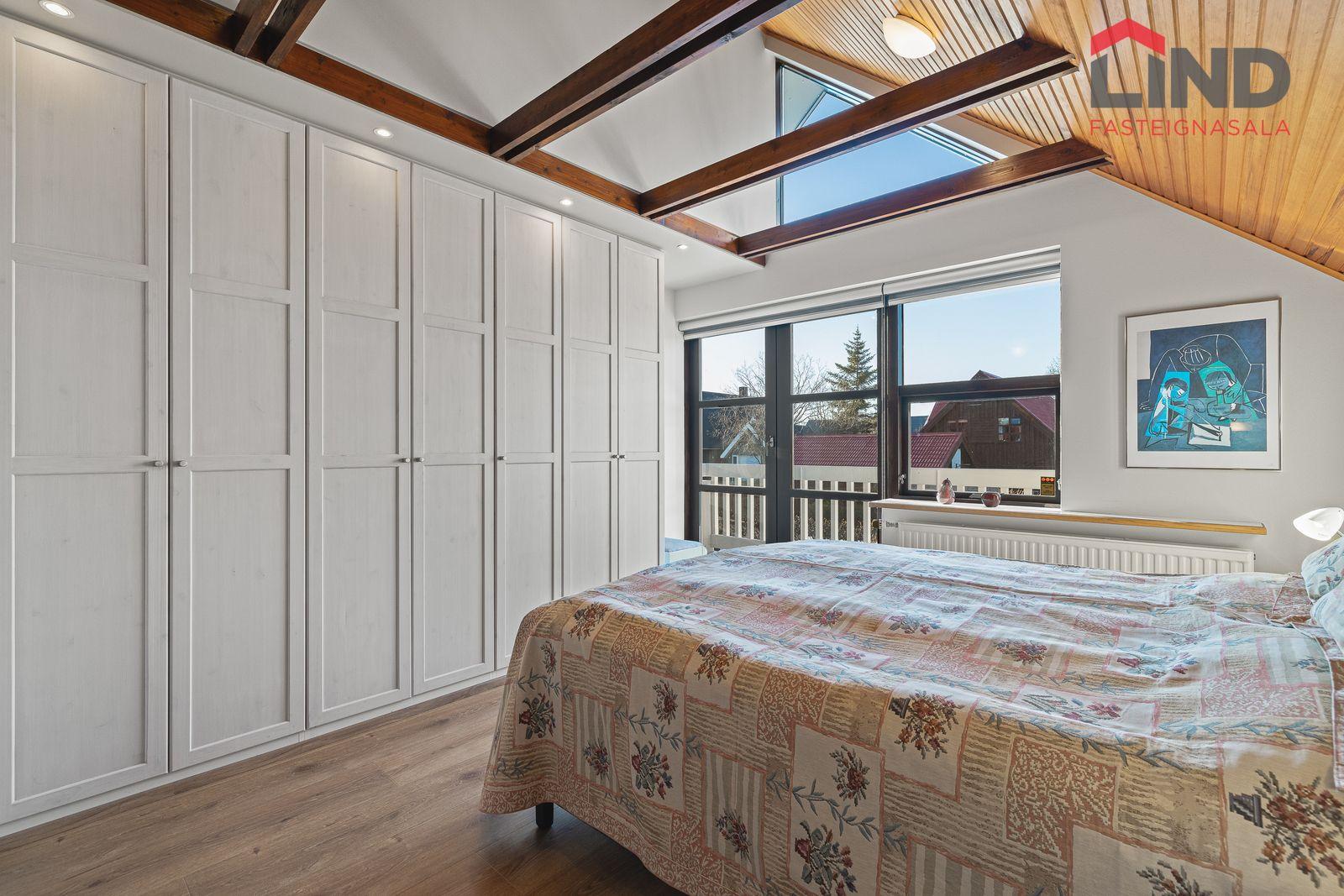 Efri hæð: Gengið upp fallegan teppalagðan stiga með glugga til norðurs. Sjónvarpsstofa (hægt að loka af og bæta við svefnherbergi): Með harðparketi á gólfi og aukinni lofthæð. Gluggar til austurs og góð lokuð súðageymsla. Svefnherbergi II (hjónaherbergi): Er stórt með aukinni lofthæð, harðparketi á gólfi og góðum skápum. Lokuð súðageymsla og glugga til vesturs. Útgengi á svalir. Svalir: Svalir snúa inn í bakgarð hússins til vesturs. Baðherbergi II: Var endurnýjað árið 2020 á afar fallegan máta. Stórt með flísum á gólfi og gólfhita. Flísalögð sturta með innb. Hansa blöndunartækjum. Mikið skápapláss er á baðherbergi og falleg innrétting við vask með speglaskáp fyrir ofan. Upphengt salerni, handklæðaofn og gluggi til suðurs. Svefnherbergi III: Er stórt með harðparketi á gólfi og skápum. Aukin lofthæð og gluggar til austurs. Svefnherbergi IV: Með harðparketi á gólfi, aukinni lofthæð og glugga til vesturs.